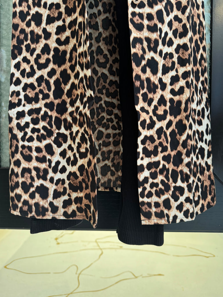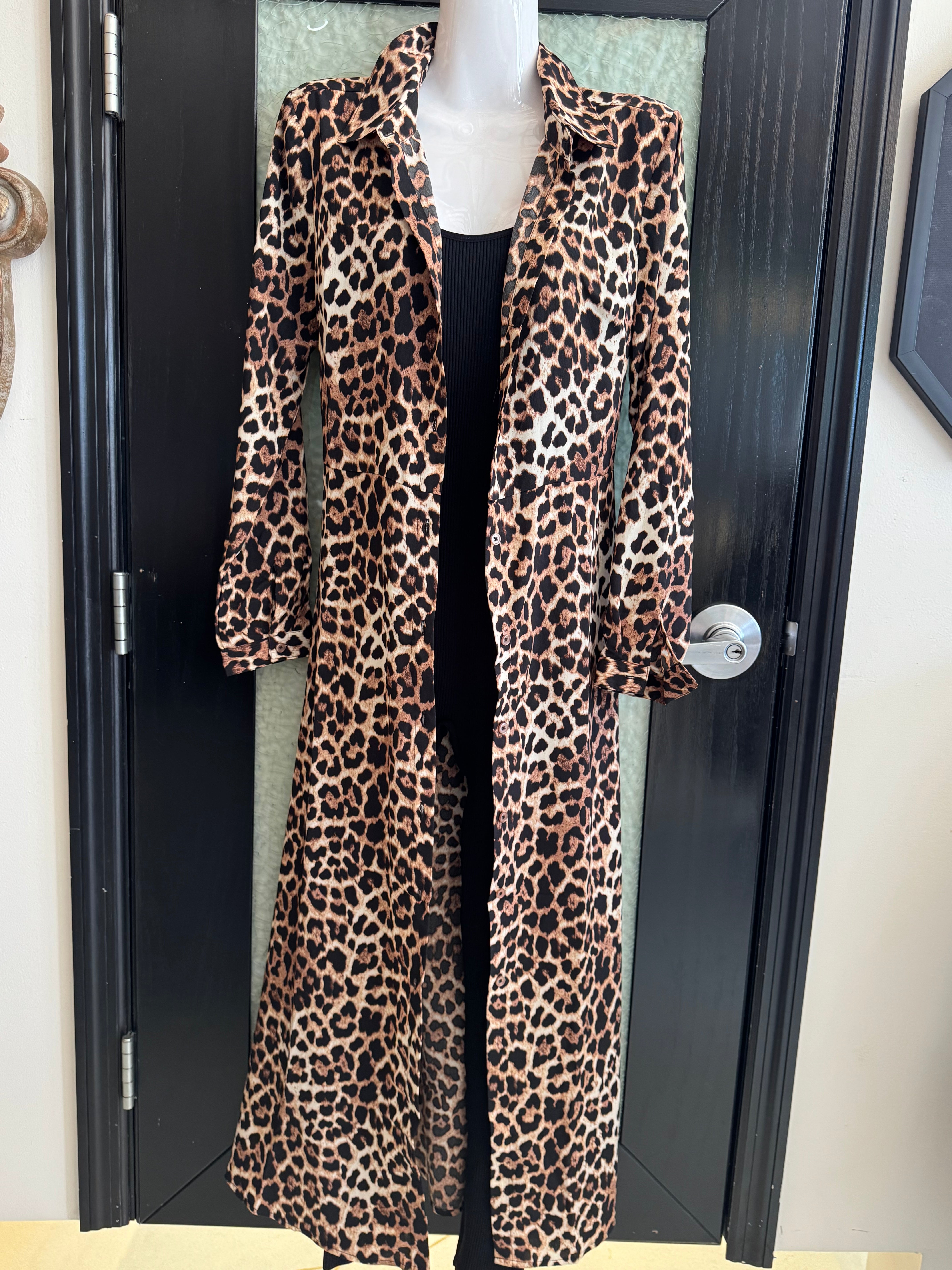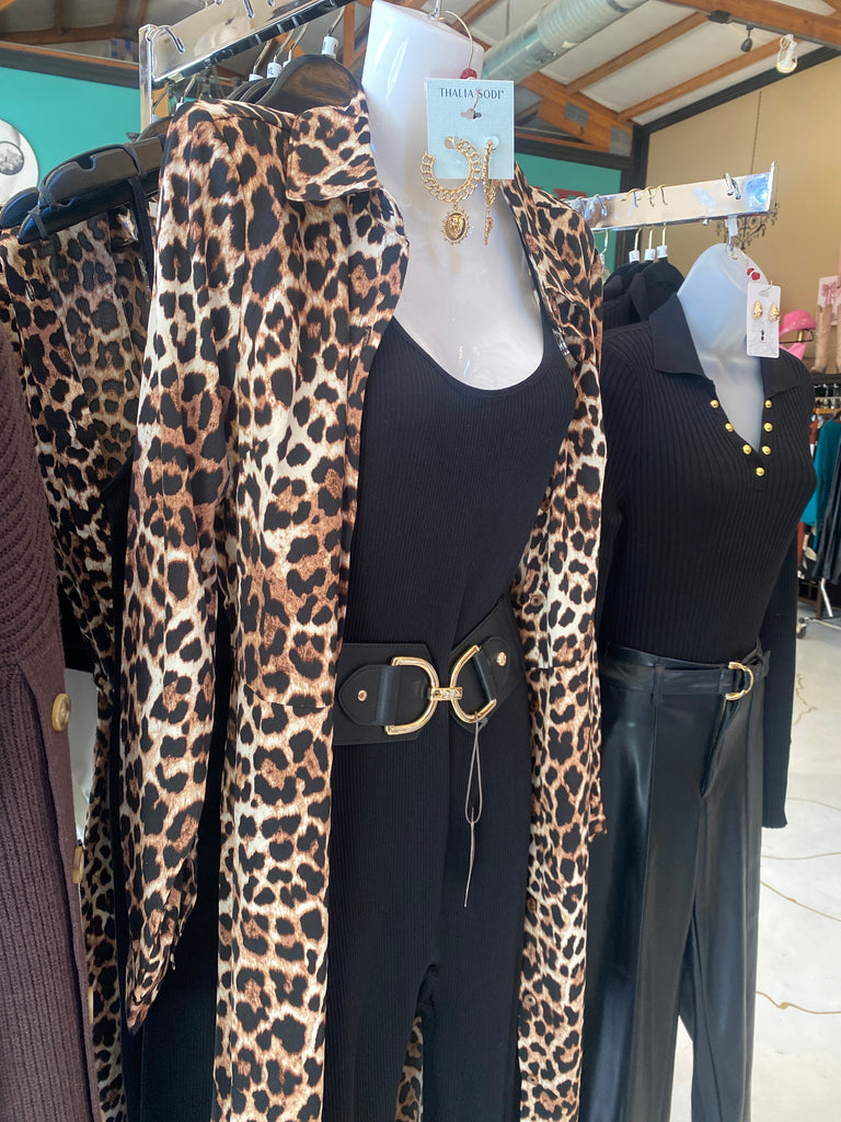 Unleash your wild side with the Leopard Duster by Harlow & Rose. This long, flowy duster will bring out your inner feline with its bold leopard print. This duster is also suitable as a dress featuring a button up design and waist tie! Perfect for adding a playful touch to any outfit, you'll be sure to turn heads in this statement piece. (Meow!)