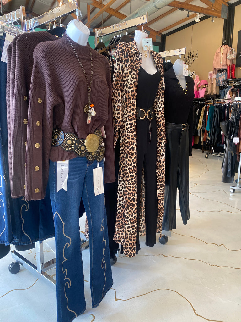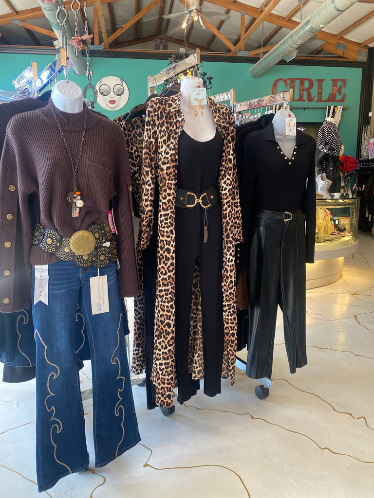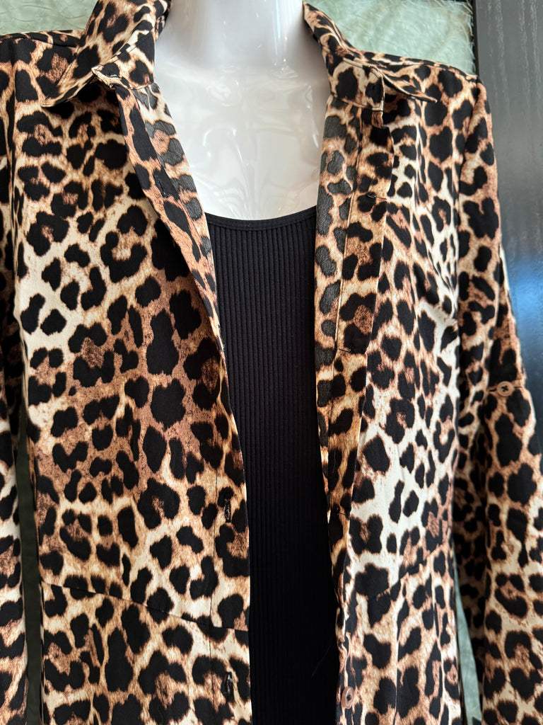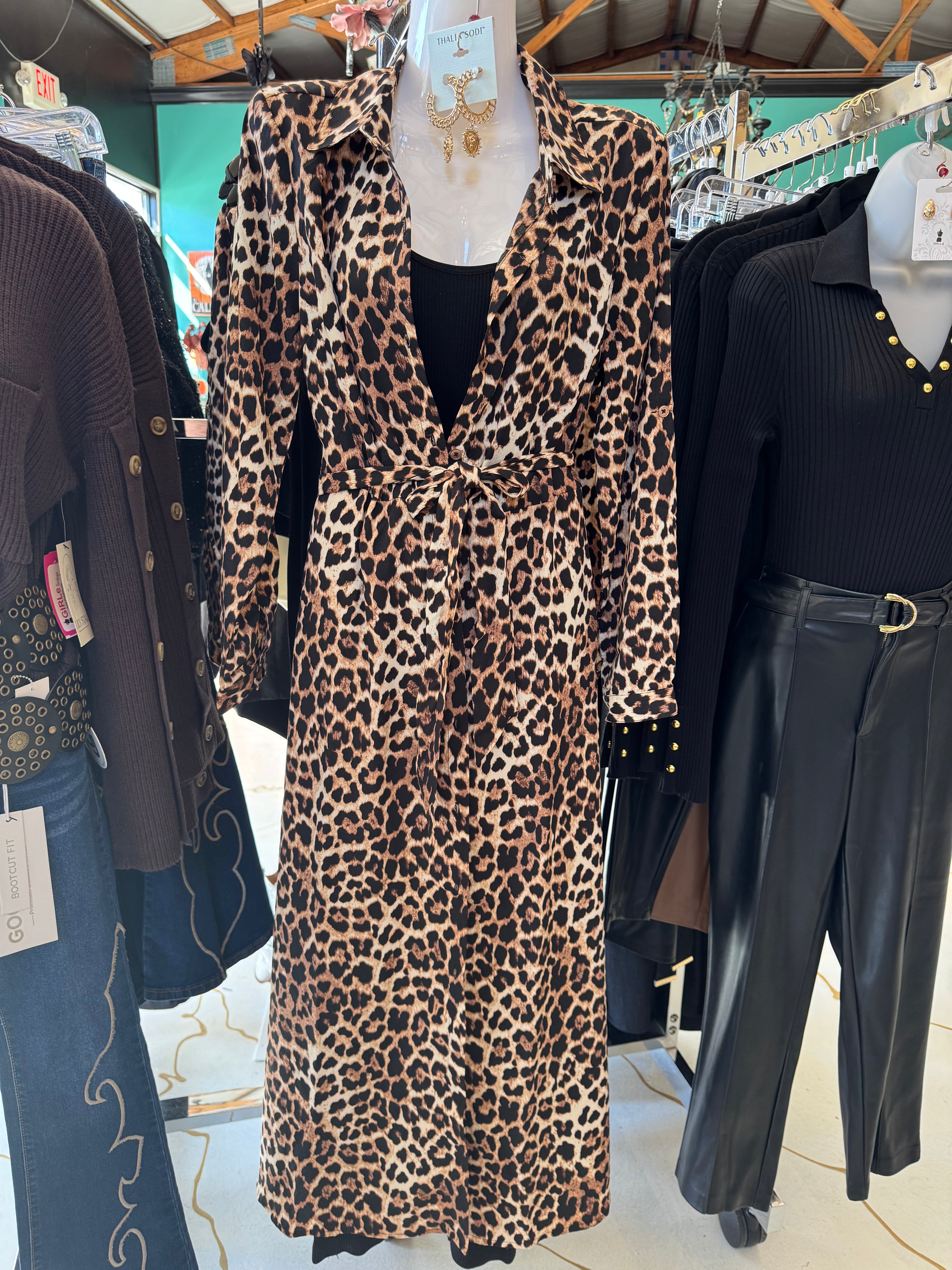 Unleash your wild side with the Leopard Duster by Harlow & Rose. This long, flowy duster will bring out your inner feline with its bold leopard print. This duster is also suitable as a dress featuring a button up design and waist tie! Perfect for adding a playful touch to any outfit, you'll be sure to turn heads in this statement piece. (Meow!)