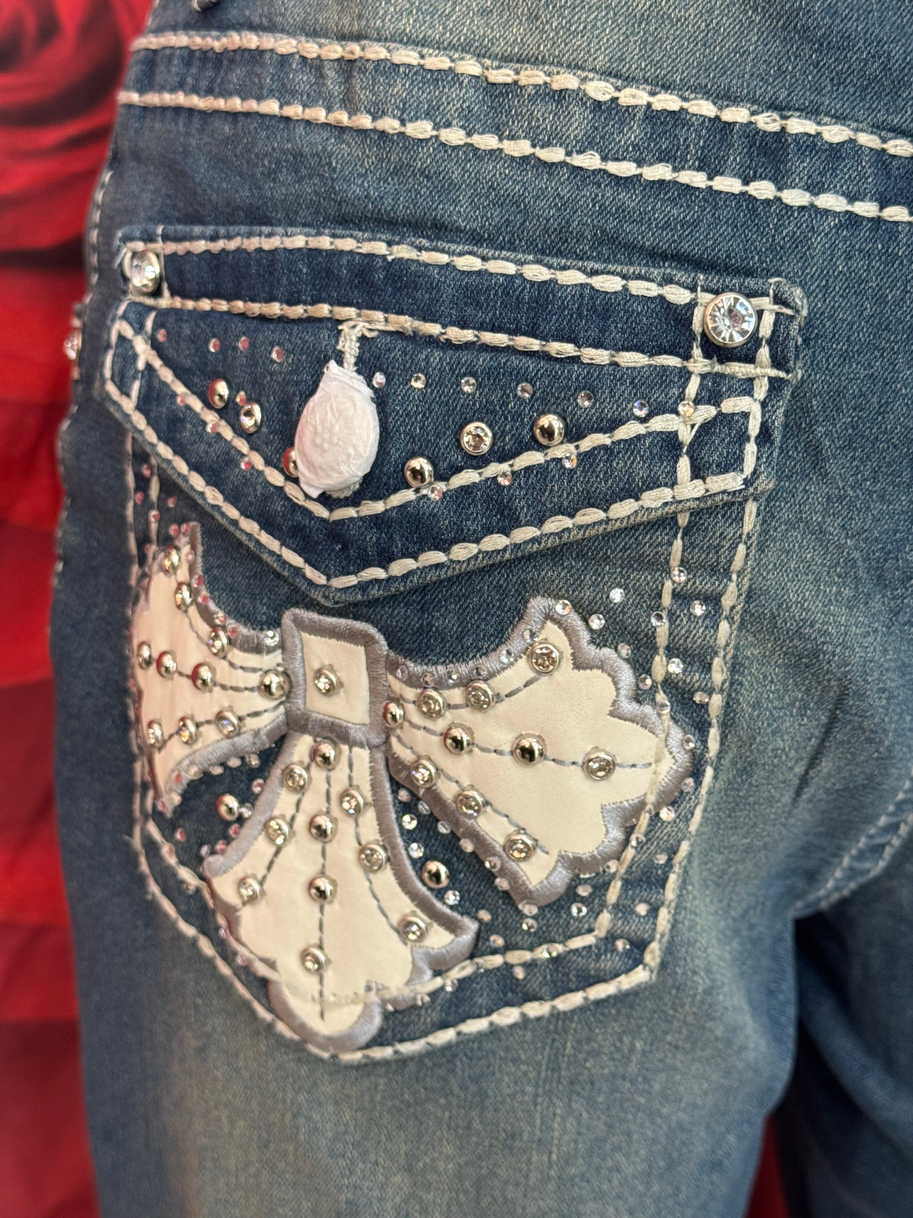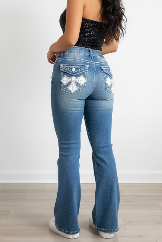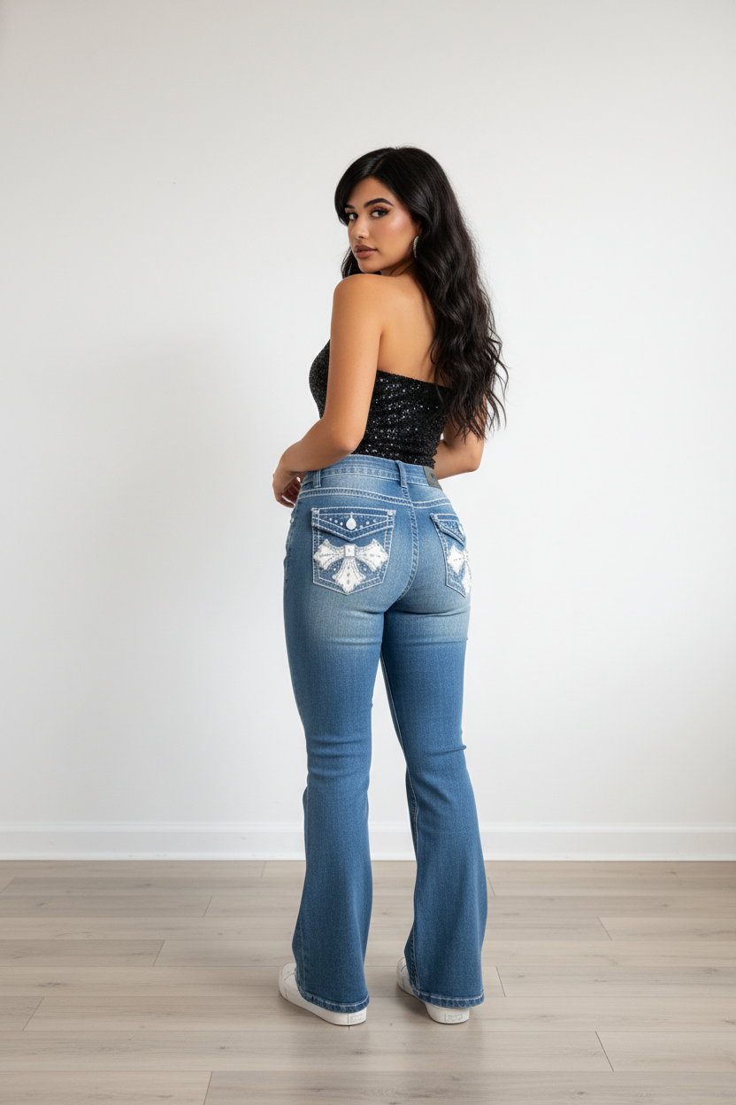 Introducing the Stone Pocket Bootcut Jeans by Sky! These sassy jeans come bedazzled with dazzling stones and cheeky embroidery on the back pocket—perfect for giving your derrière the spotlight it deserves! With a bootcut design, they pair well with everything from boots to flip-flops (yep, we went there). Step out in style and let those stones sparkle!