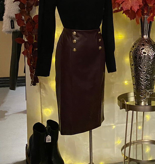 This sophisticated Wine Pleather Skirt by Carole Wren features luxurious pleather material and elegant gold buttons. The perfect addition to any wardrobe, this skirt exudes style and sophistication. Elevate your look with this must-have piece.