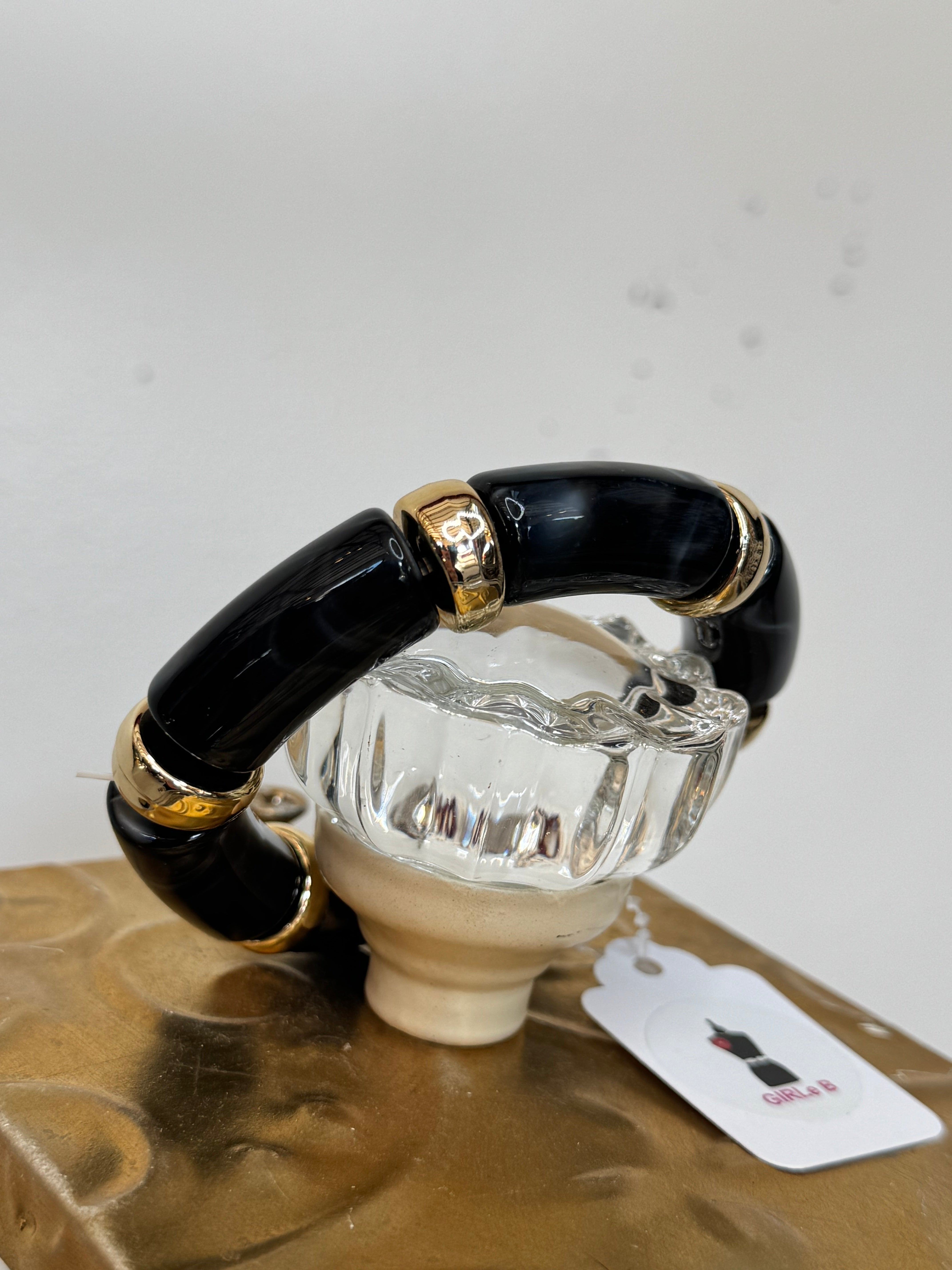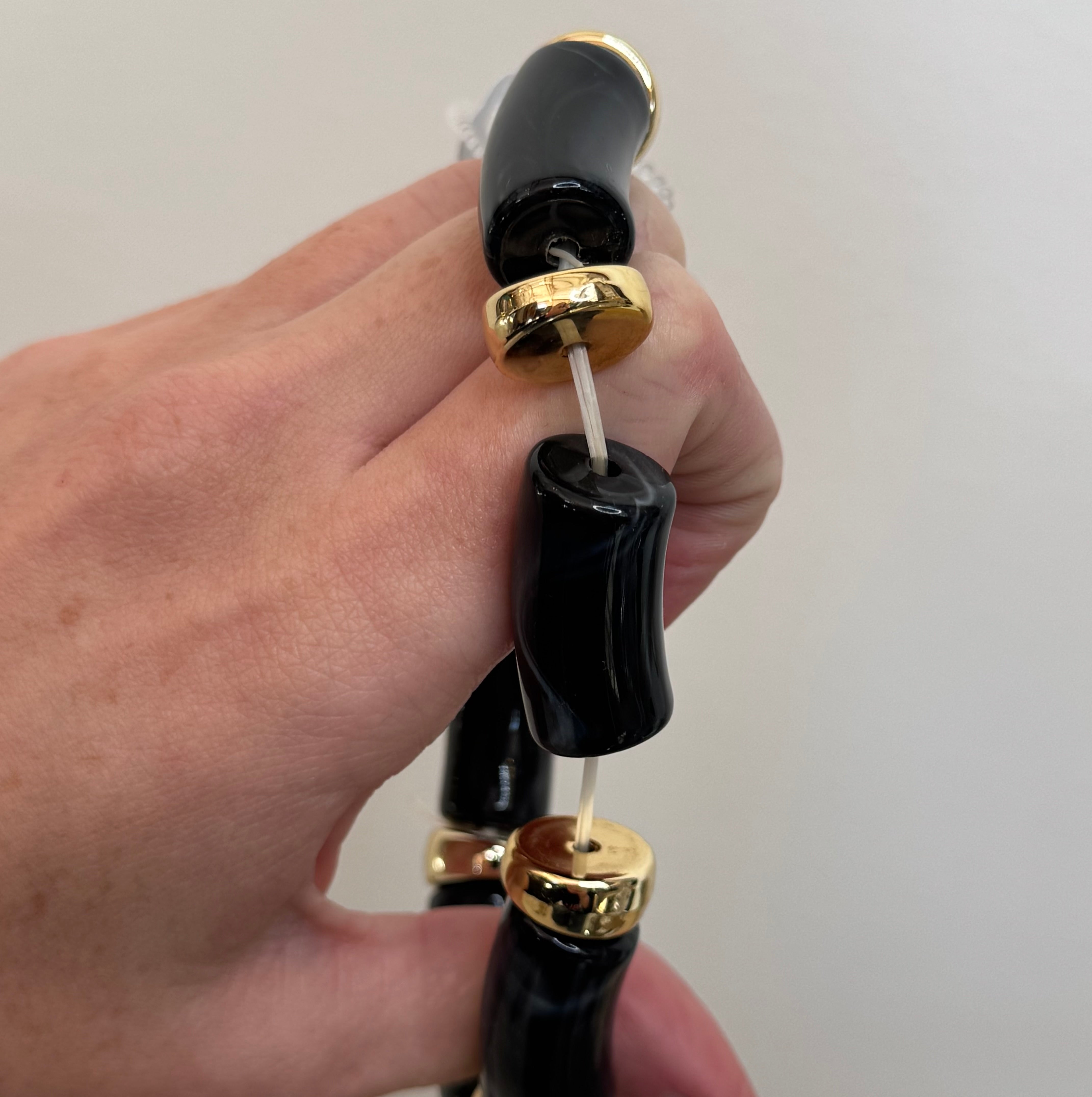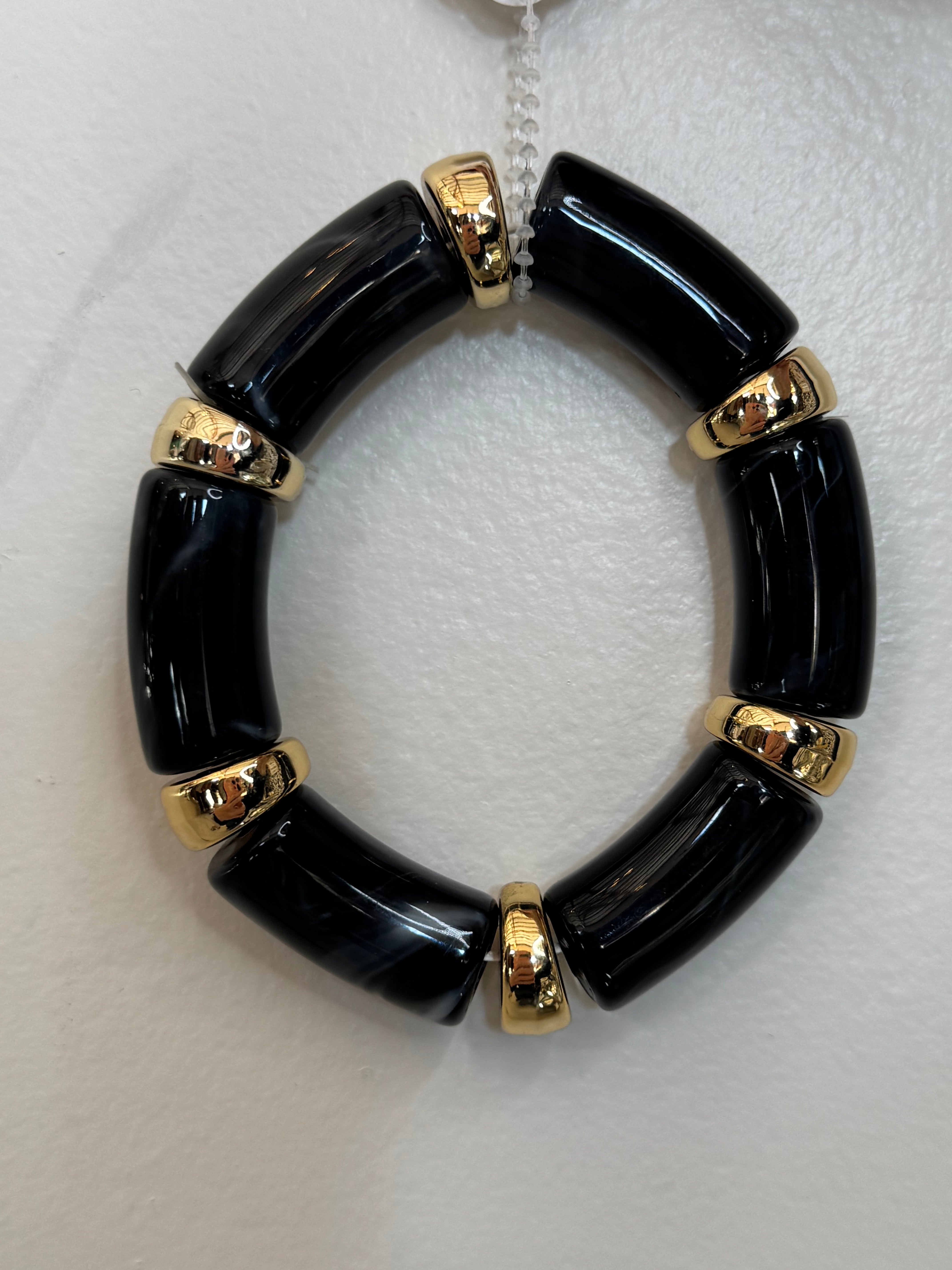 This simple yet stylish bracelet by Natasha is a staple piece. The bracelet features a stretchy design with Gold & Black Acrylic!