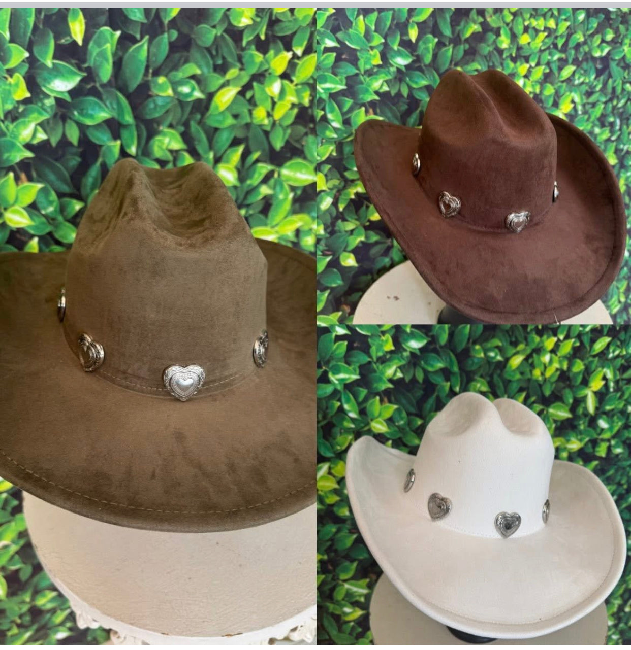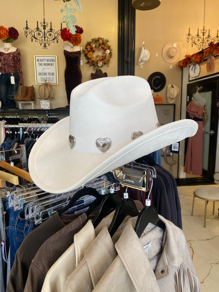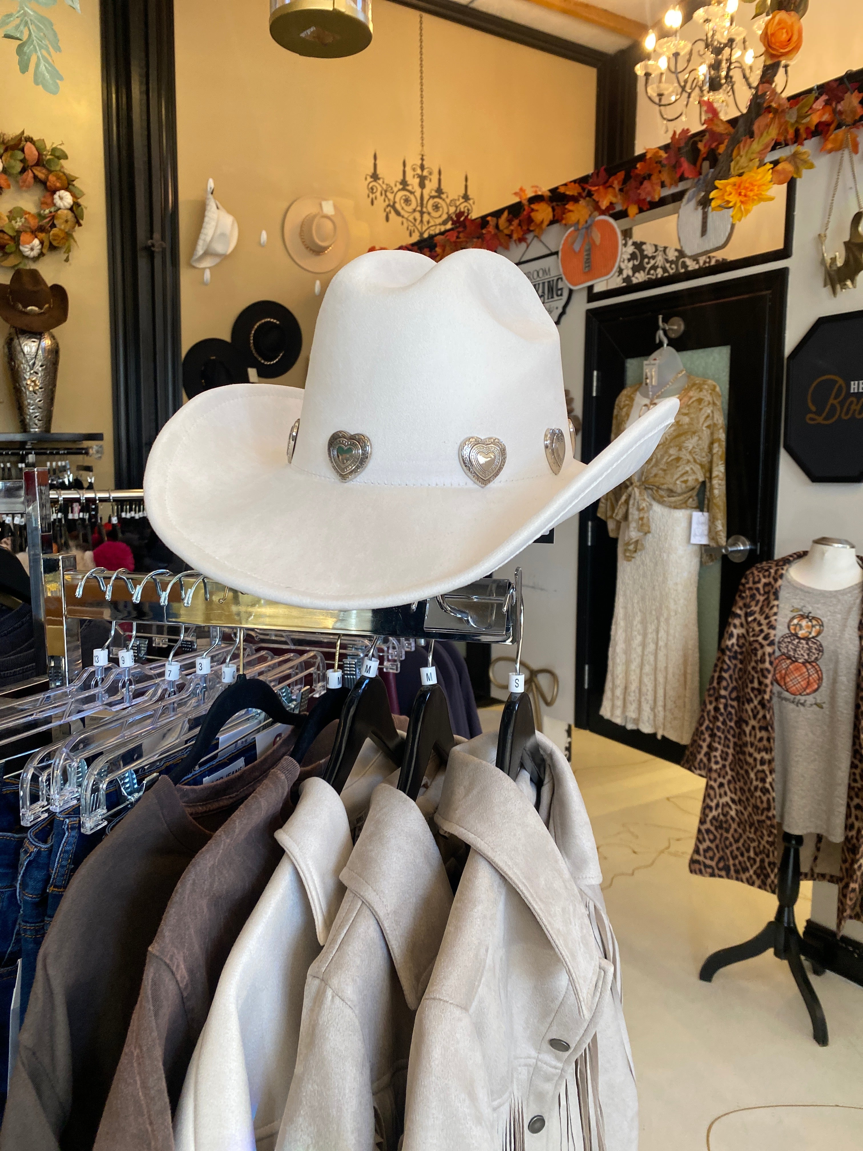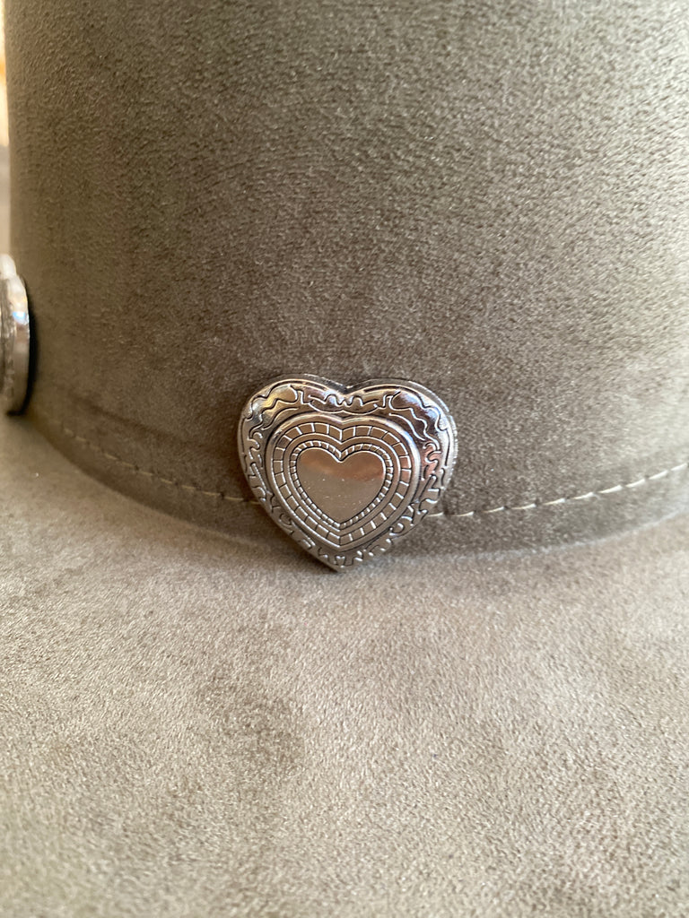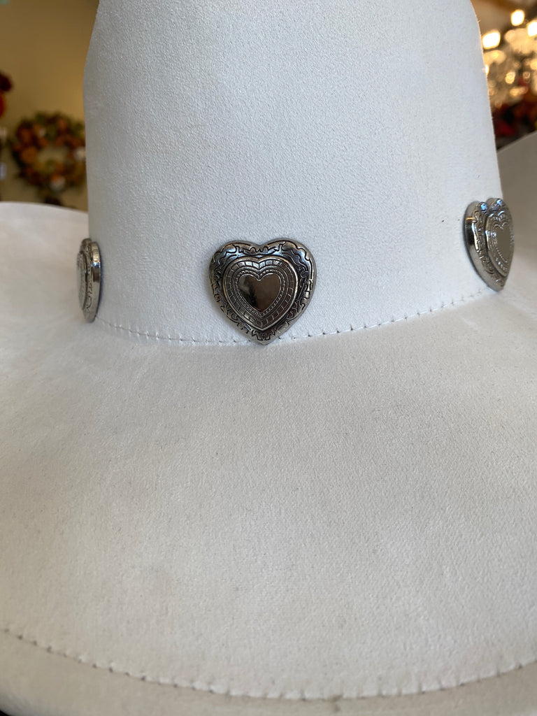 Saddle up and look effortlessly stylish with this Silver Heart Concho Cowgirl Hat By Illuma. Featuring large heart-shaped silver studs, it's the perfect mix of edgy and sweet. Stay cool and chic all day long with this must-have cowgirl hat.
