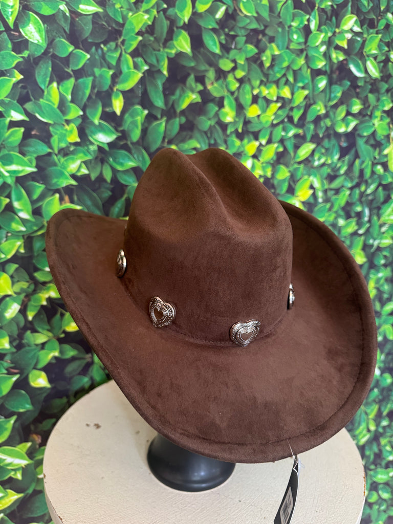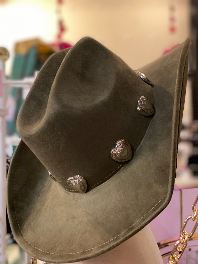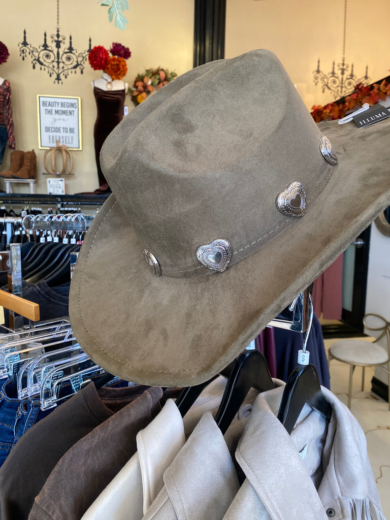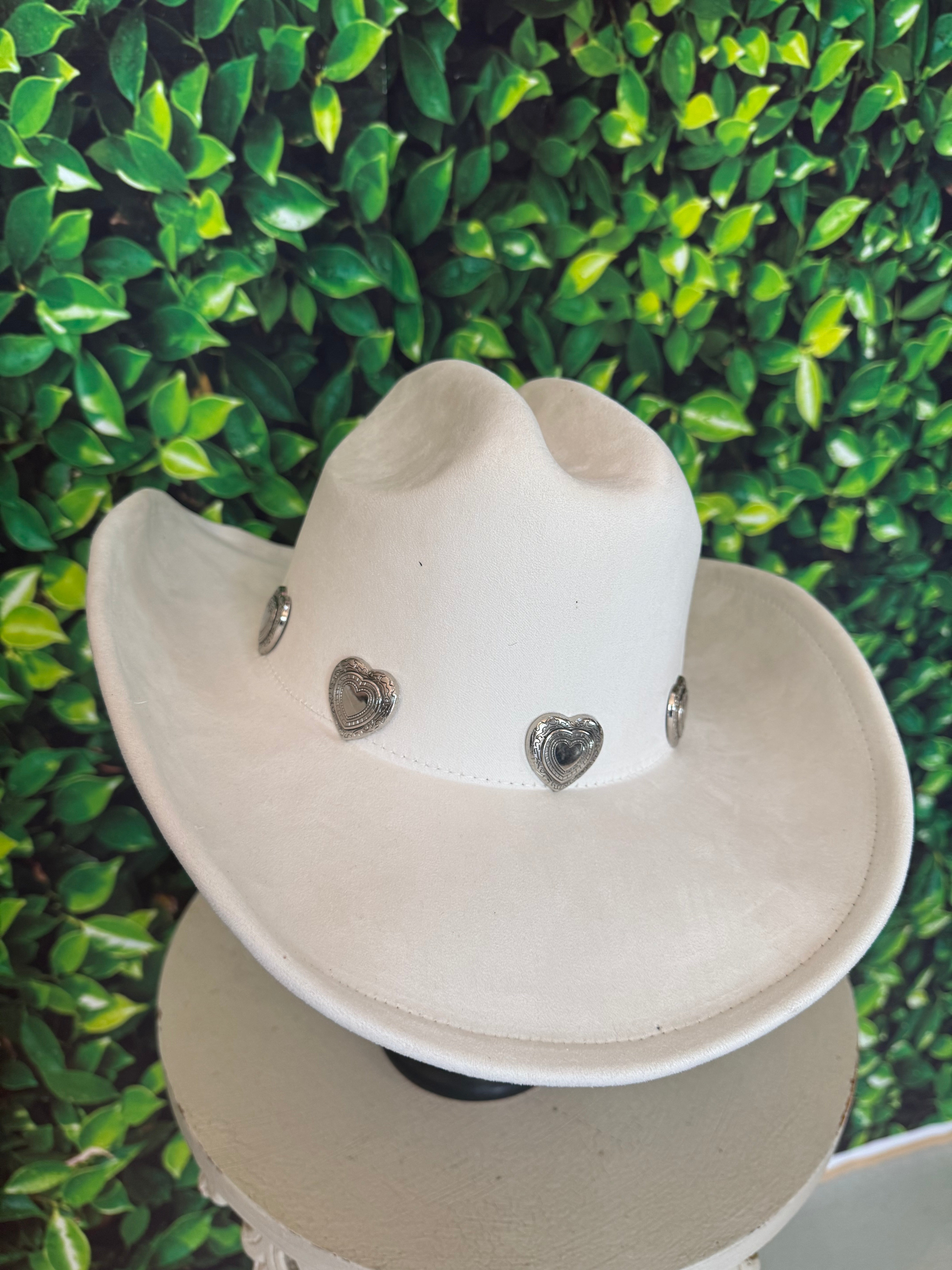 Saddle up and look effortlessly stylish with this Silver Heart Concho Cowgirl Hat By Illuma. Featuring large heart-shaped silver studs, it's the perfect mix of edgy and sweet. Stay cool and chic all day long with this must-have cowgirl hat.