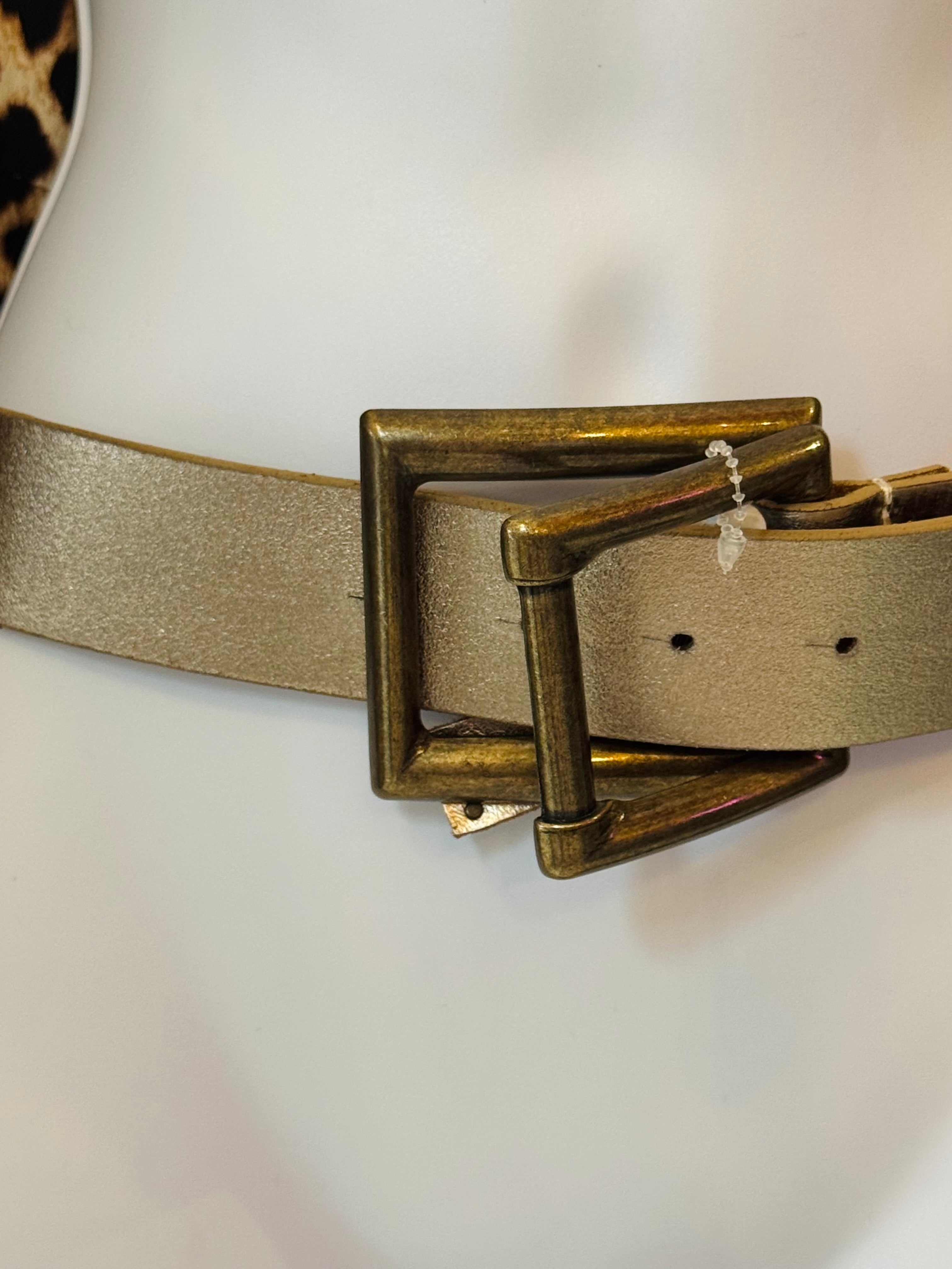 The Gold Belt by Free People features a distinctive double buckle design crafted for both style and versatility. Its metallic finish enhances various outfits while providing secure adjustments. This belt effectively combines aesthetic appeal with functional use, making it a valuable addition to any wardrobe.