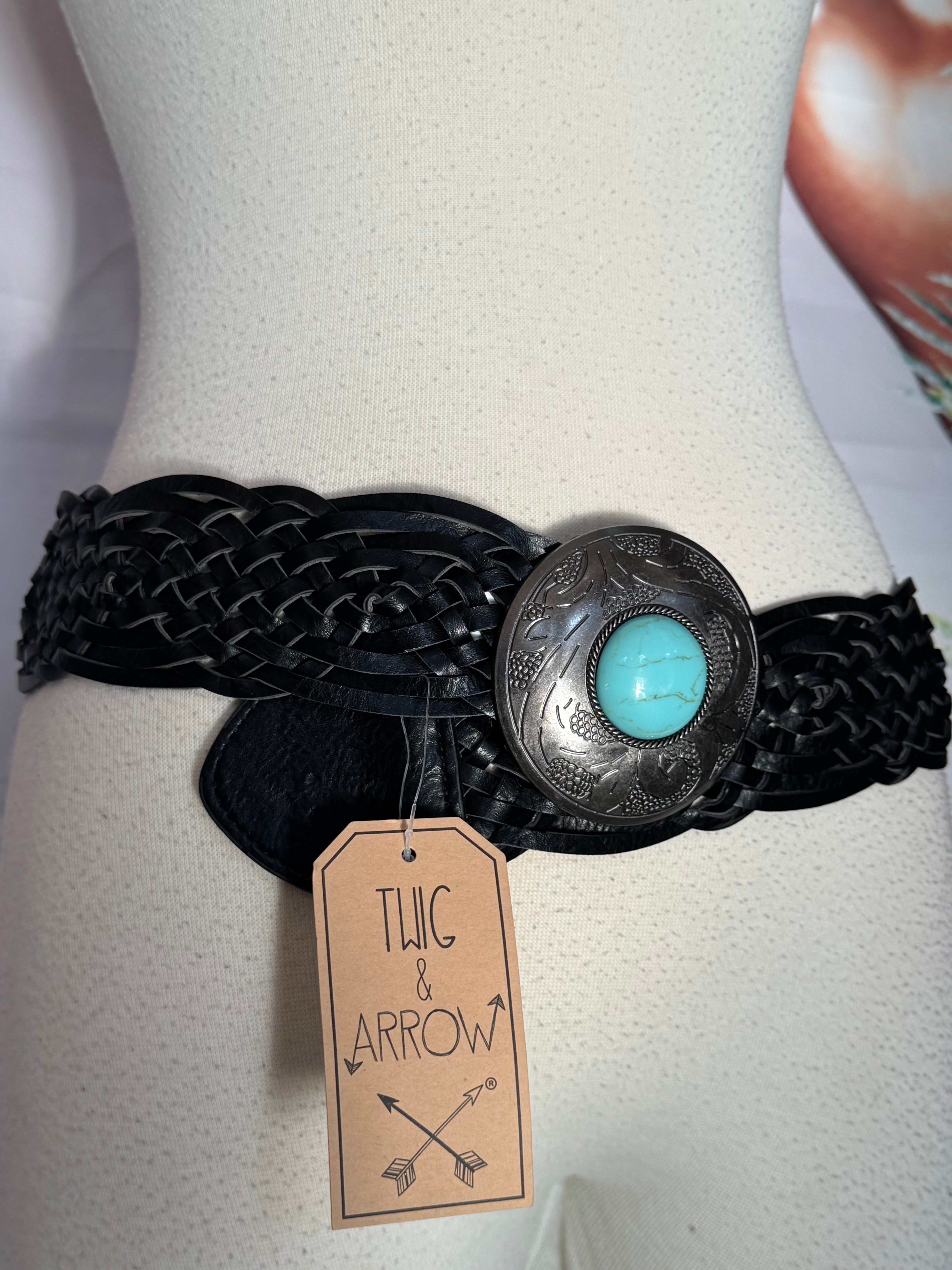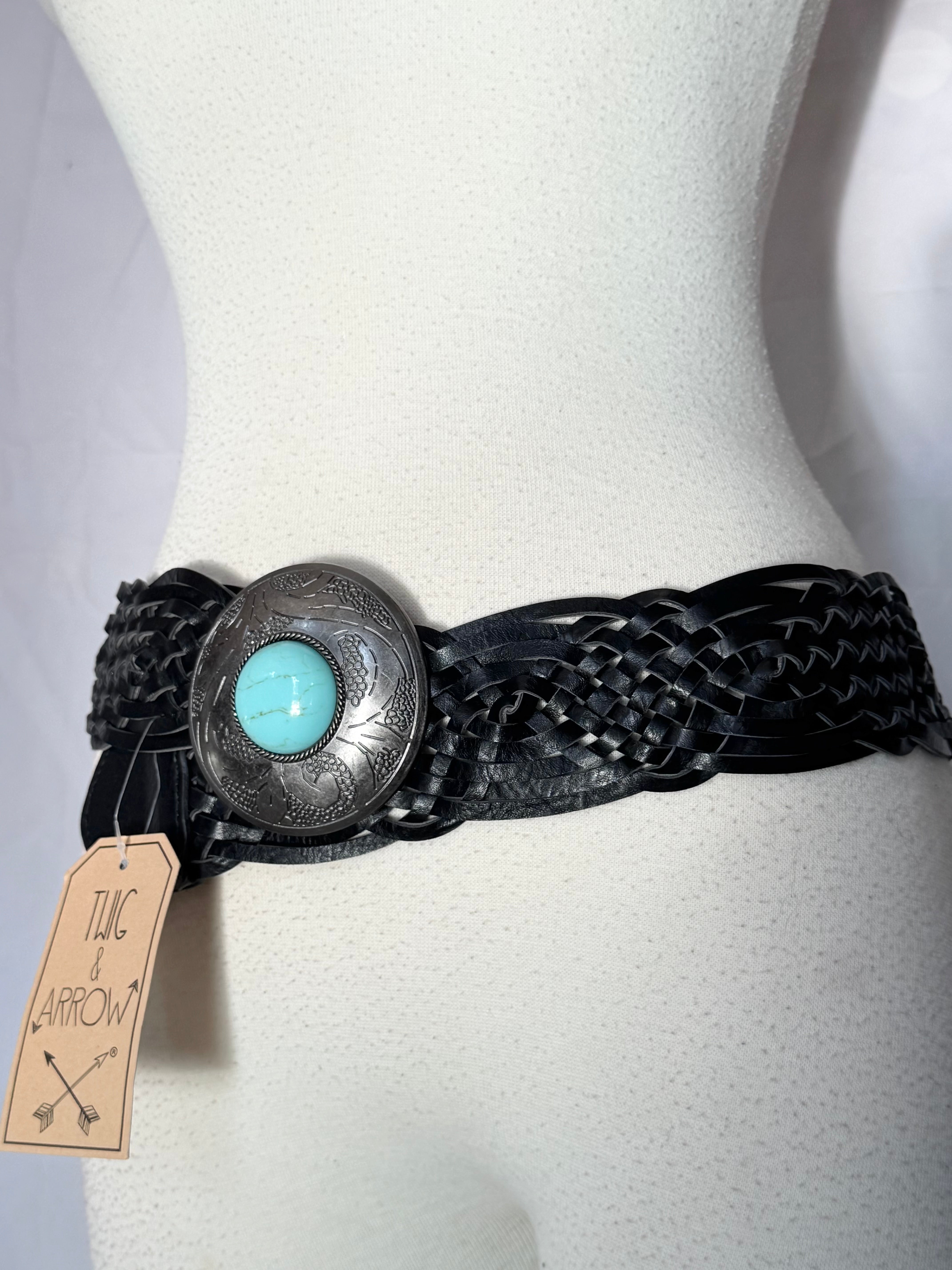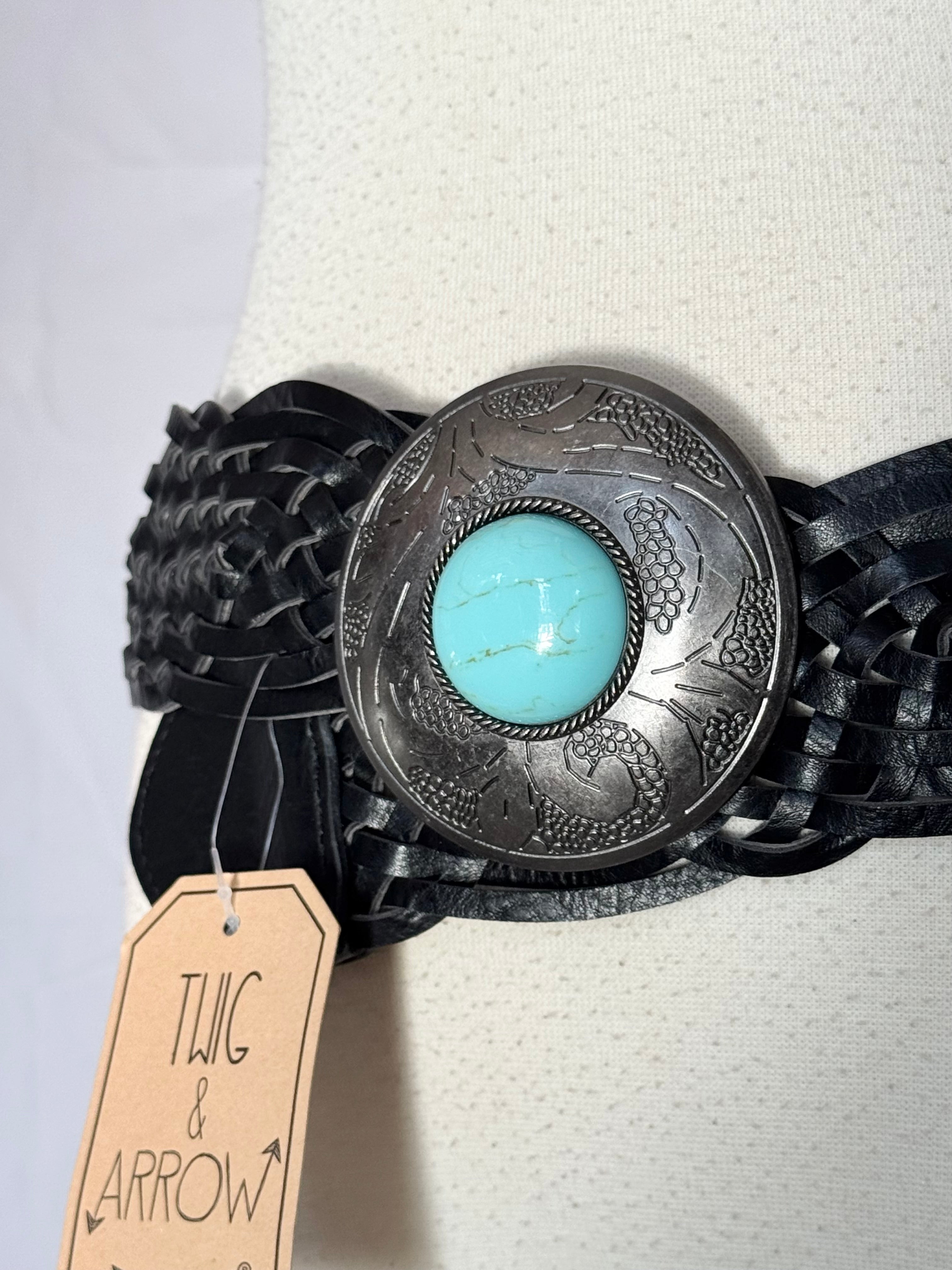 This Large Stone Black Belt by Arrow features a beautiful rope-style latch and a large turquoise stone. Made with high-quality materials, it adds a touch of elegance and sophistication to any outfit. Perfect for both casual and formal occasions, this belt is a must-have for any fashion-forward individual.