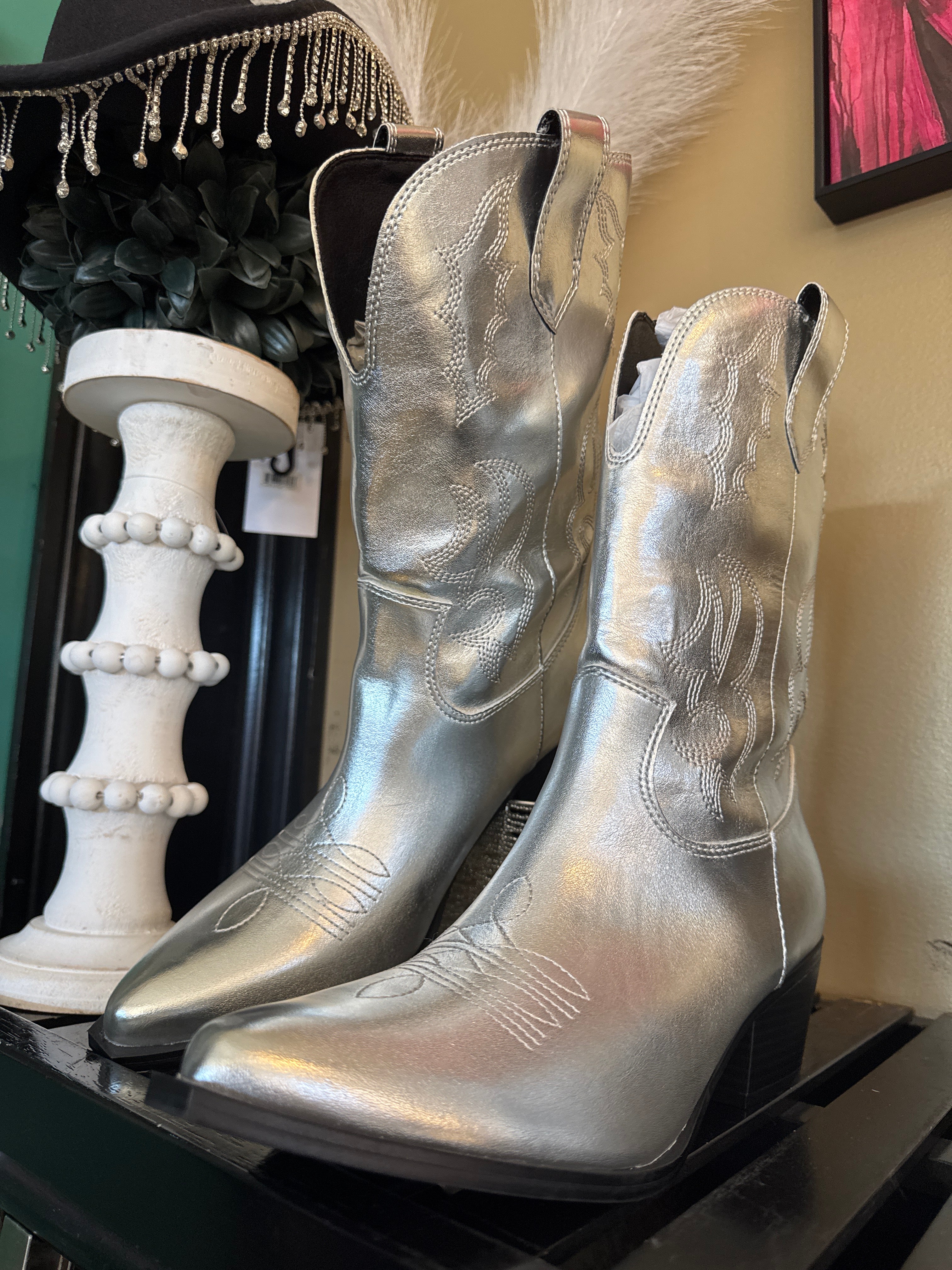 Get your feet shining with these Silver Cowgirl Boots by Indigo. These boots are perfect for adding a touch of fun and playfulness to your outfit while still getting the job done. Yee-haw! (2 exclamation points)