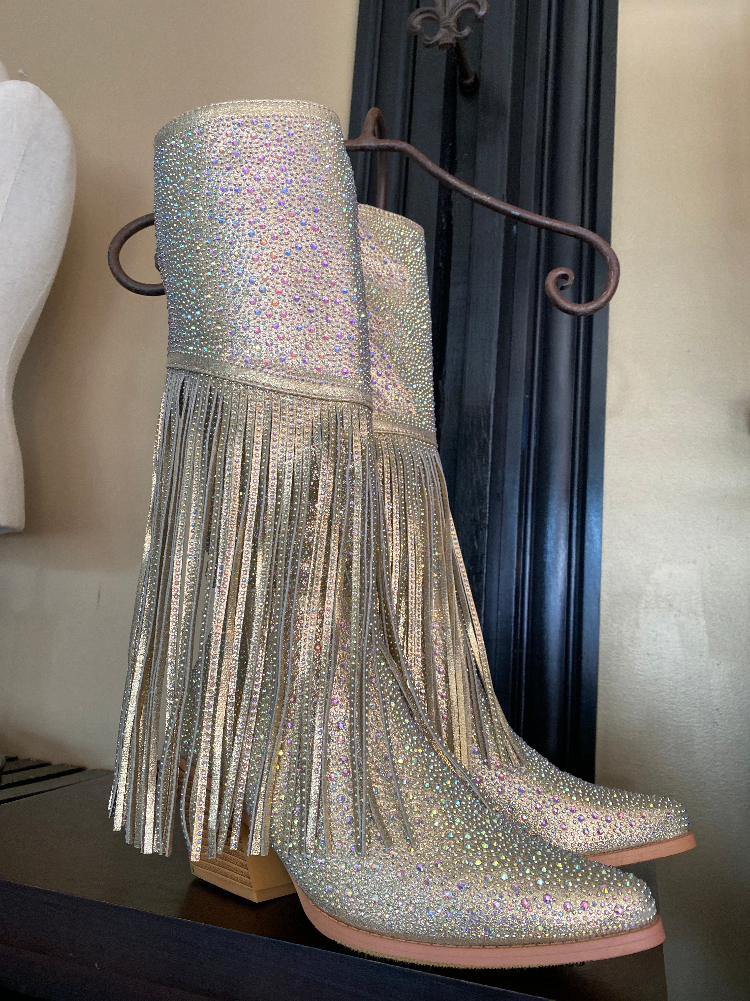 Strut your style with these Stone Gold Tassle Boots by Forever. Complete with stone tassels, these boots add a touch of playfulness to your wardrobe. Dress them up or down, these boots will be a quirky addition to any outfit. (Tone: quirky, playful) Iridescent Stones