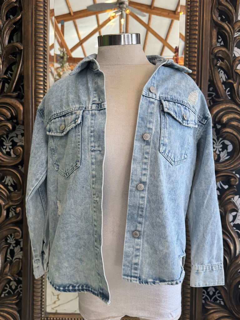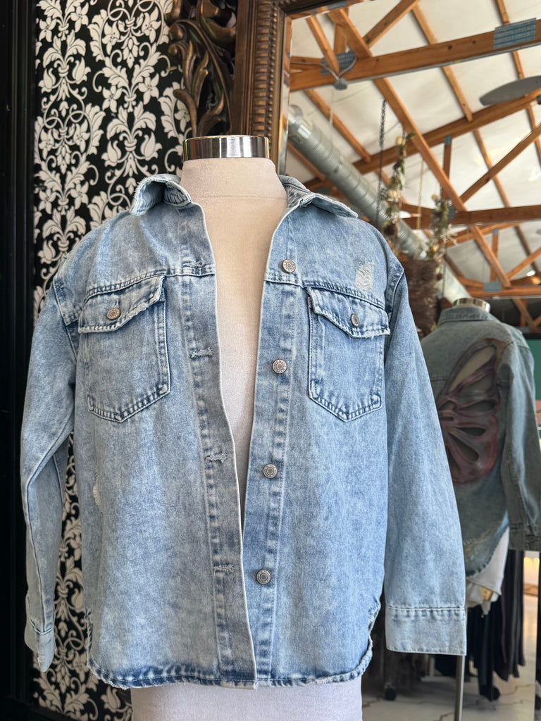 This Denim Butterfly Jacket by Judy March is expertly crafted with a unique butterfly cutout in the back. Made with high-quality denim, this jacket is both stylish and durable. Elevate your wardrobe with this one-of-a-kind piece and make a statement everywhere you go.