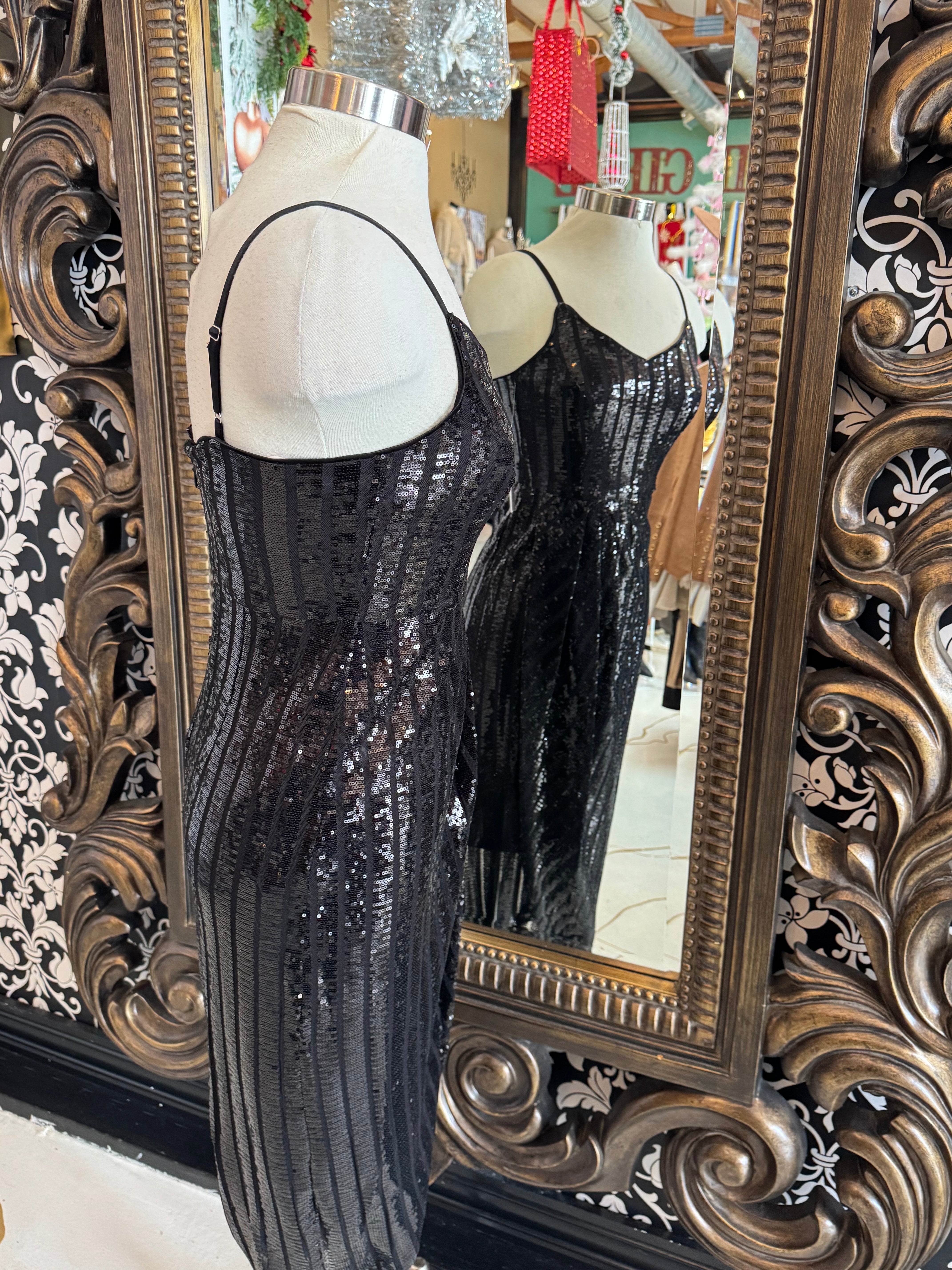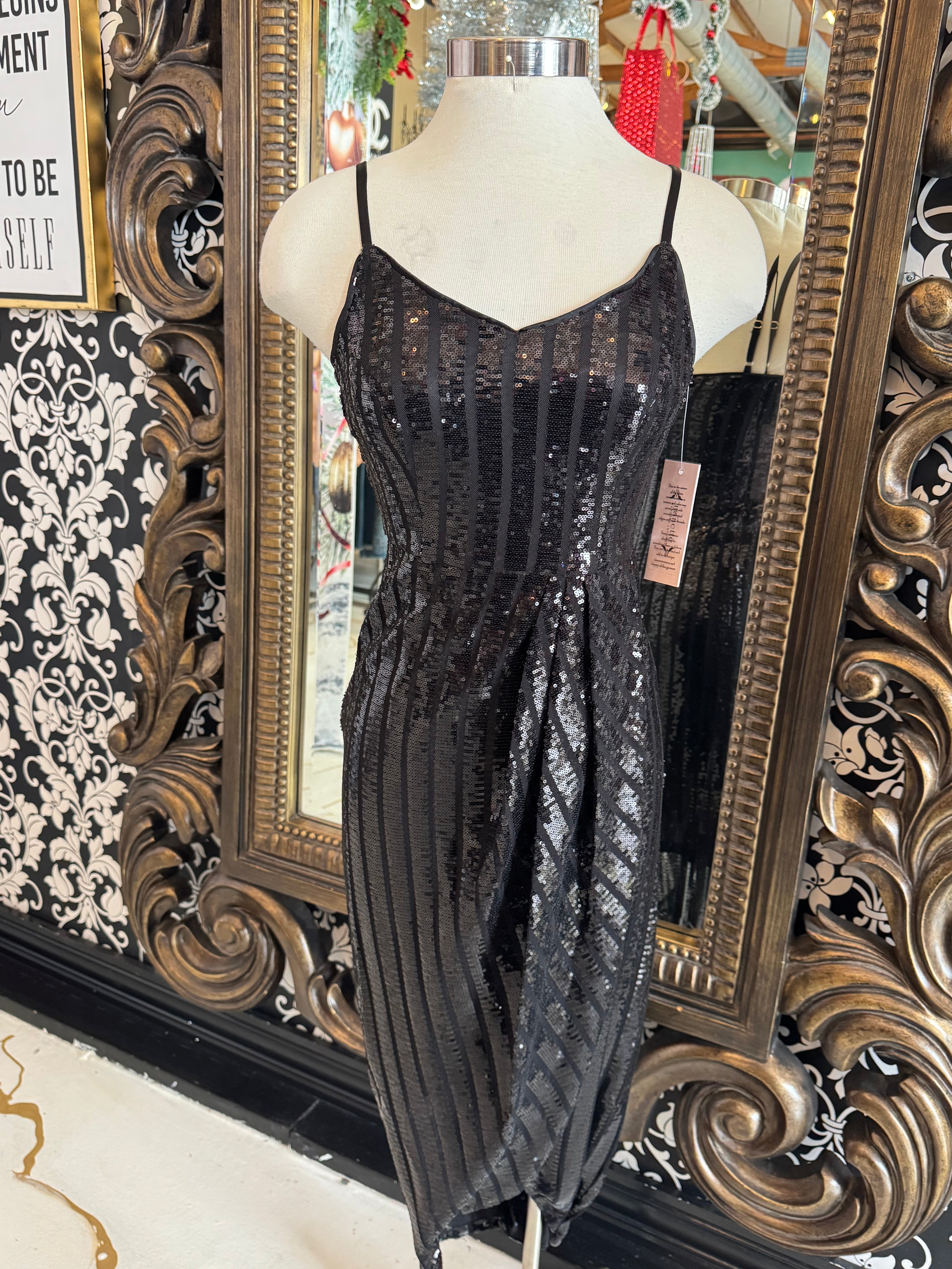 This elegant Sequin Black Dress by Nanette is perfect for any evening occasion. The black sequin dress features a stunning cross front design and is fully lined for a comfortable fit. The dress also includes a subtle under slit, adding a touch of sophistication. Elevate your style with this glamorous piece.