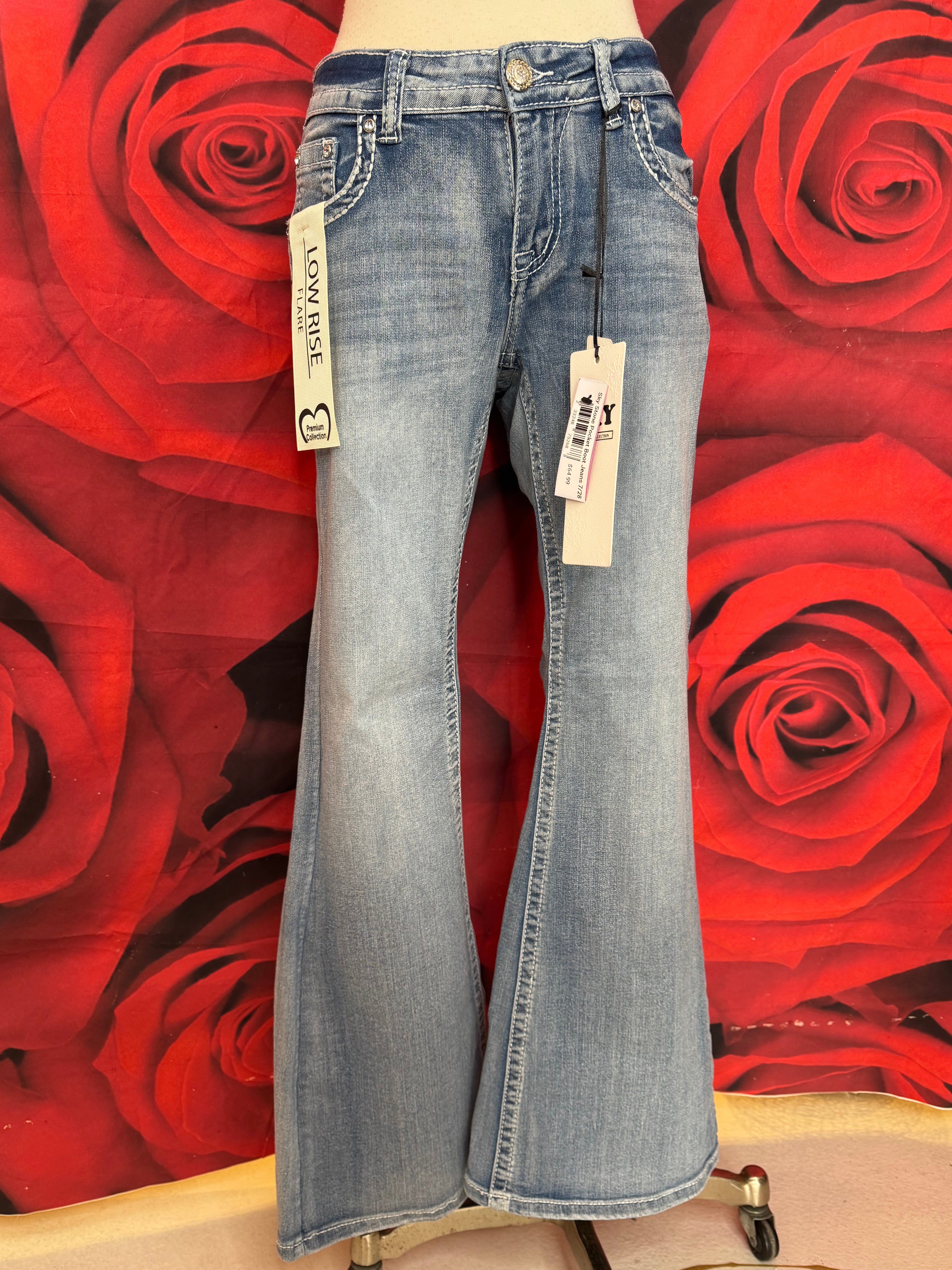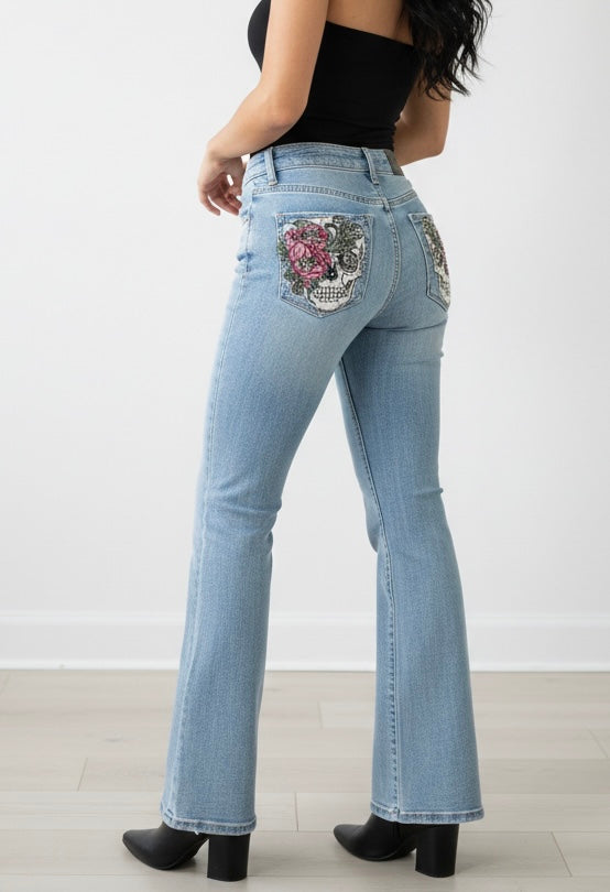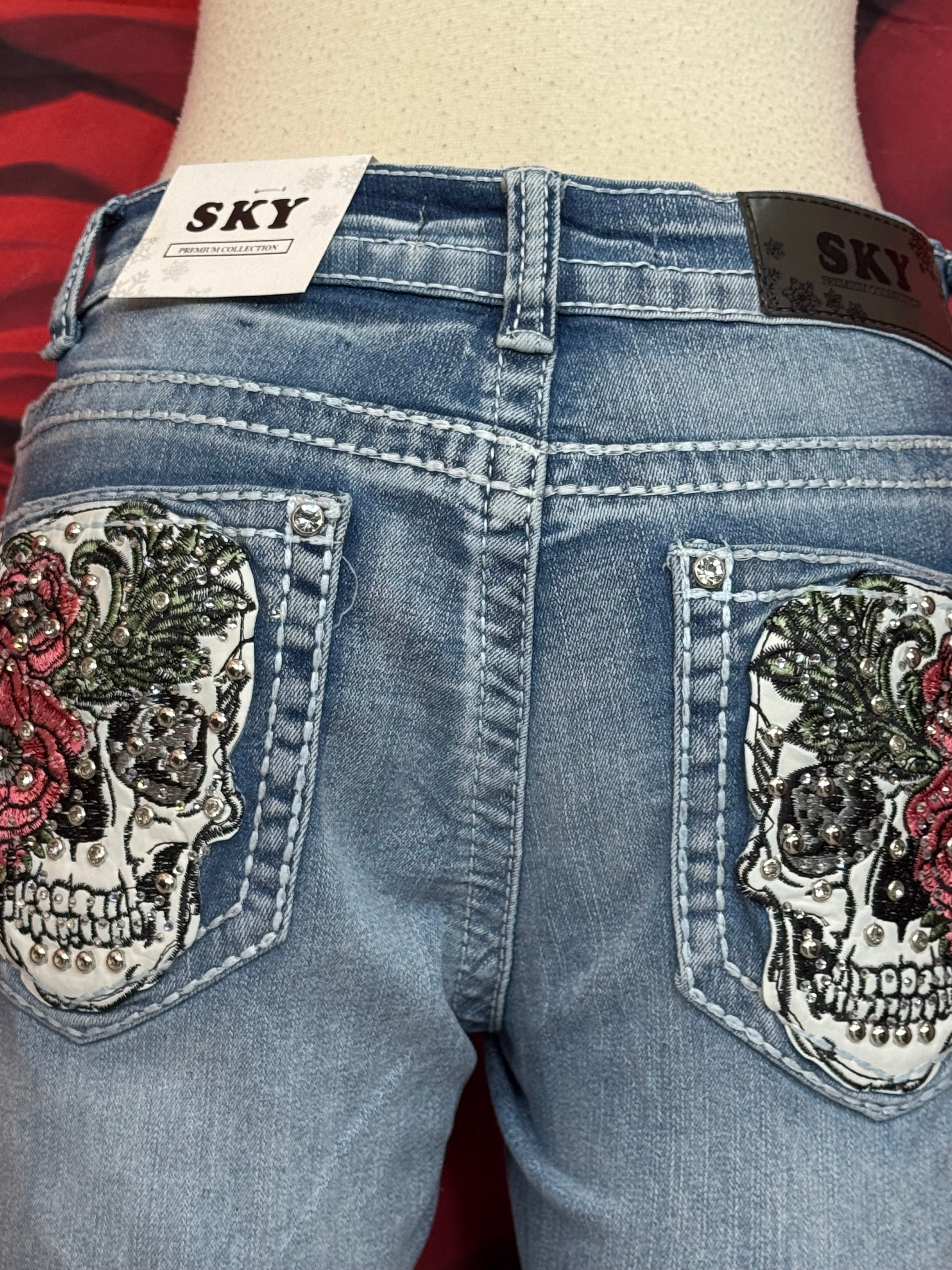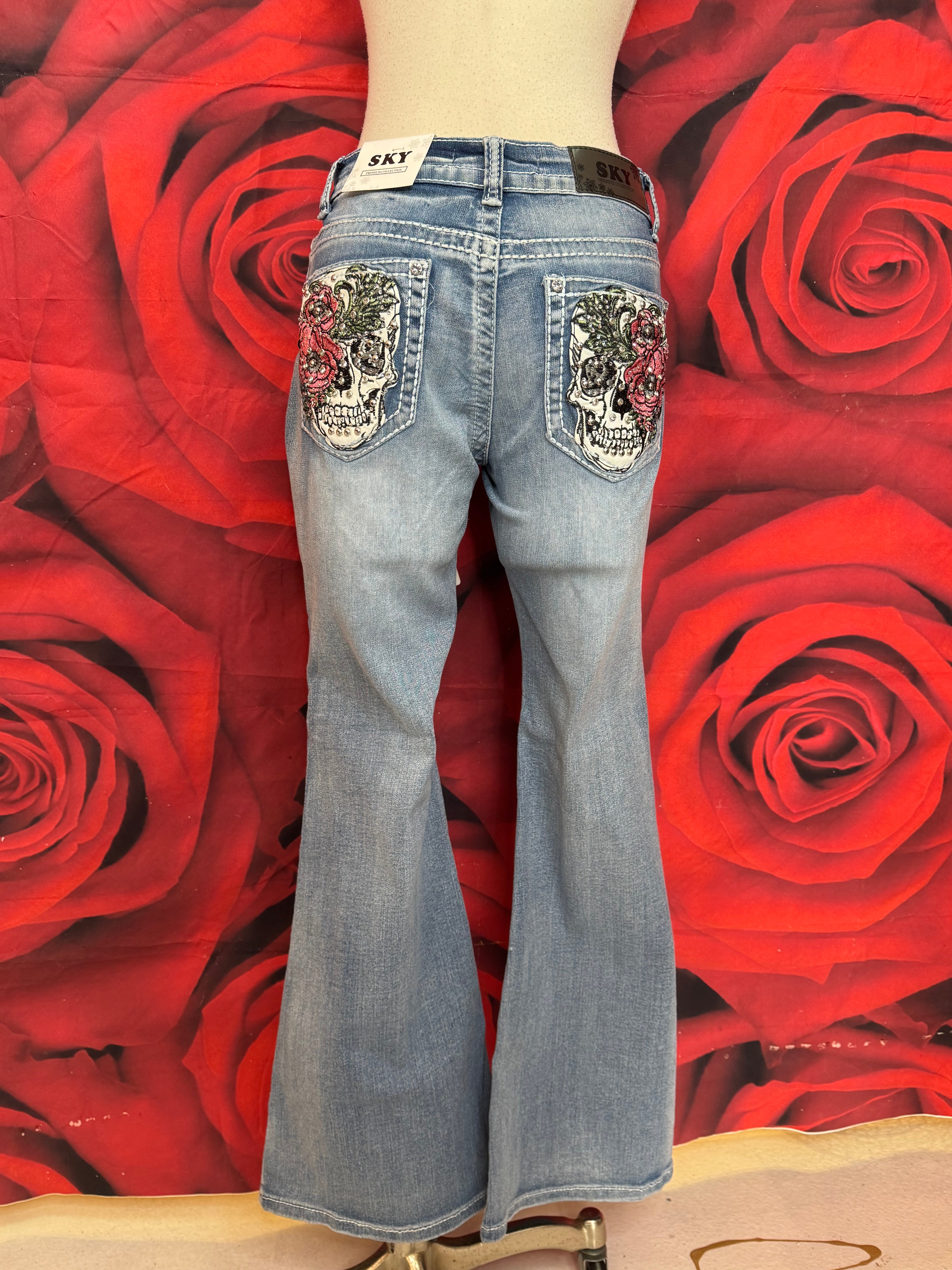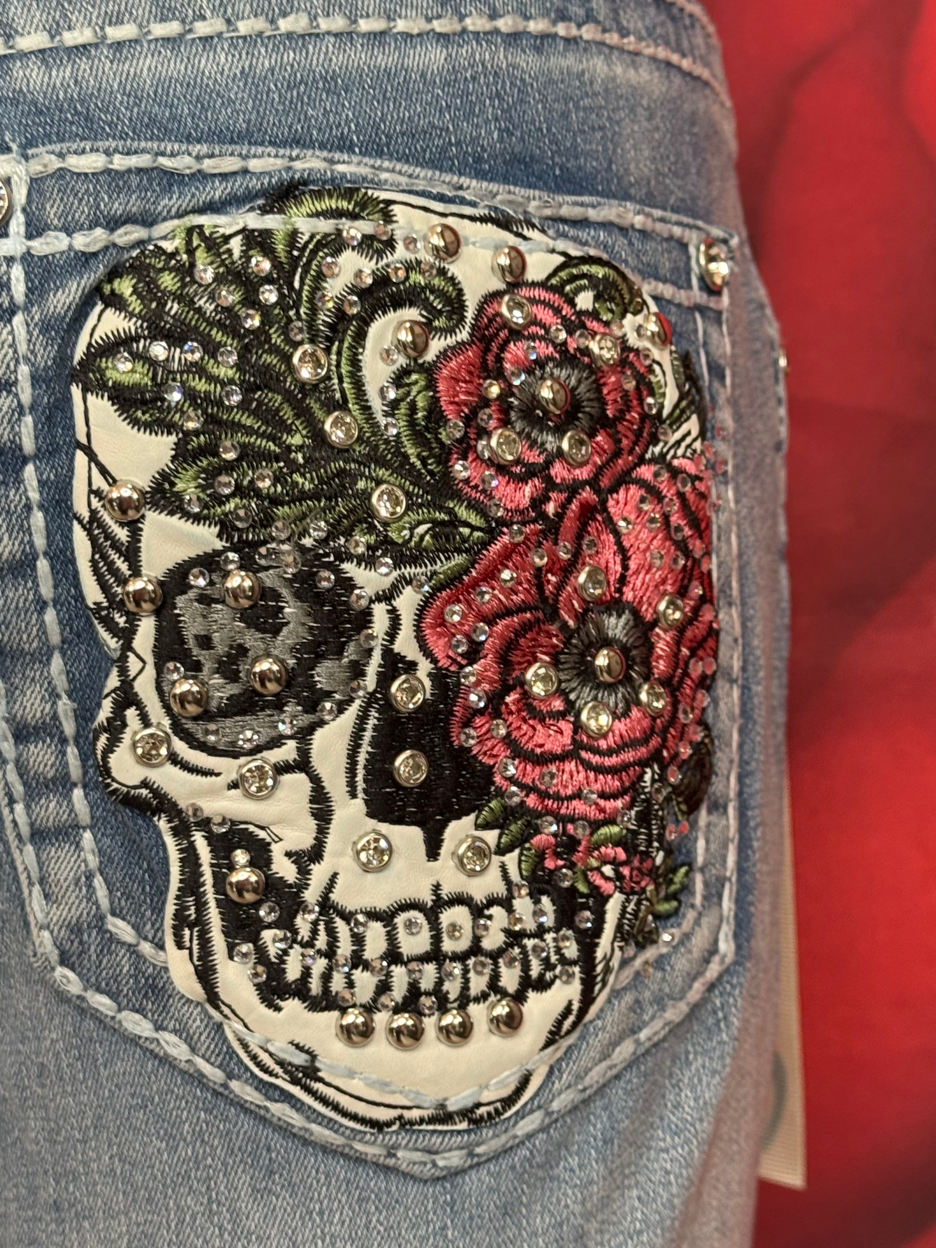Stone Pocket Jeans w/Skull & Flower Design By Sky