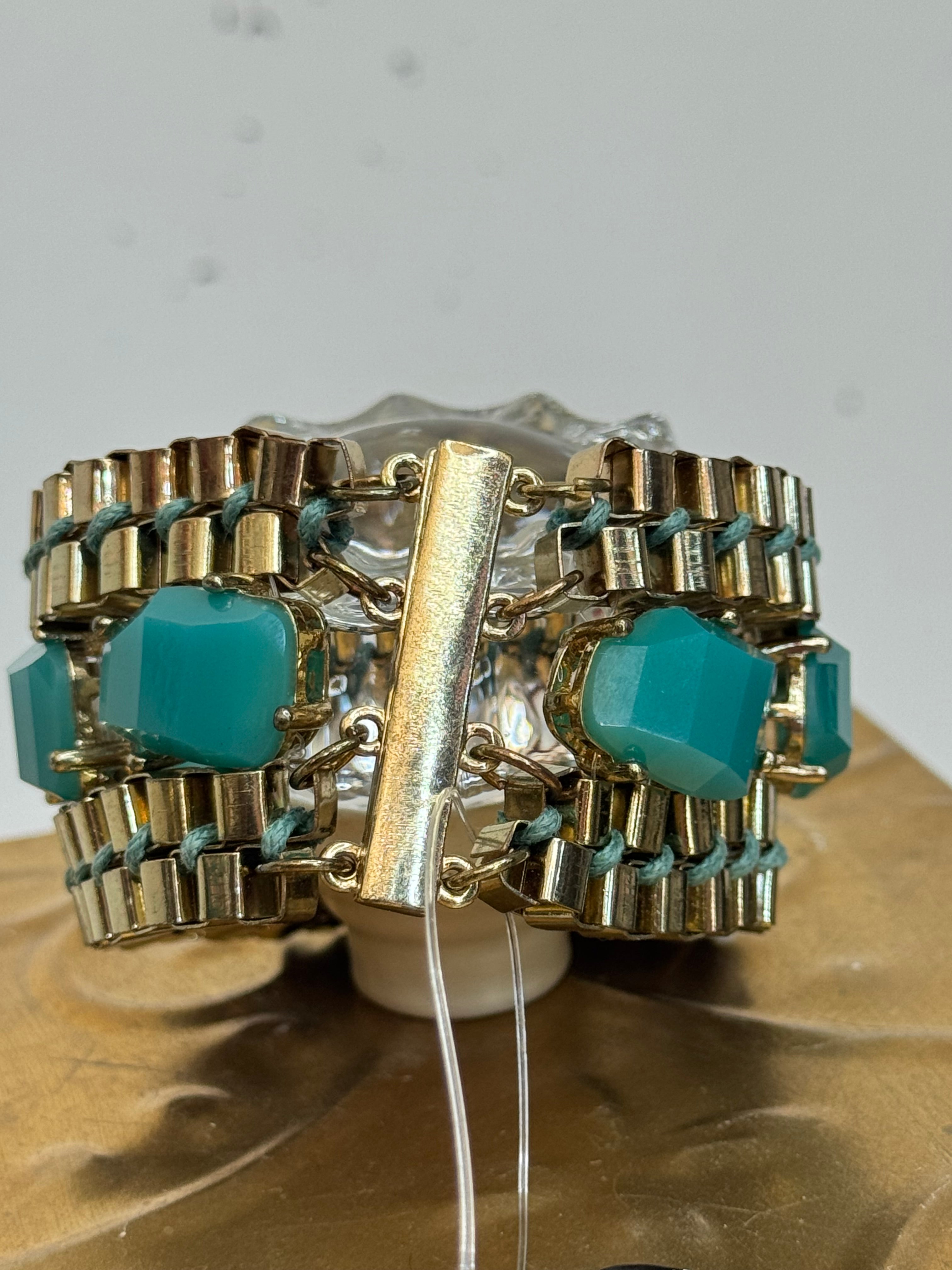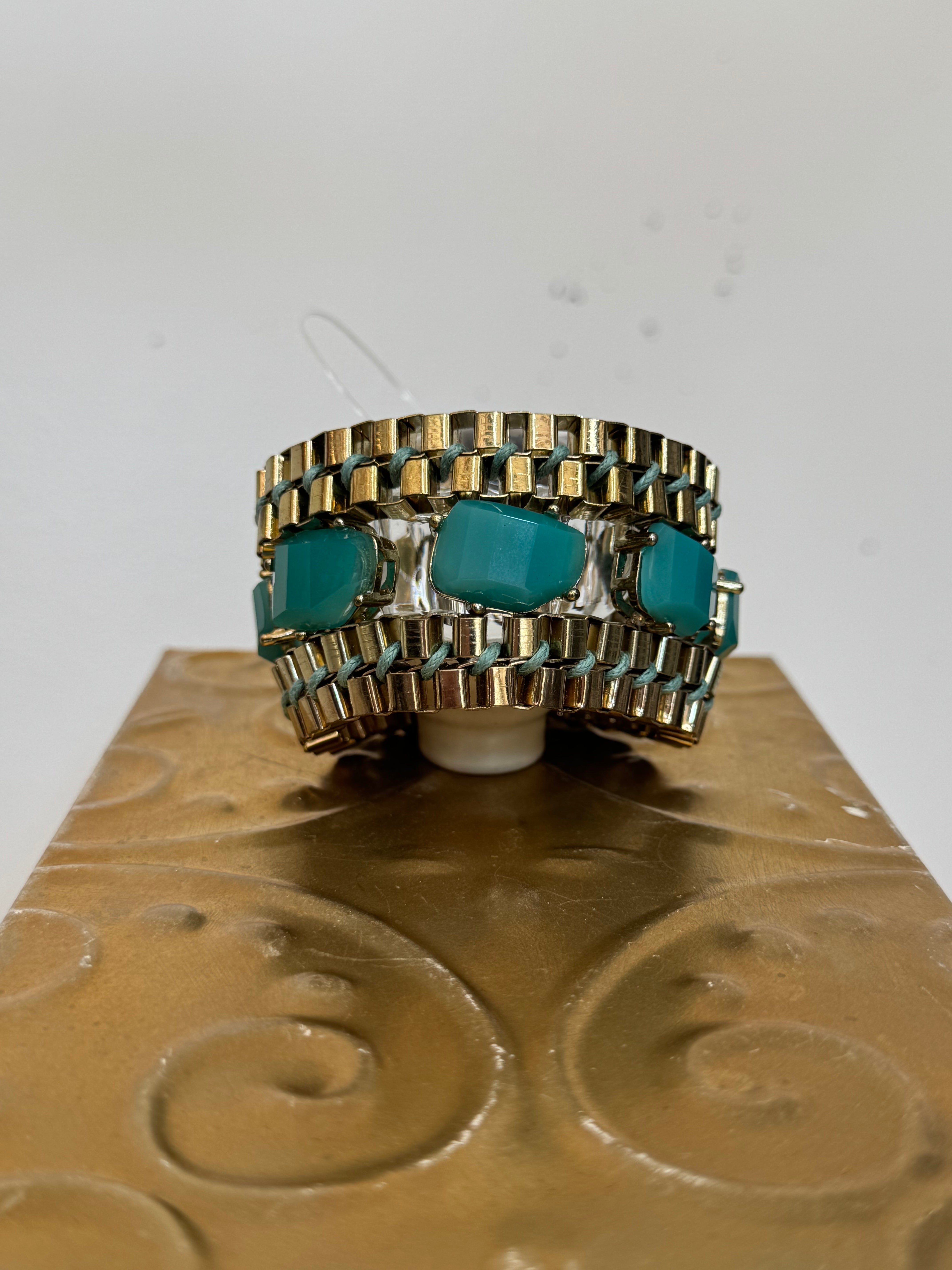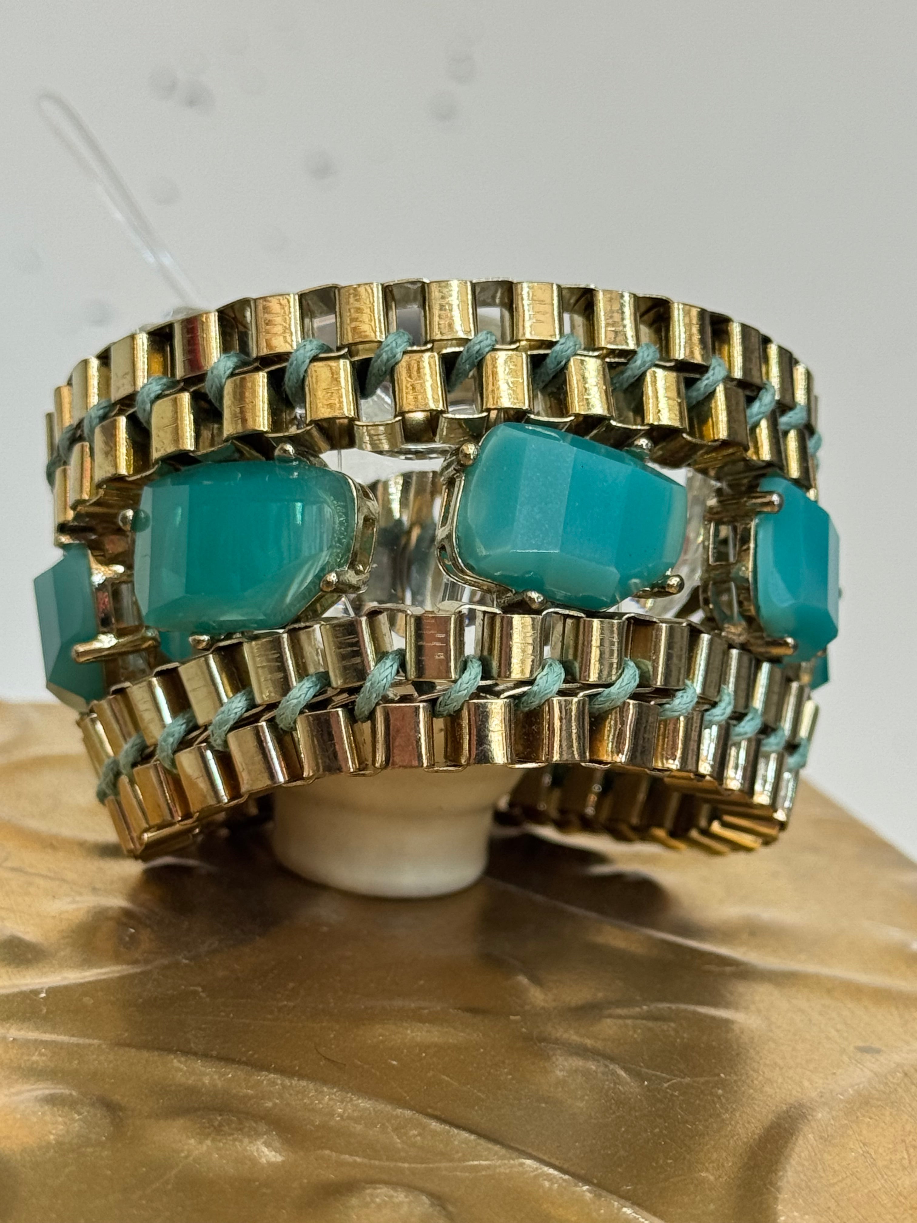 This gorgeous bracelet features a chain link design with large turquoise stones. It is a durable and heavy quality bracelet perfect for any occasion.