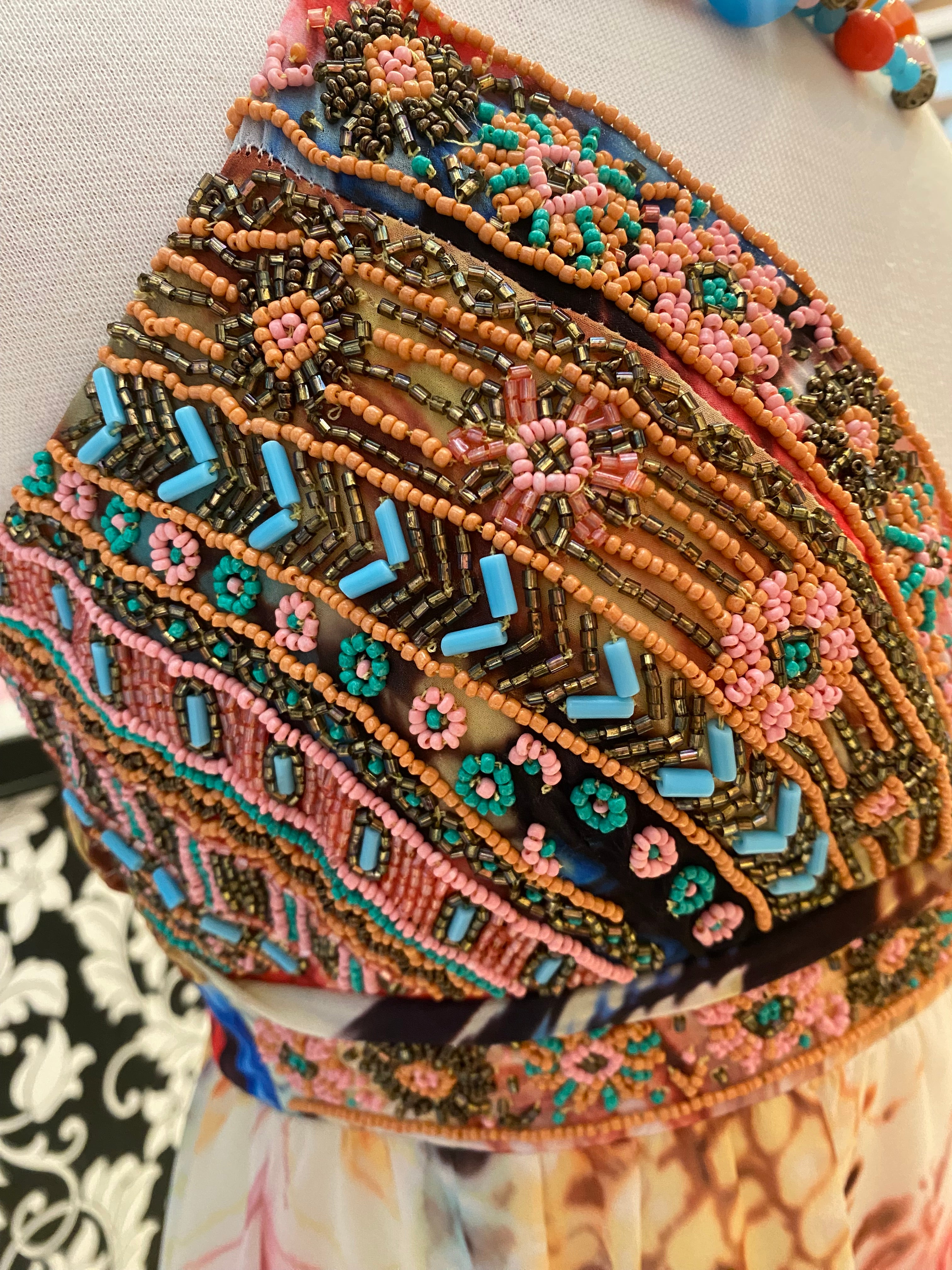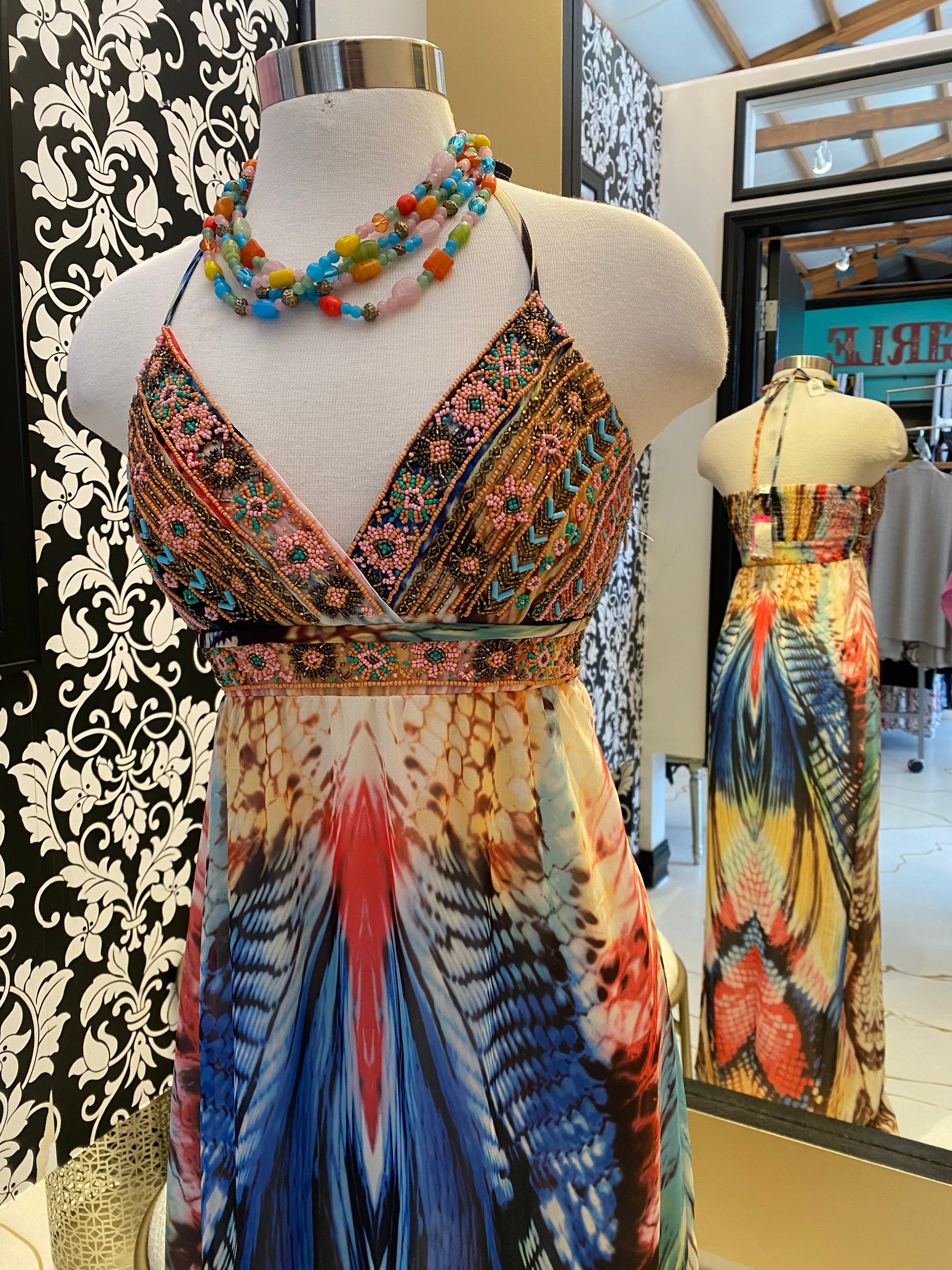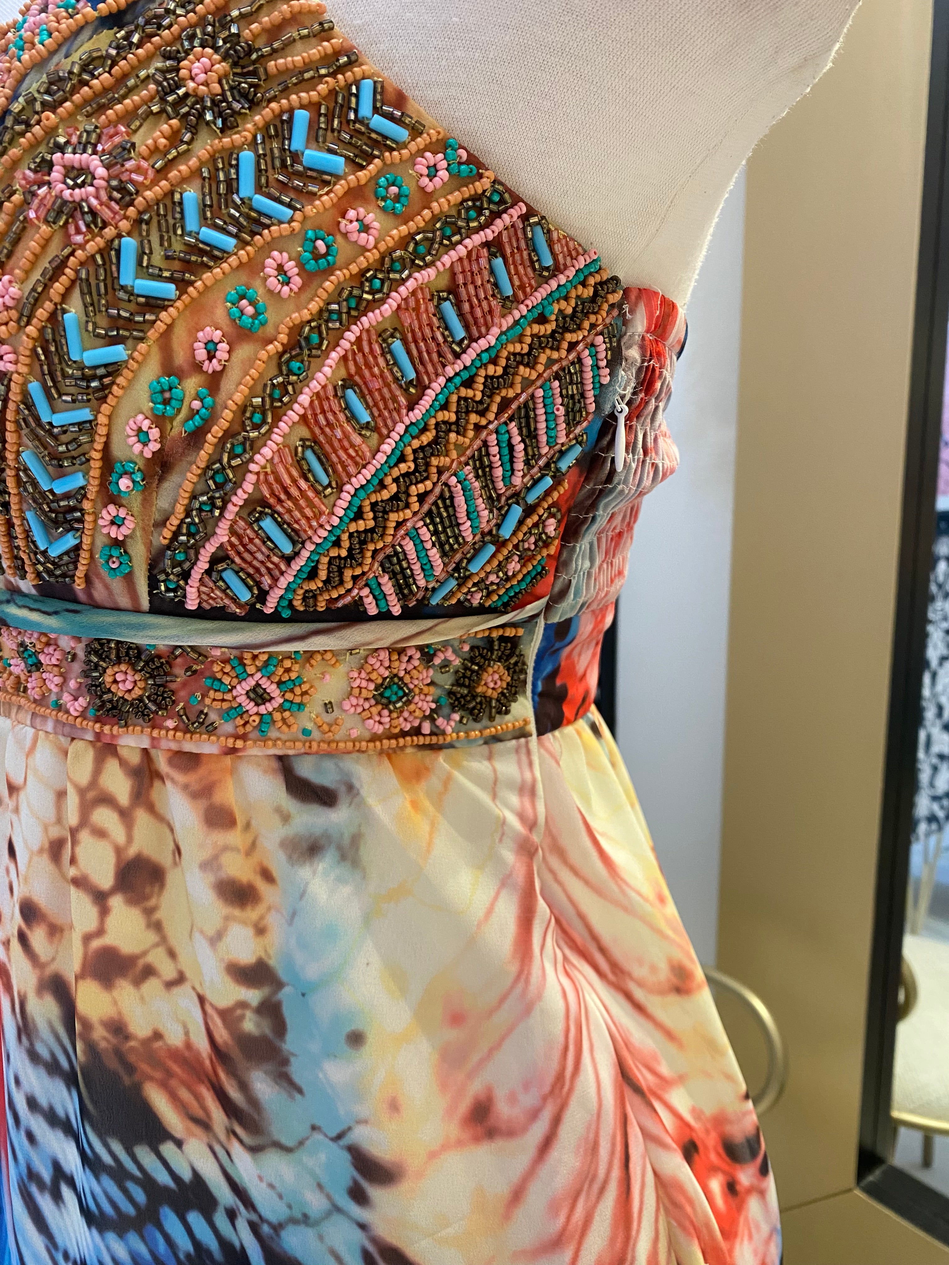 The Wow Factor!! This Beaded print Maxi Dress is Absolutely Beautiful .. Halter Style- Front Bead Design on Bust & High waist Band -Side Zipper& Back Stretch Style w/a Gorgeous Chiffon like Flow - Dress is Lined