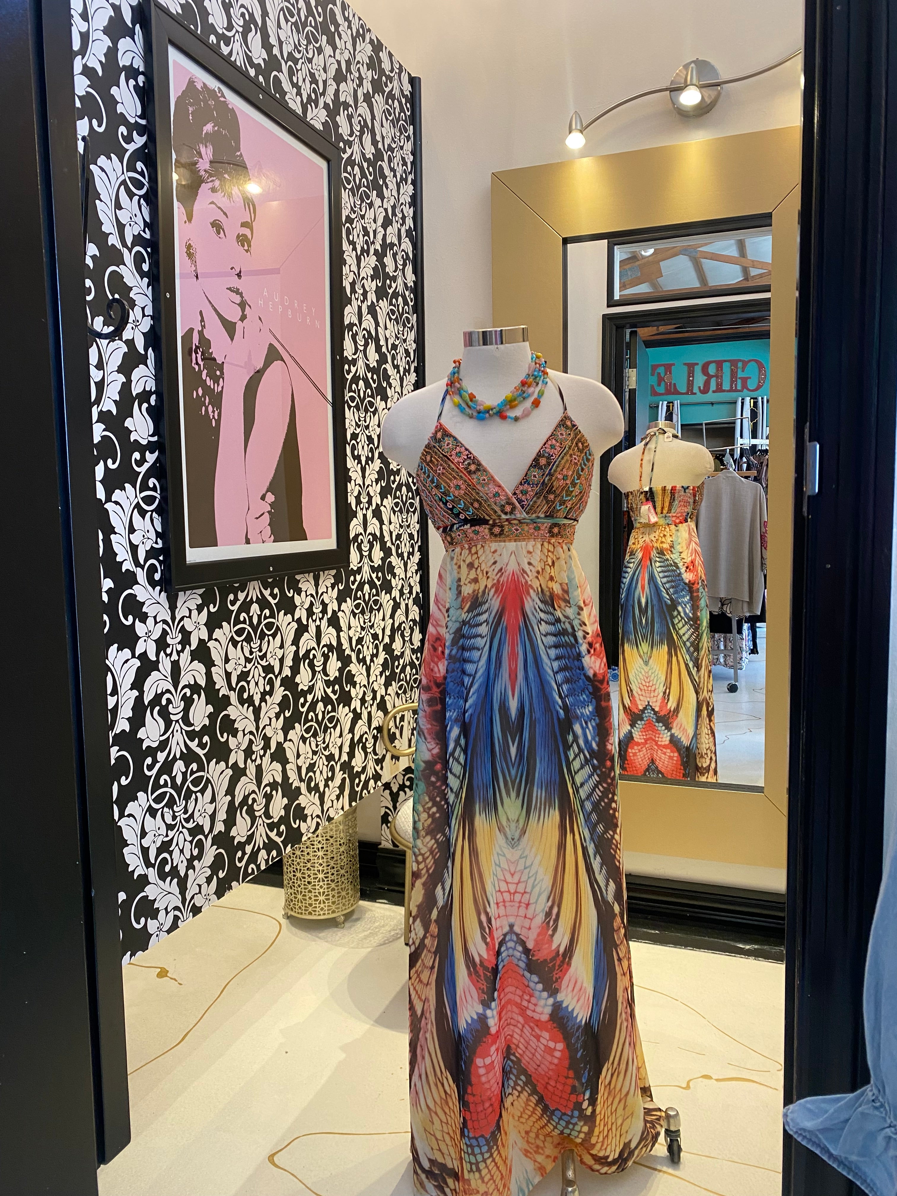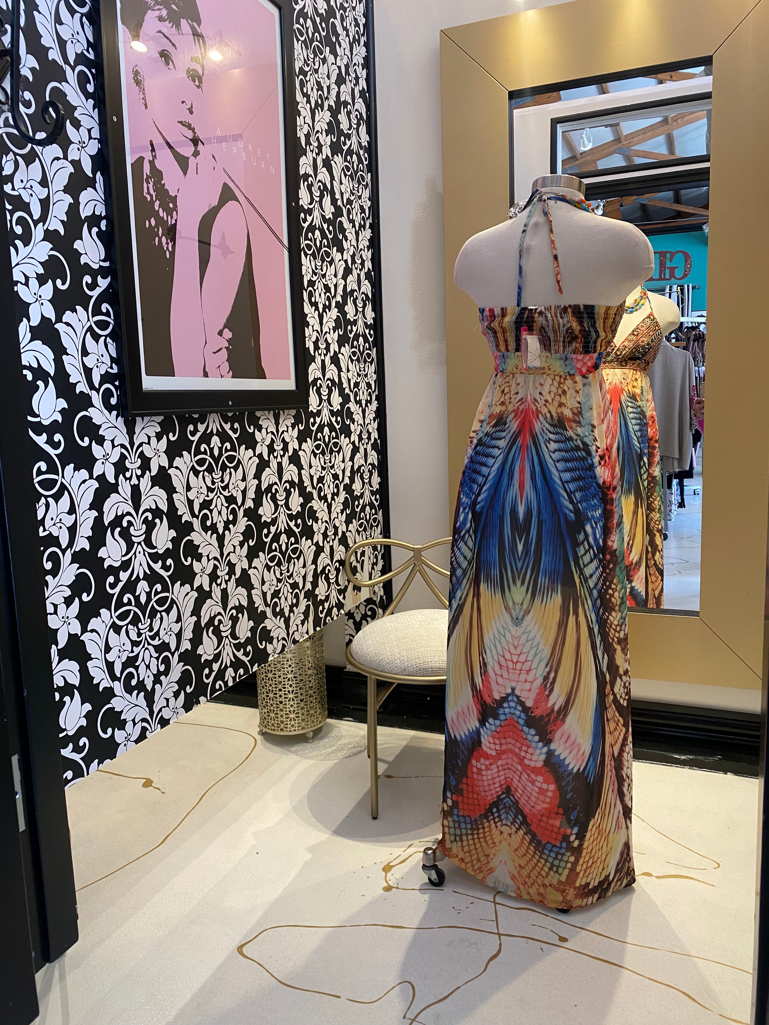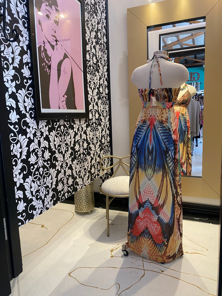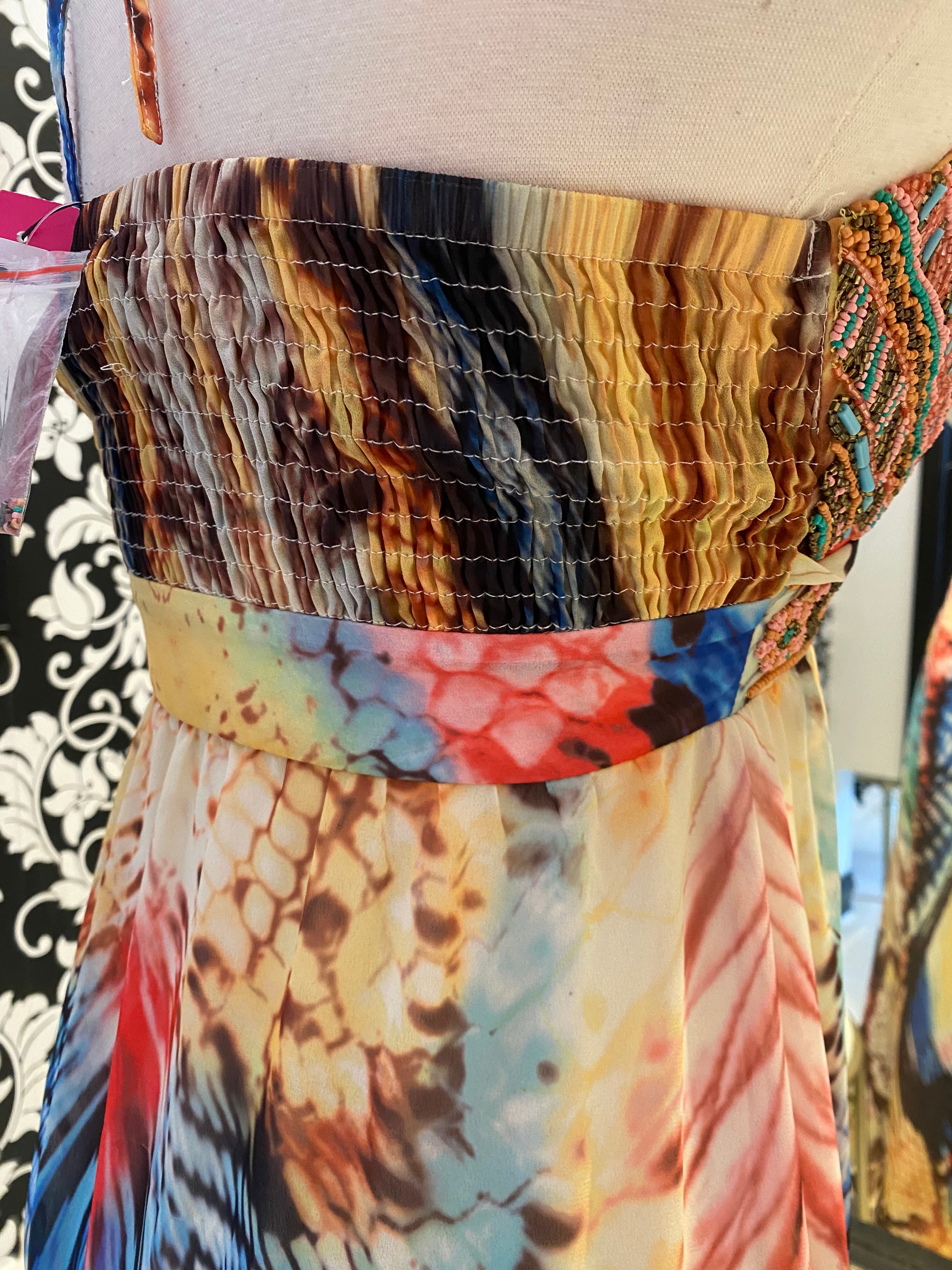 The Wow Factor!! This Beaded print Maxi Dress is Absolutely Beautiful .. Halter Style- Front Bead Design on Bust & High waist Band -Side Zipper& Back Stretch Style w/a Gorgeous Chiffon like Flow - Dress is Lined
