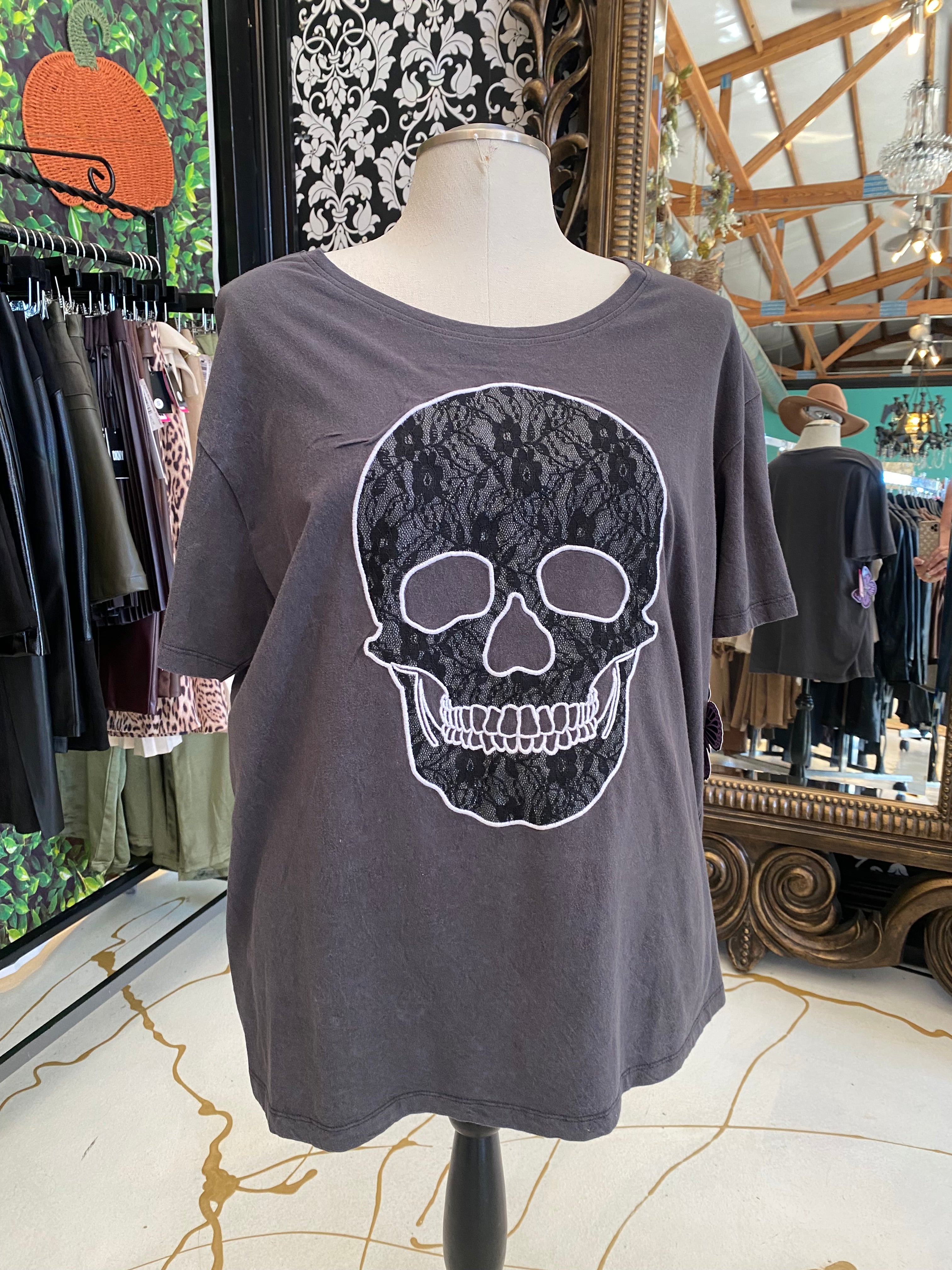 "Add some edge to your wardrobe with this plus size Lace Skull Top By Vibe N'! The intricate lace design gives a touch of elegance to the edgy skull print. A must-have for any stylish rebel. (Just don't let it go to your head!)"