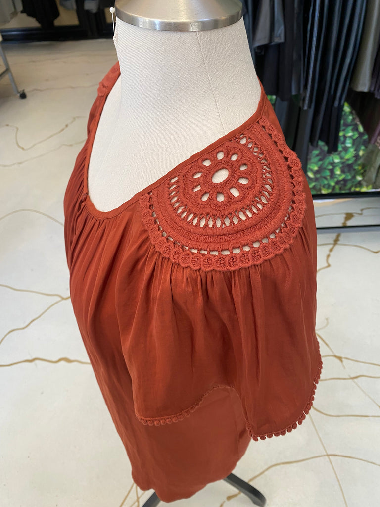 Expertly crafted in a rich rust color, this crochet top by Philosophy is both lightweight and comfortable. With its airy design and soft material, this top is perfect for all-day wear. Elevate your wardrobe with this must-have piece, offering both style and comfort.