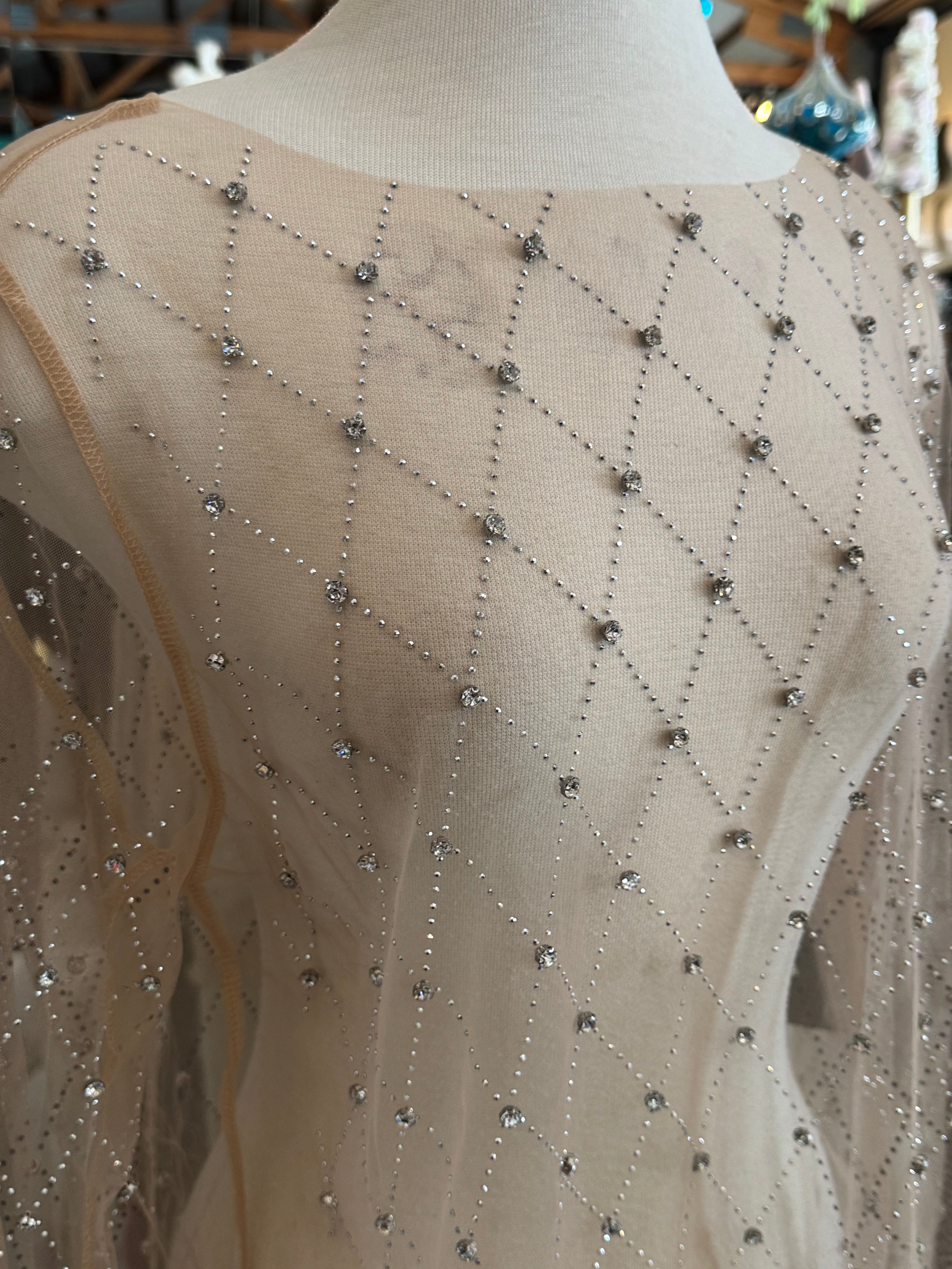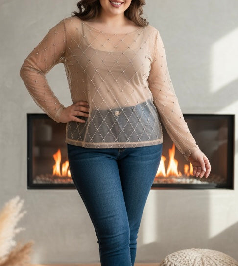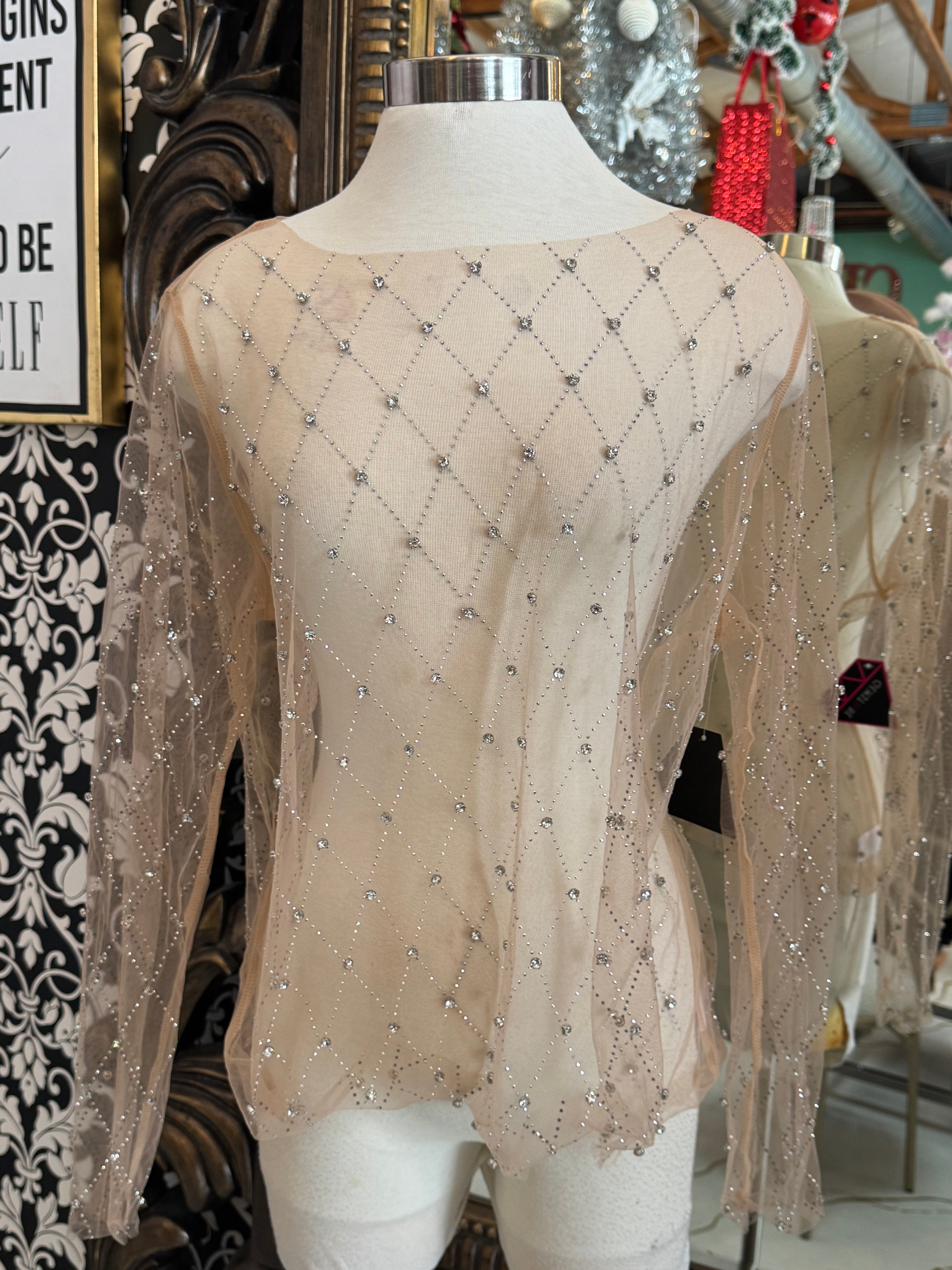 "Get ready to slay with this Sheer Large Stone Top Hy Gemstone! Featuring a sheer top adorned with a combination of large and small shimmering stones, this top will have you feeling like a gem. Perfect for adding some glamour to any outfit. Shine on, babe!"