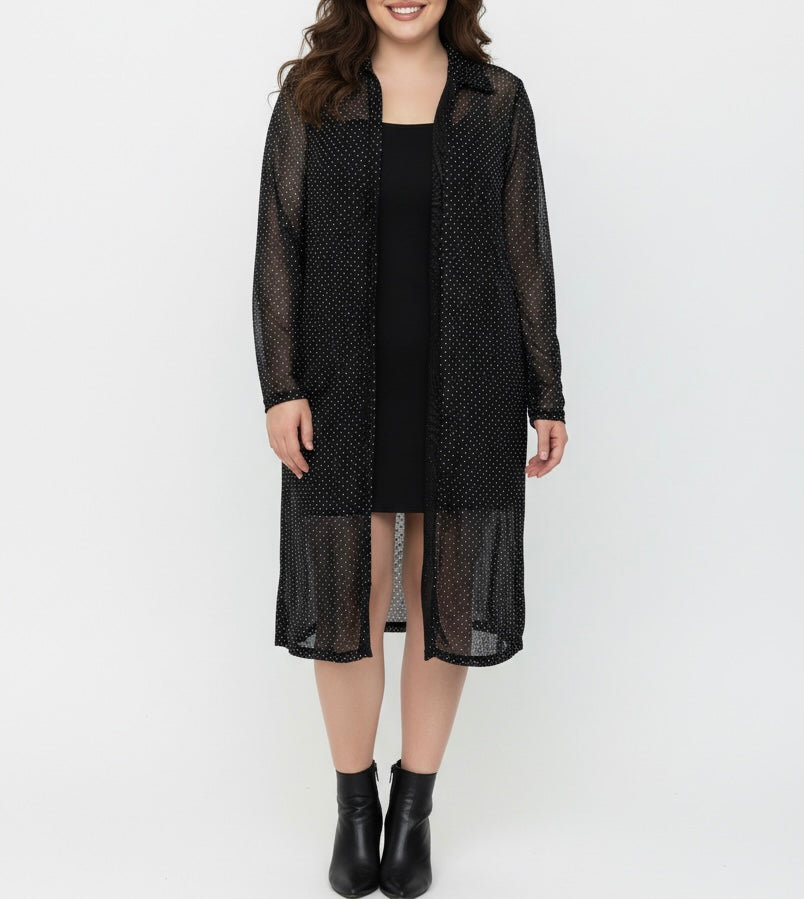 Introducing the Stone Long Duster Plus Size by Ember. This sheer duster adds a touch of elegance and versatility to any outfit. With its elongated silhouette, it provides coverage while still allowing your outfit to shine. Perfect for special occasions or everyday wear.