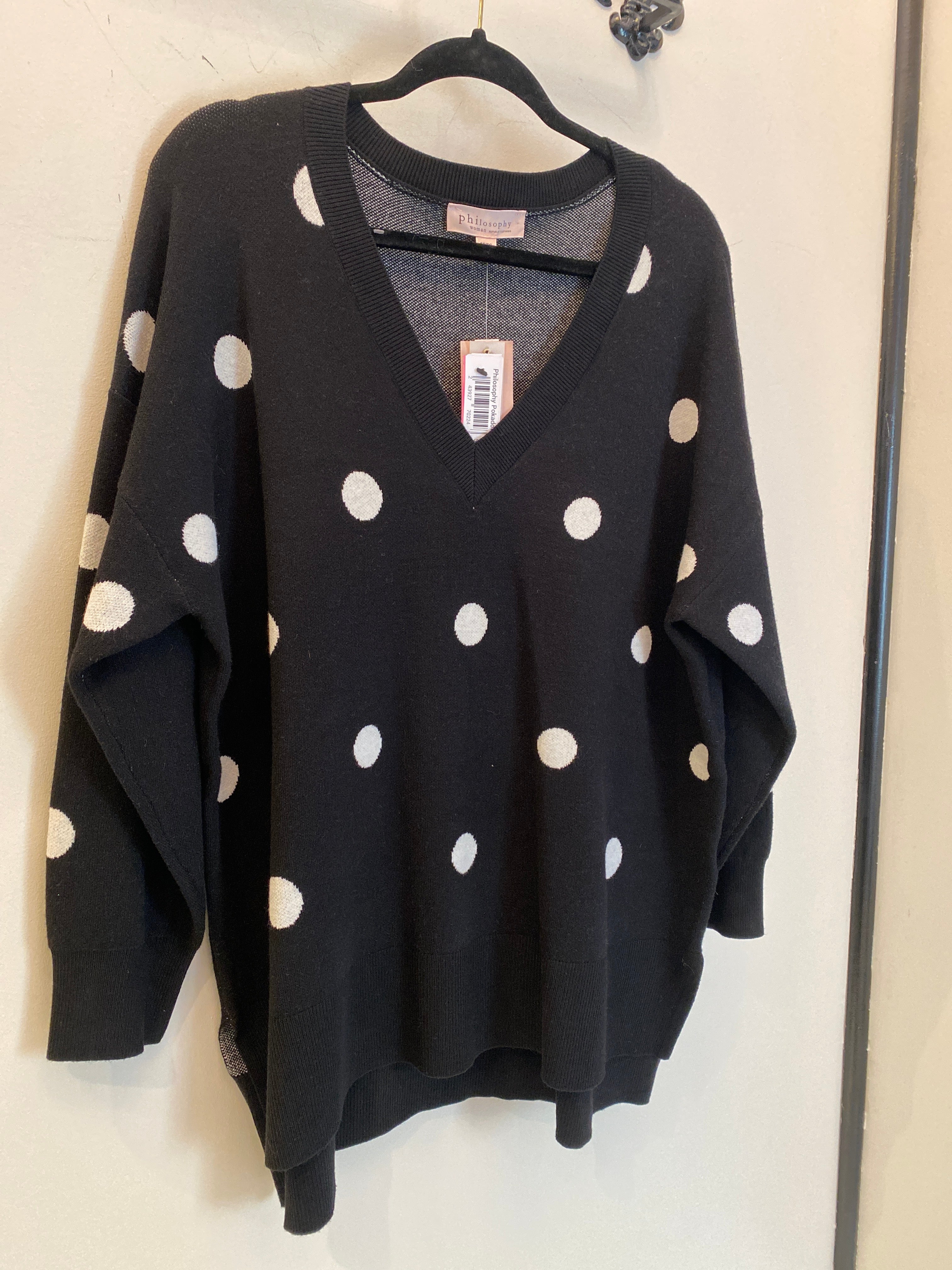 The Plus Size Polkadot Sweater by Philosophy features a classic black knit design accented with white polka dots. Its side slit and V-neckline enhance comfort and style, while the soft fabric composition ensures ease of wear. This sweater is an ideal choice for combining casual elegance with everyday practicality.