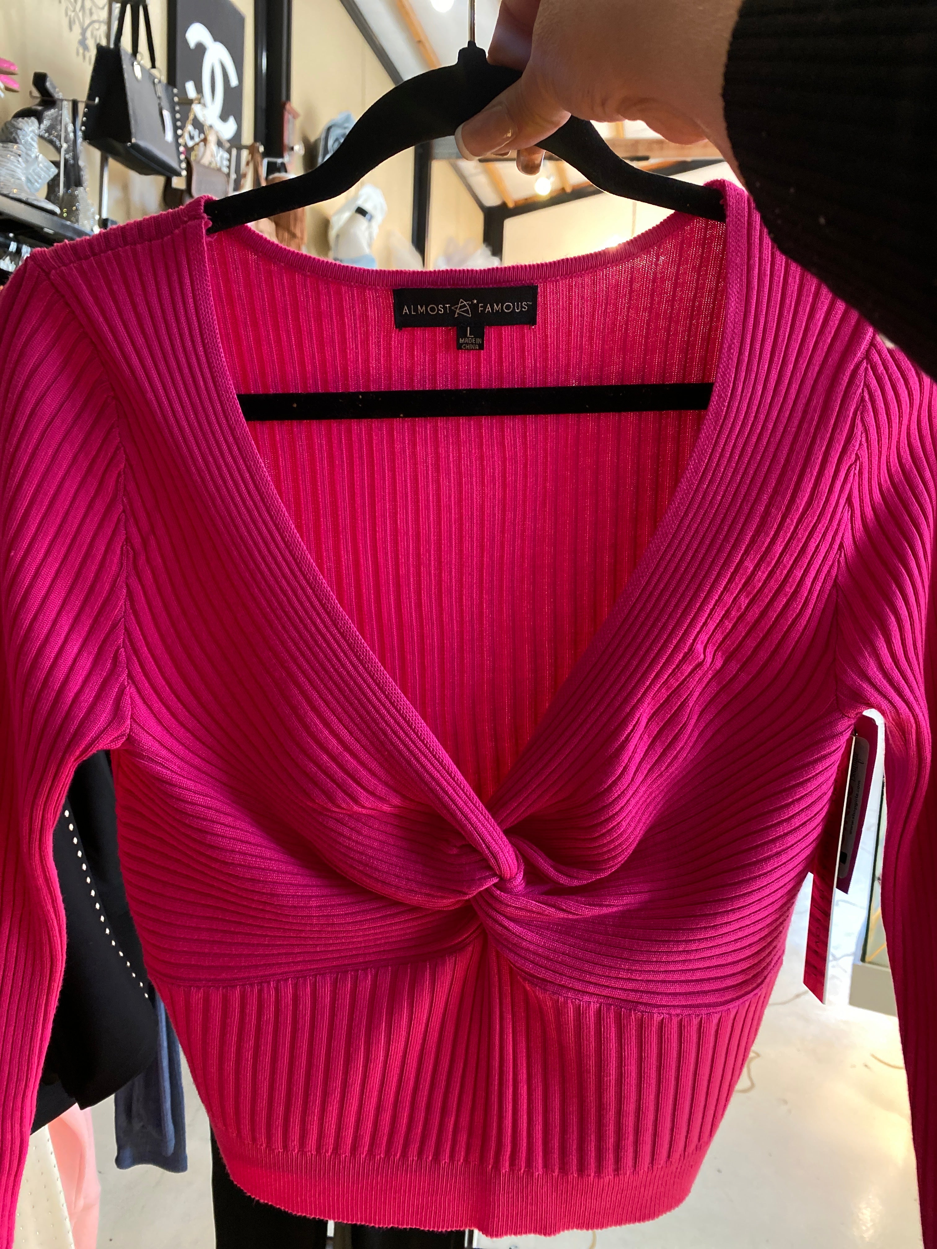 "Be the talk of the town with our Almost Famous Pink Knit Top! This super cute top features a unique crossover design that flatters your figure. Made with high-quality knit fabric, it's form-fitted to show off your curves. You'll be feeling almost famous and definitely fabulous in this top!"