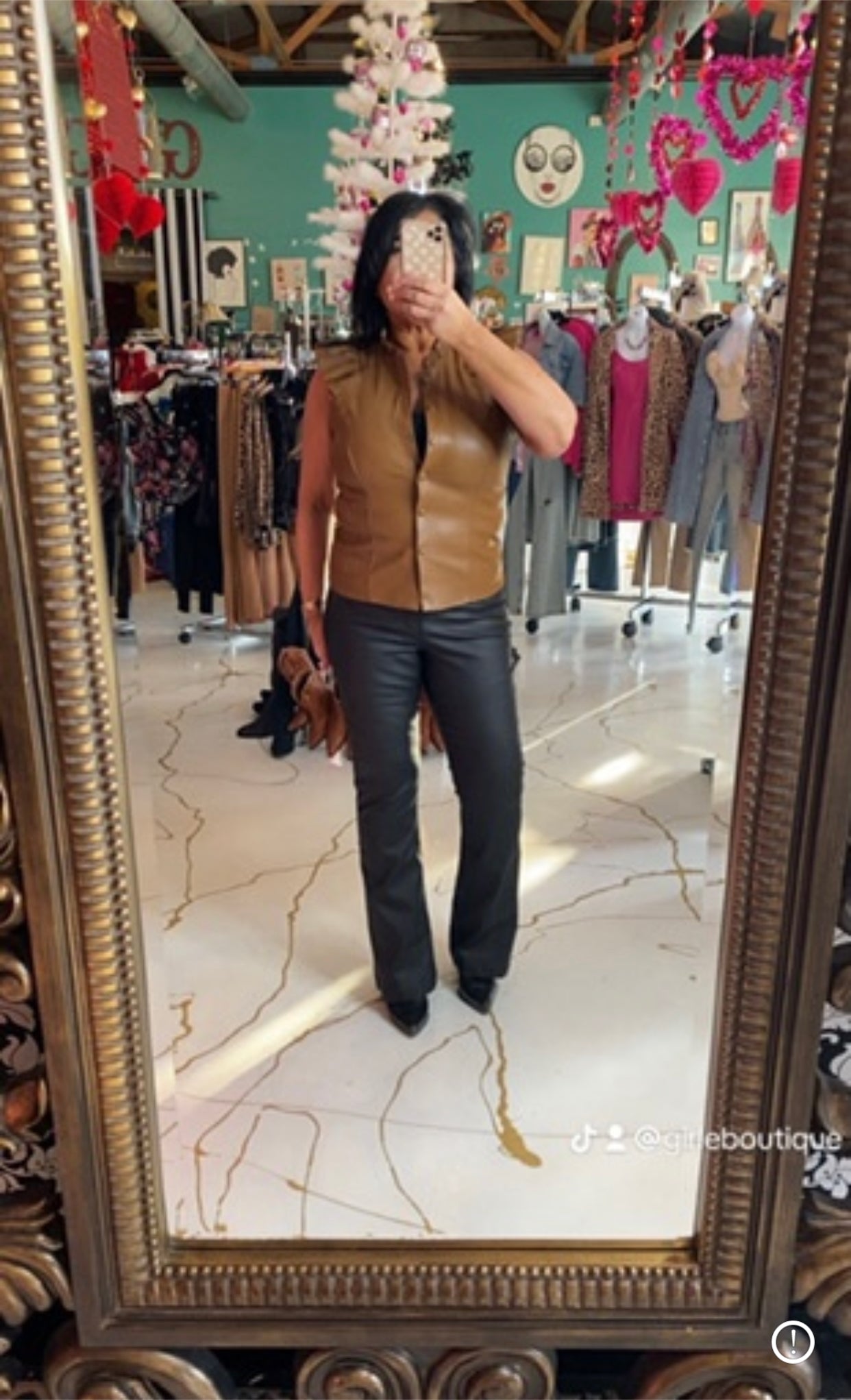 Step up your fashion game with our Brown Pleather Button Up Top by Marc New York. This stylish top features a sleek button-up design and is made with high-quality pleather for a luxurious look and feel. Perfect for any occasion, it will elevate any outfit with its chic and sophisticated style. Upgrade your wardrobe today!