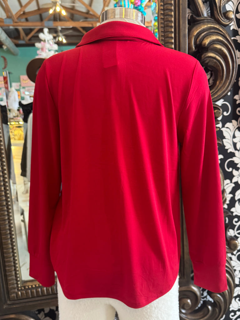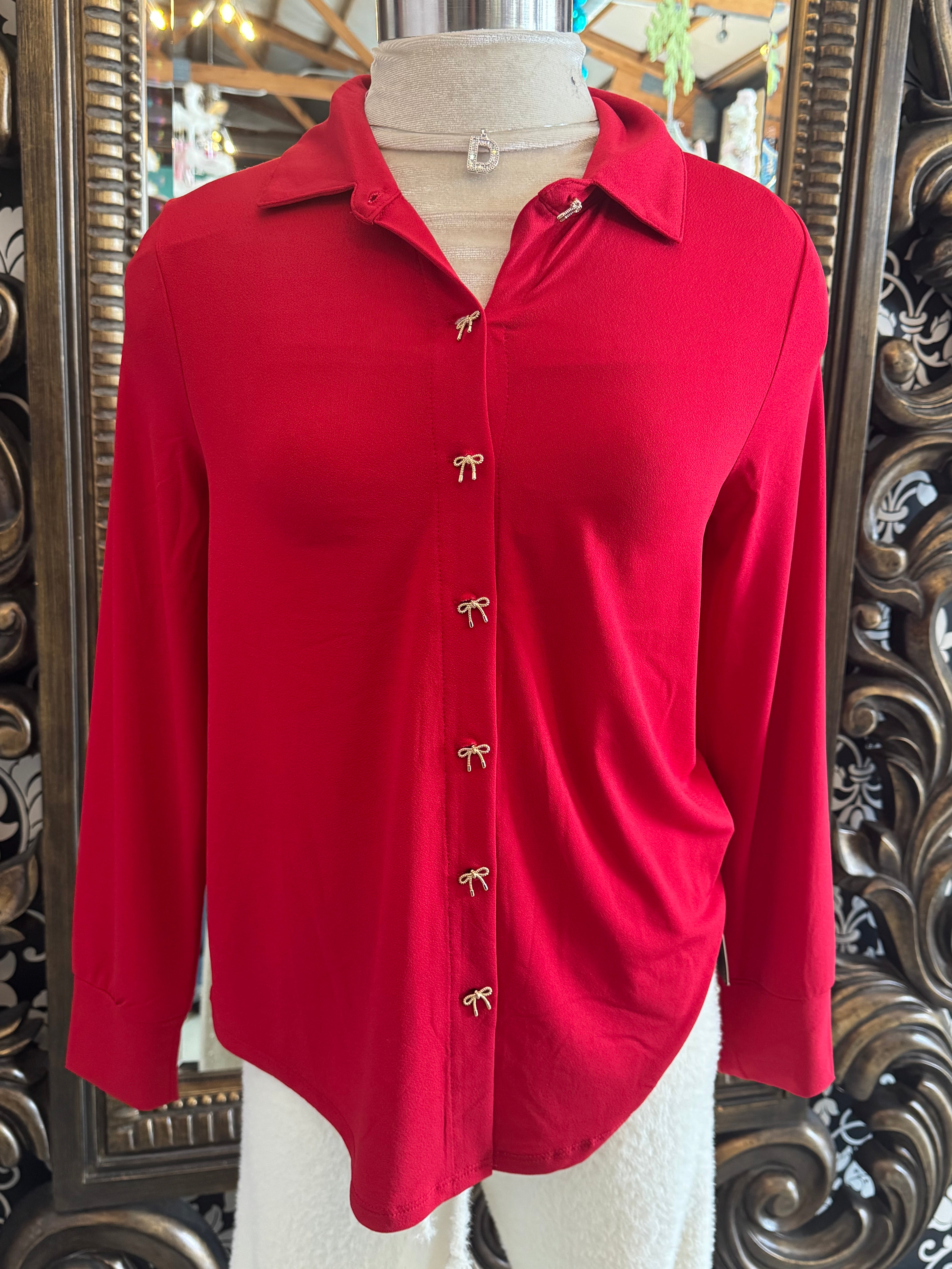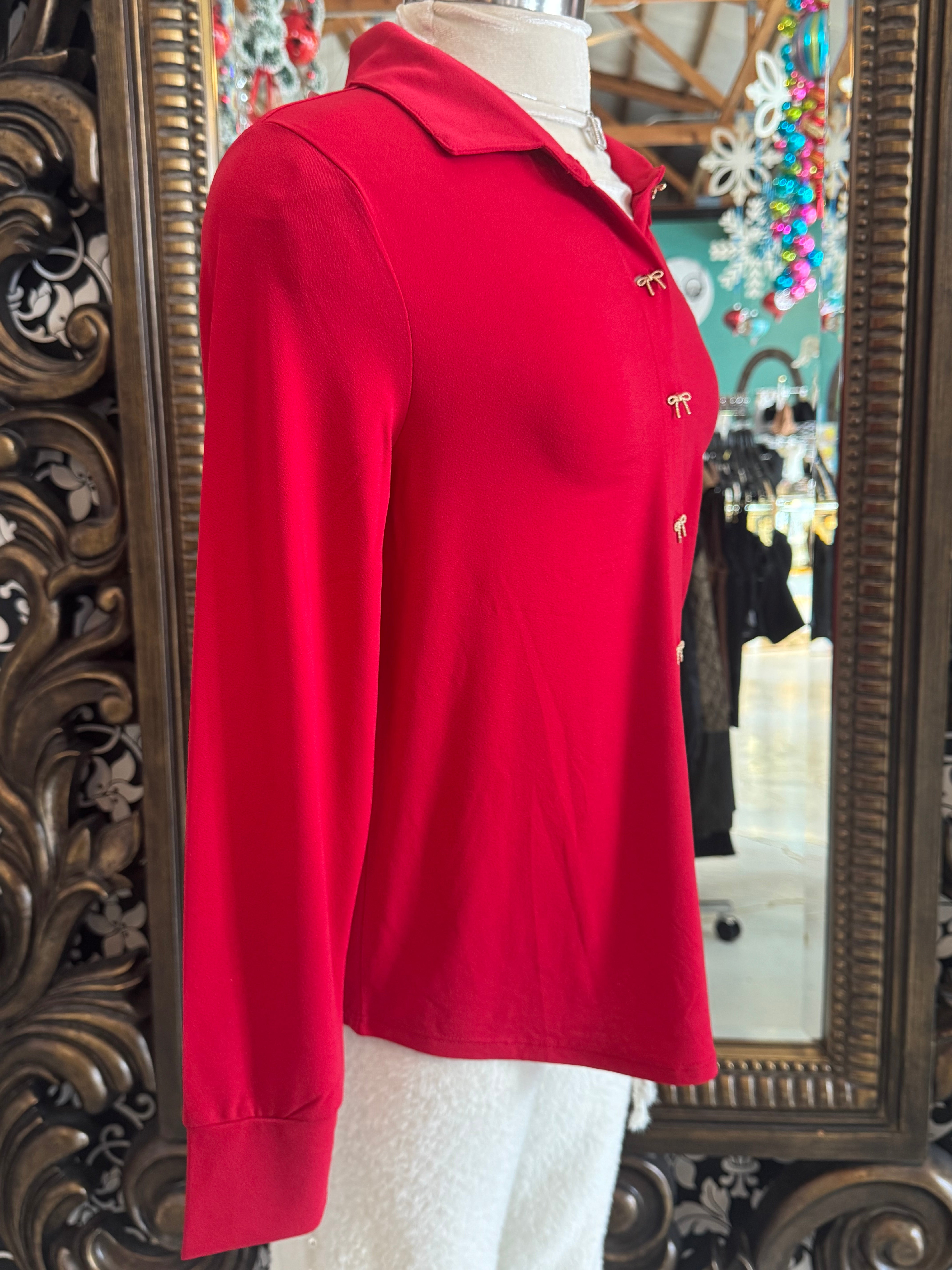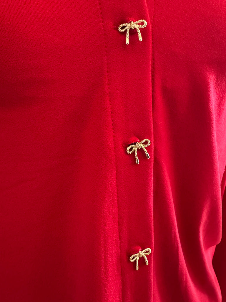 Introducing our Red Bow Top By Rio & Rain! This cute top is sure to catch some eyes with its unique bow buttons and playful fold over collar. Made from a flowy and high-quality fabric, it's both stylish and comfortable. Get ready to turn heads!