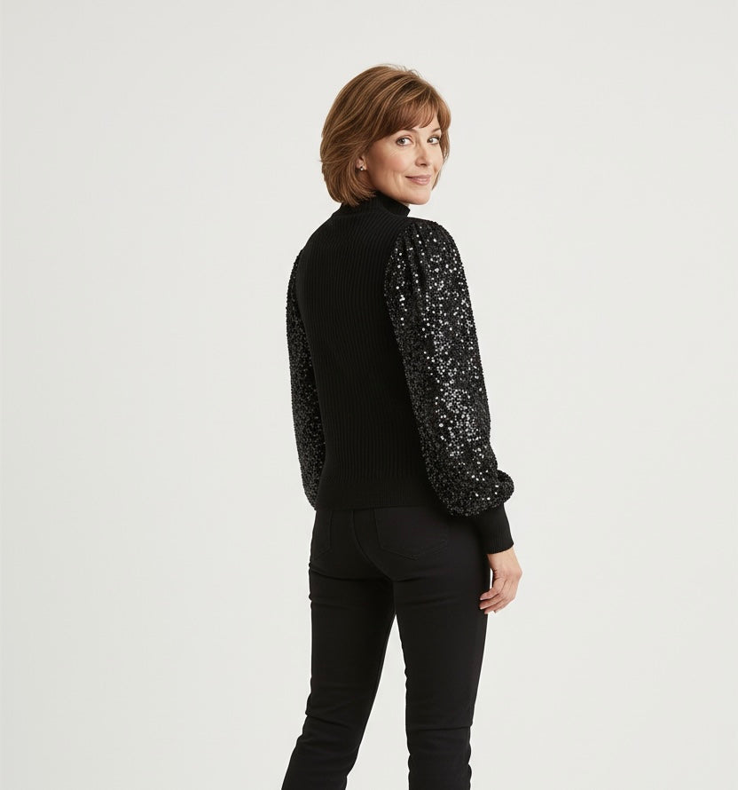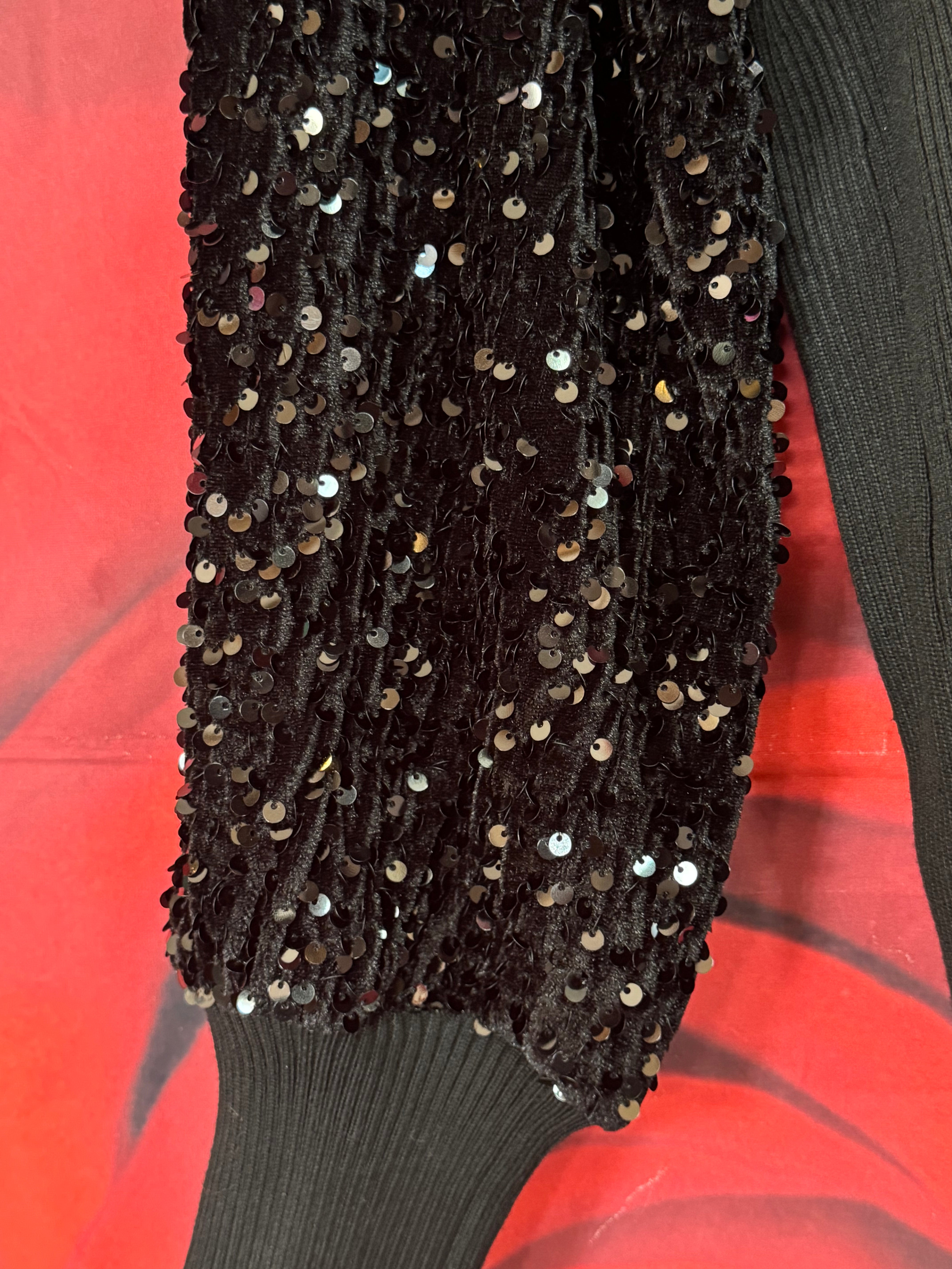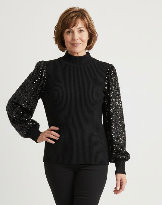 The Sequin Sleeve Knit Top by Cliche features a classic black sweater design enhanced with sequin-adorned sleeves and a velvet texture. The combination of materials offers both aesthetic appeal and tactile comfort, while the sequins add a touch of sophistication suitable for various occasions.