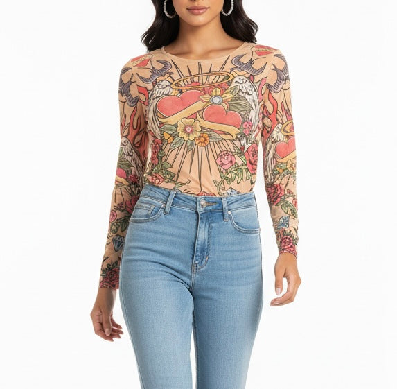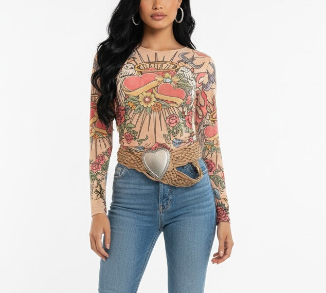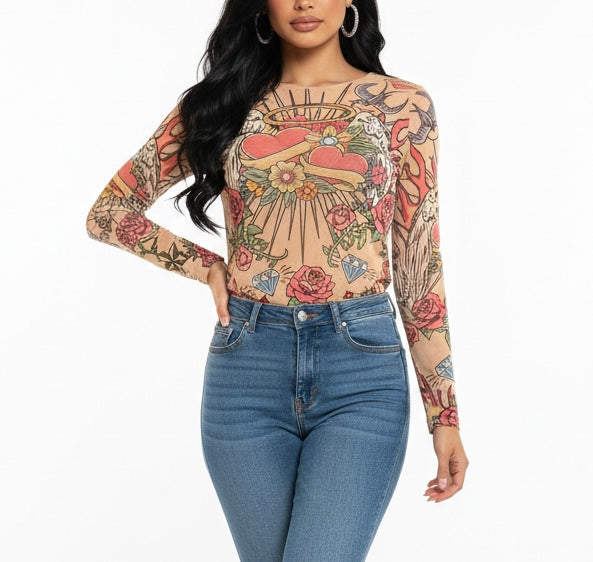 Unleash your inner tattooed rockstar with the Sheer Tattoo Shirt by Madden Girl! This snug little number hugs you in all the right places, flaunting a playful rose and heart design that'll make you the talk of the town (or at least your Instagram feed). Slip it on and get ready to strut your stuff!