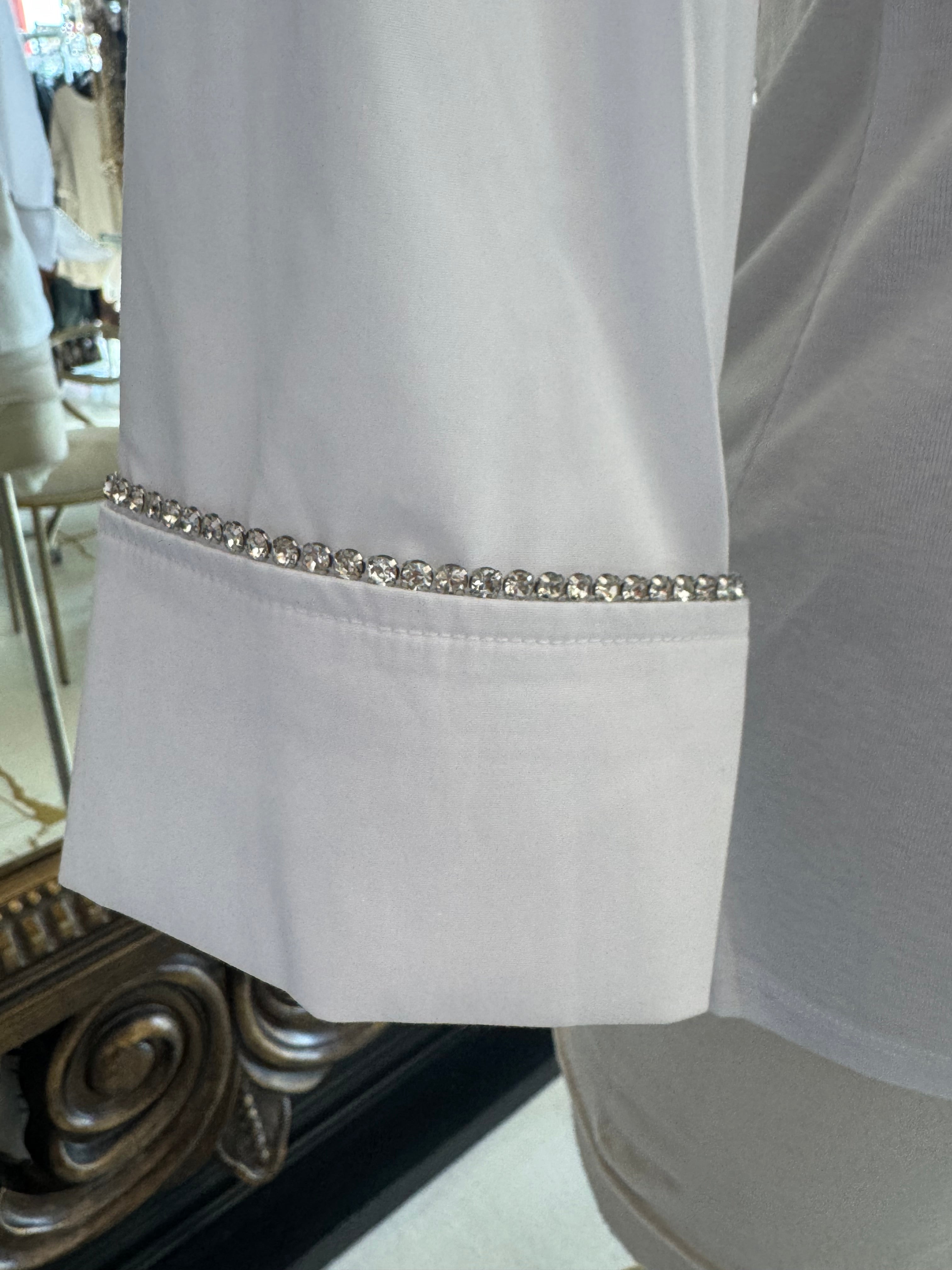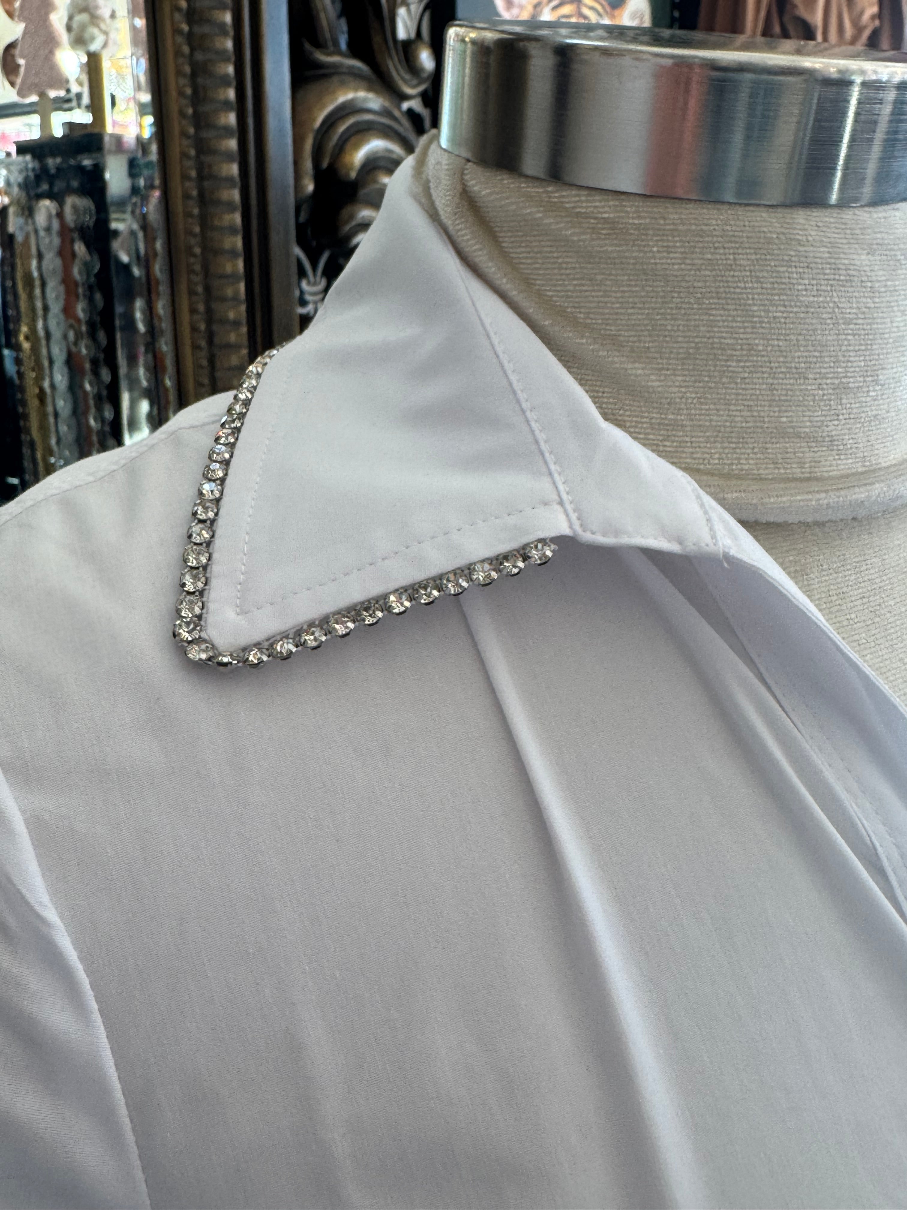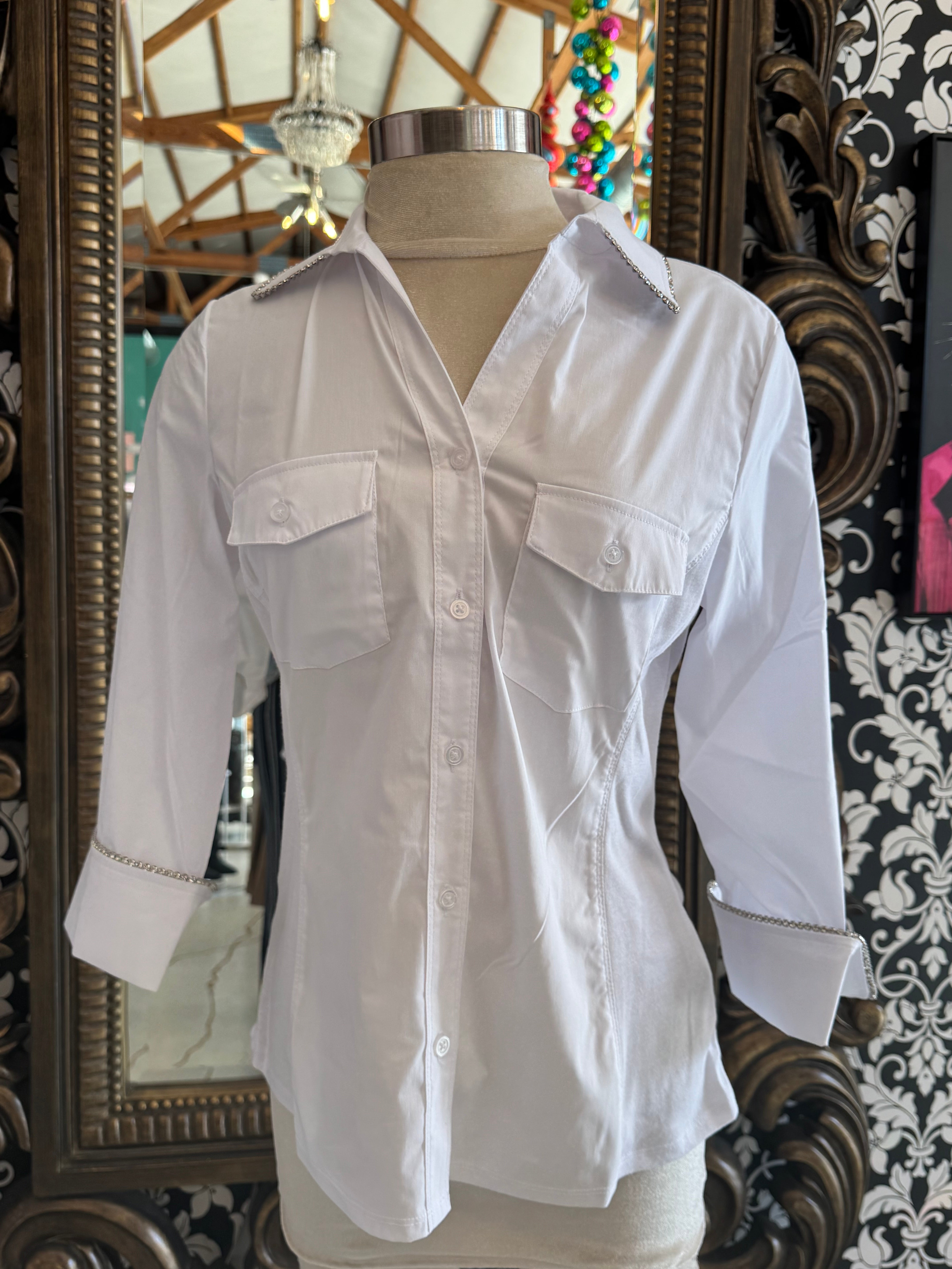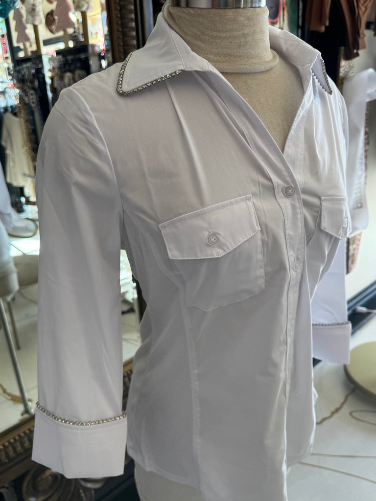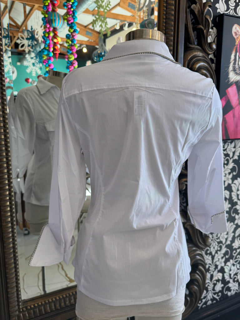 This white button-up top by Zac & Rachael features intricate rhinestone detailing along the collar and sleeve wrists, adding a touch of elegance to any outfit. The crisp white color and classic design make this top a versatile and stylish addition to your wardrobe. Perfect for both work and special occasions.