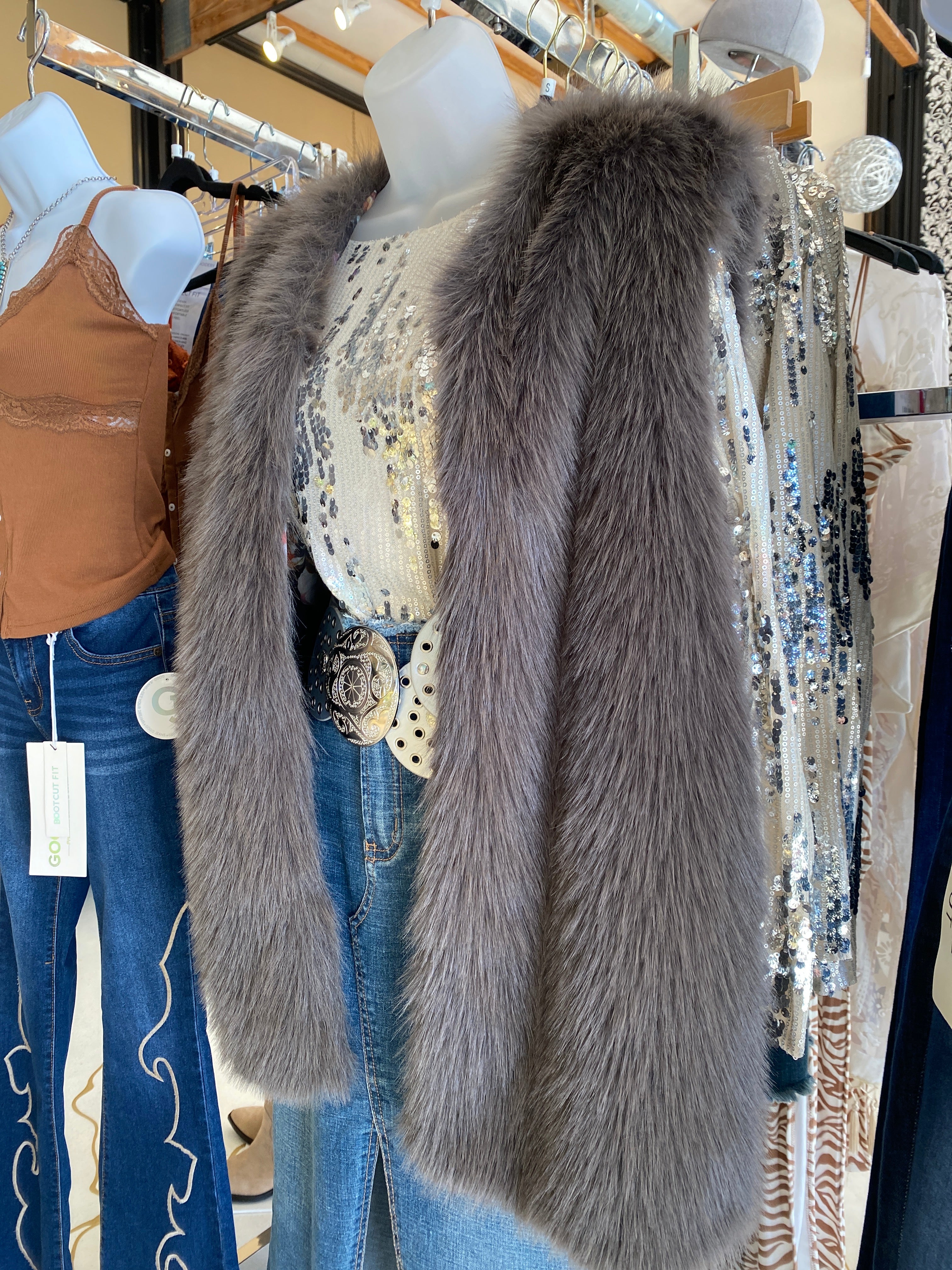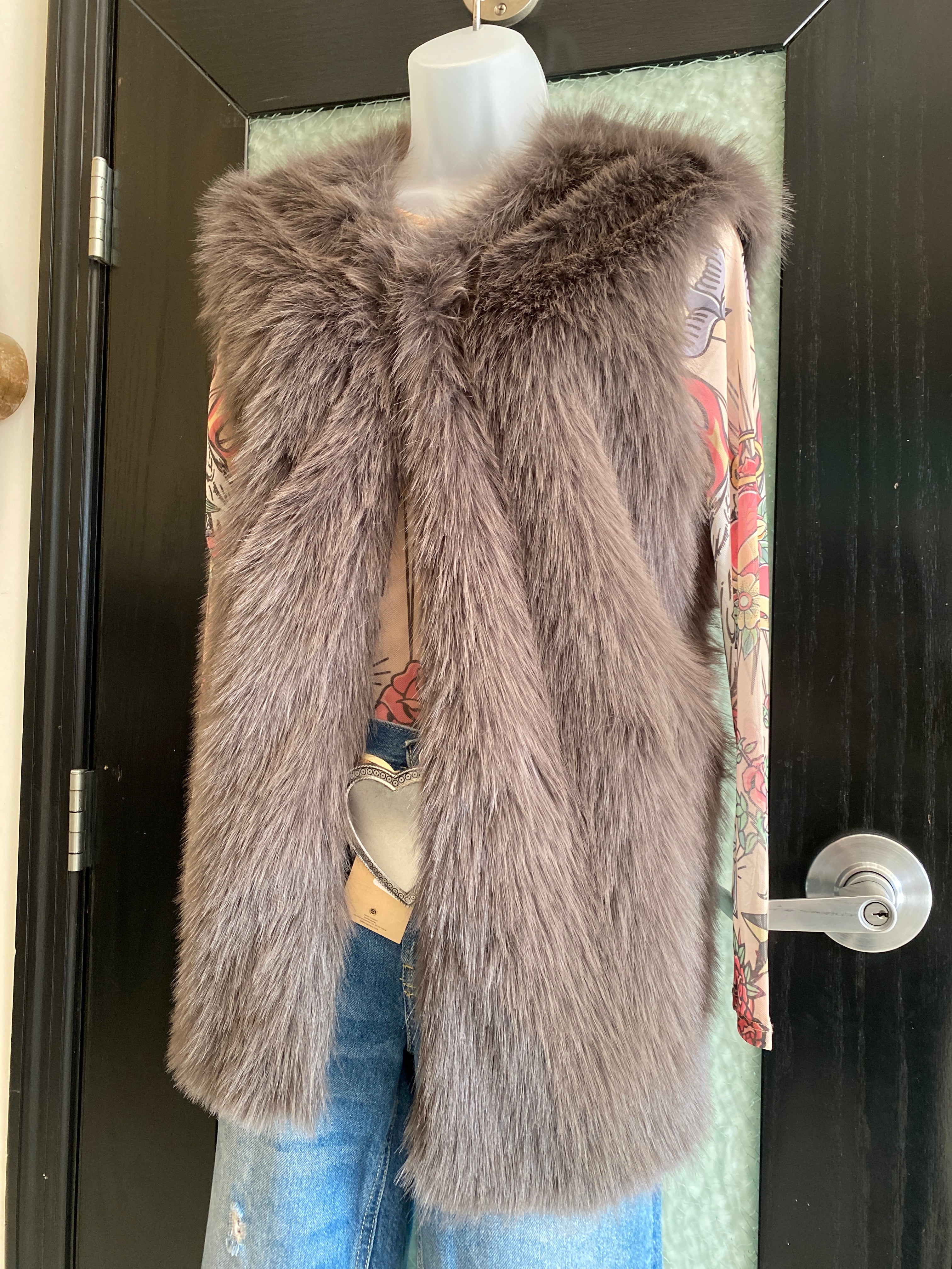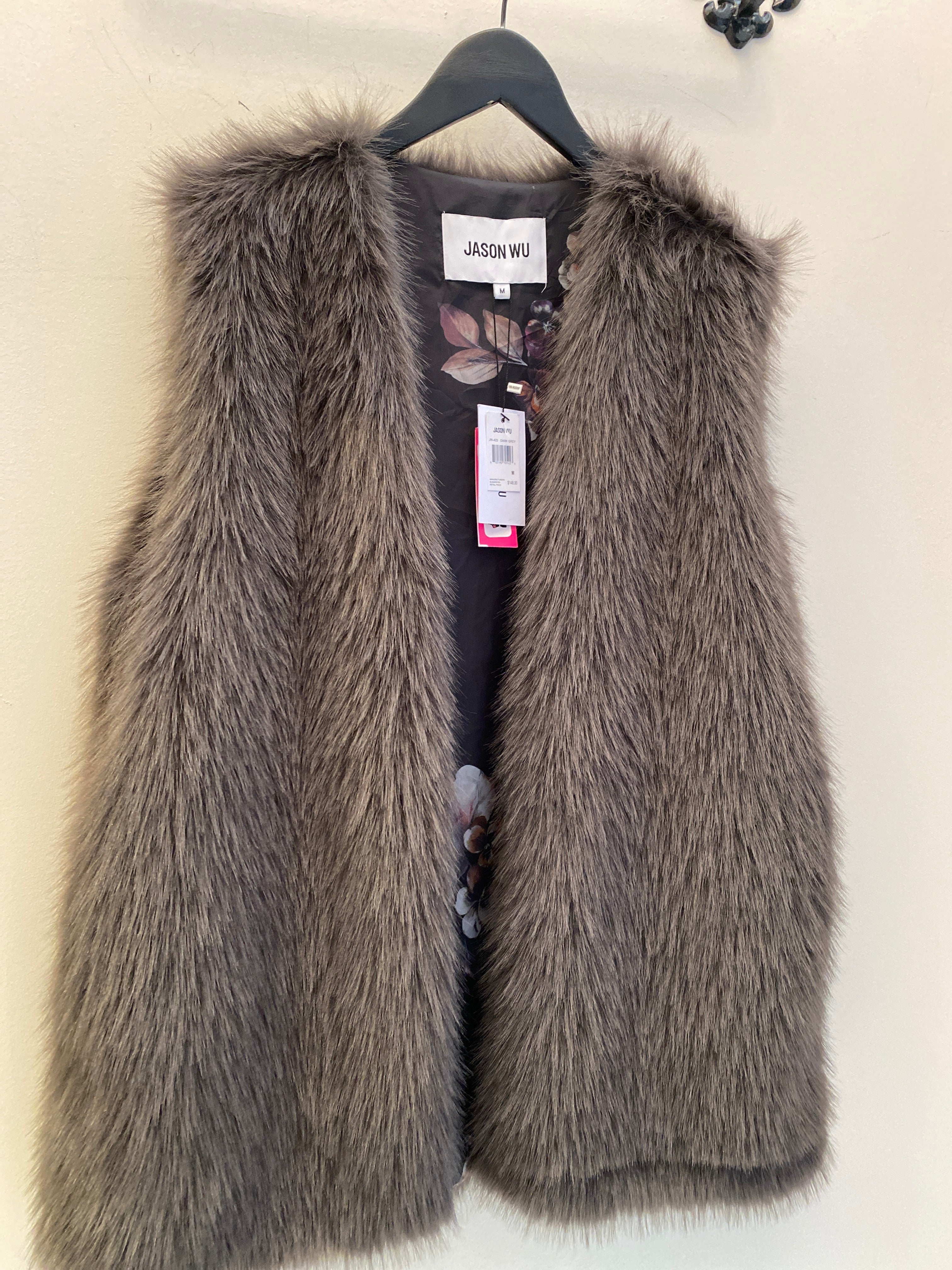 The Grey Brown Faux Fur Long Vest by Jason Wu features a sleeveless design, providing ease of movement while maintaining warmth through its high-quality faux fur construction. The inner lining showcases a decorative print, enhancing visual appeal, while side pockets offer practical storage. This vest is a sophisticated option for layering w/ a Top eyelet hook closer.