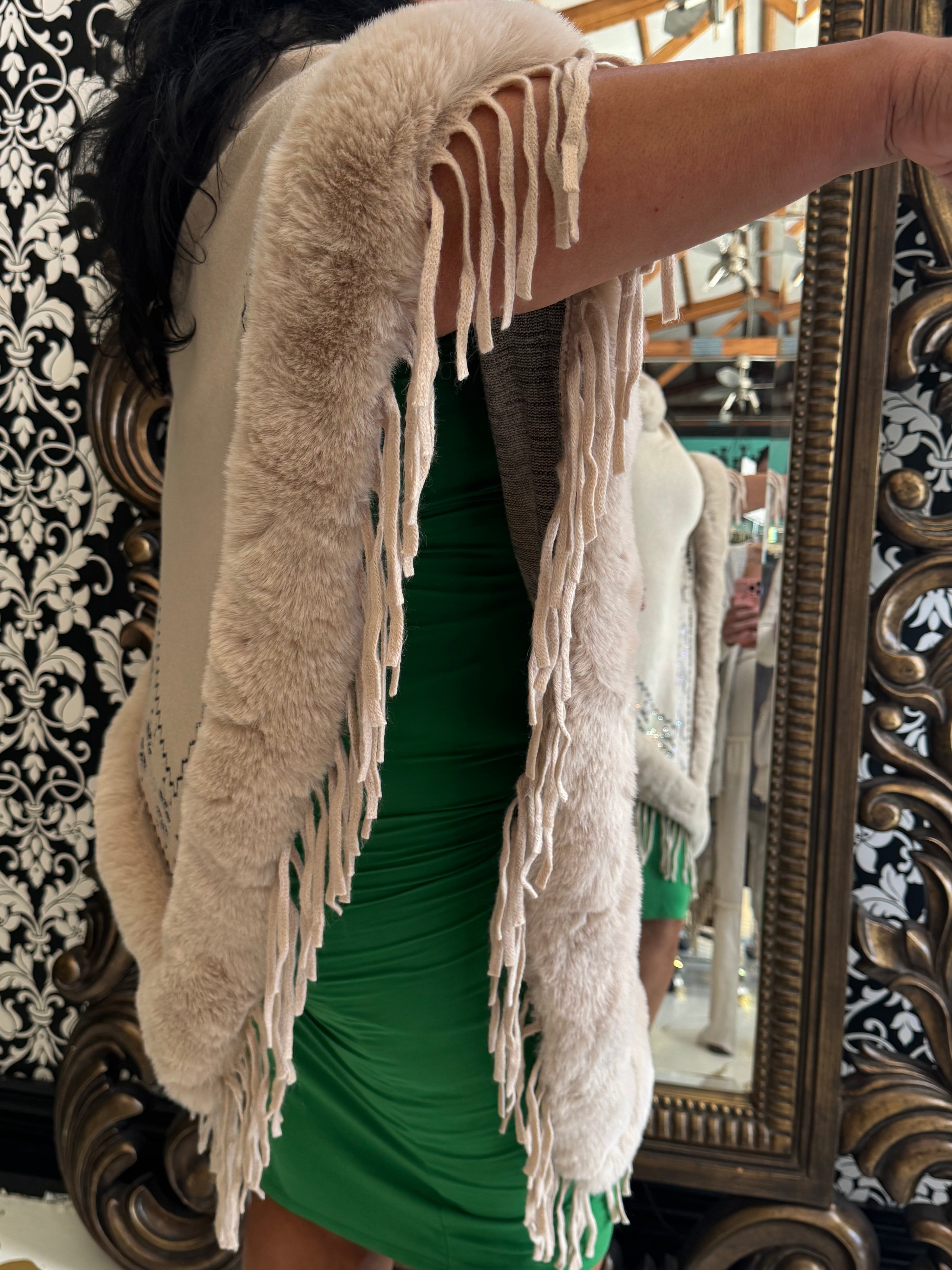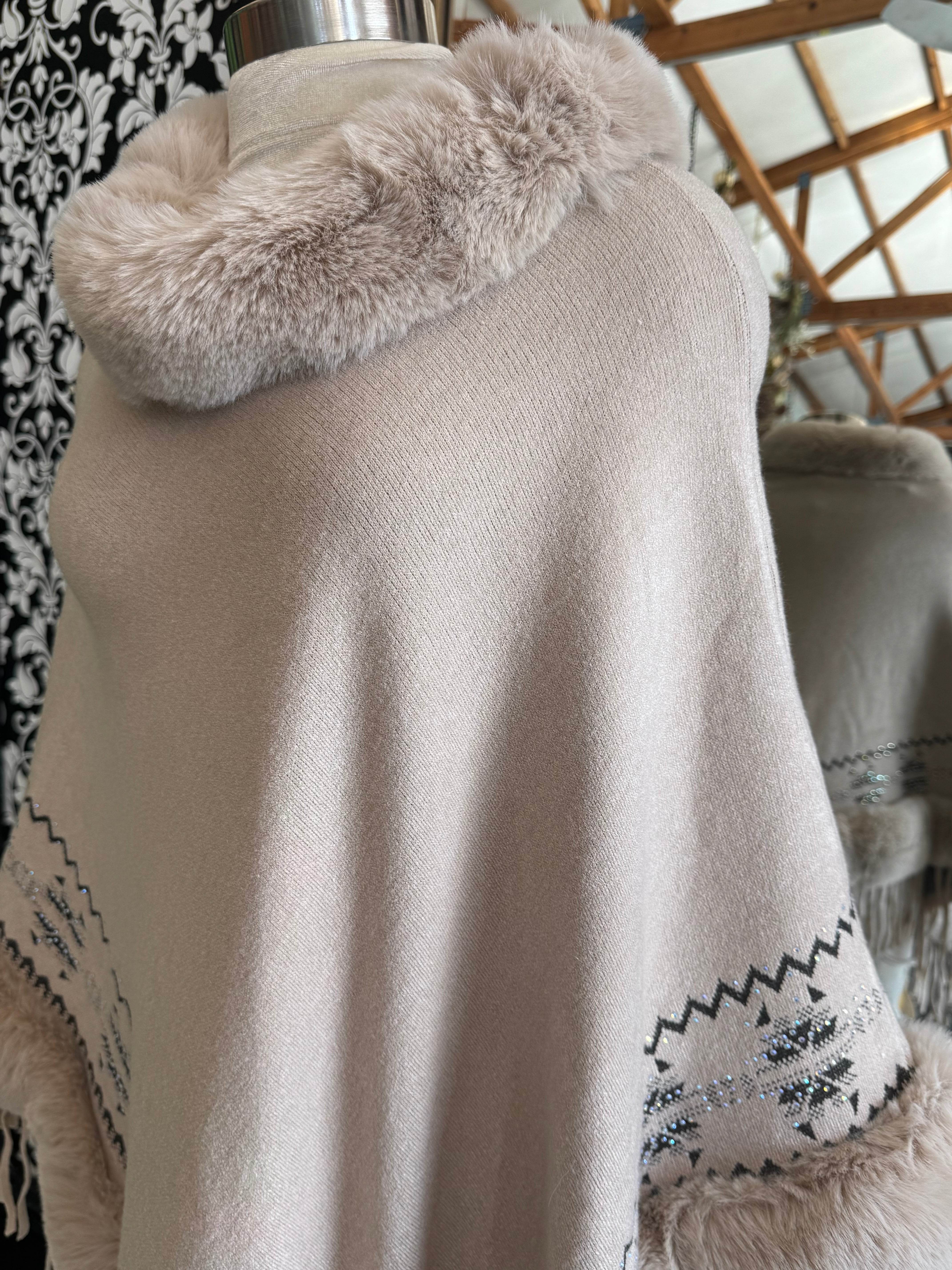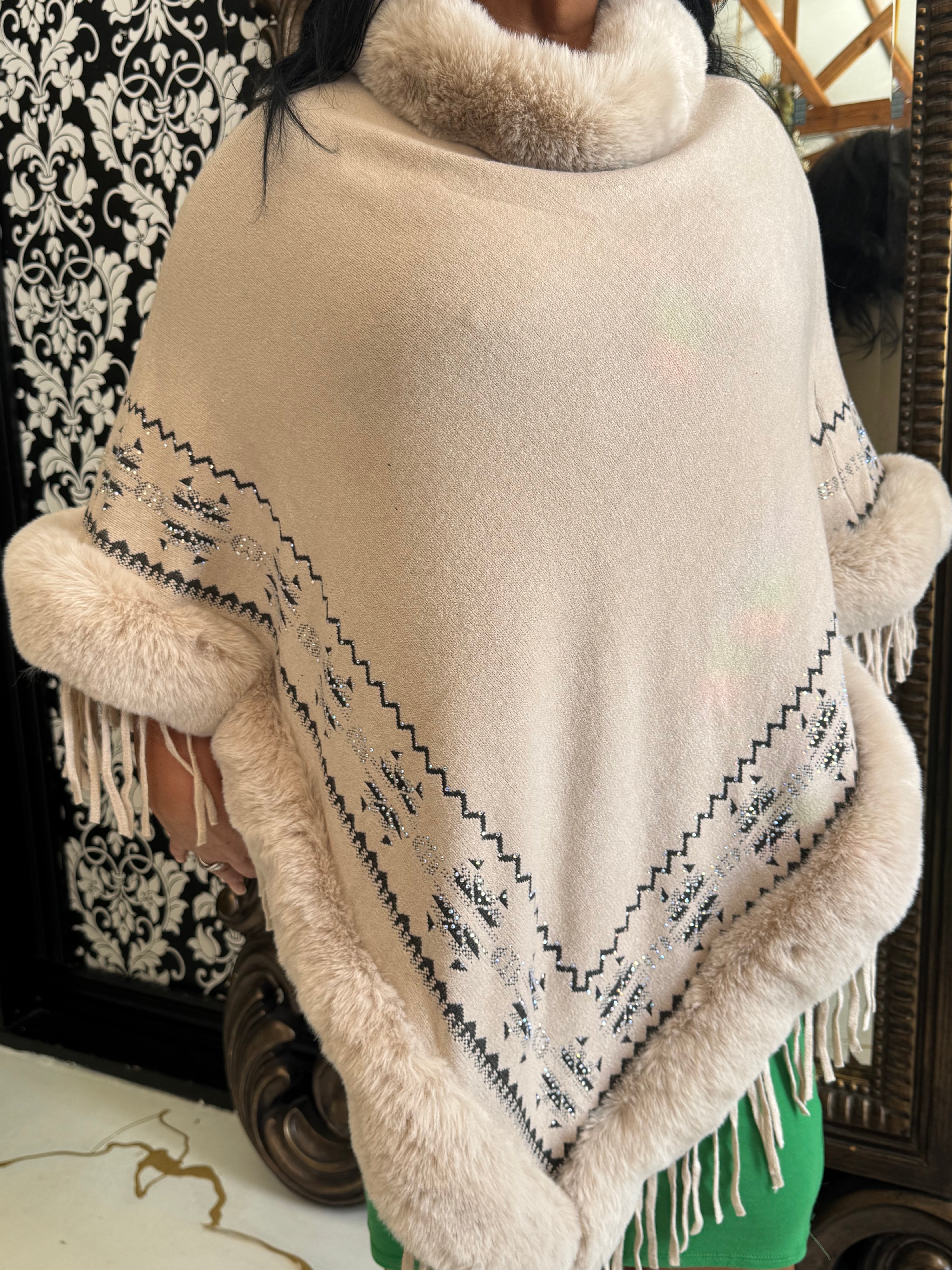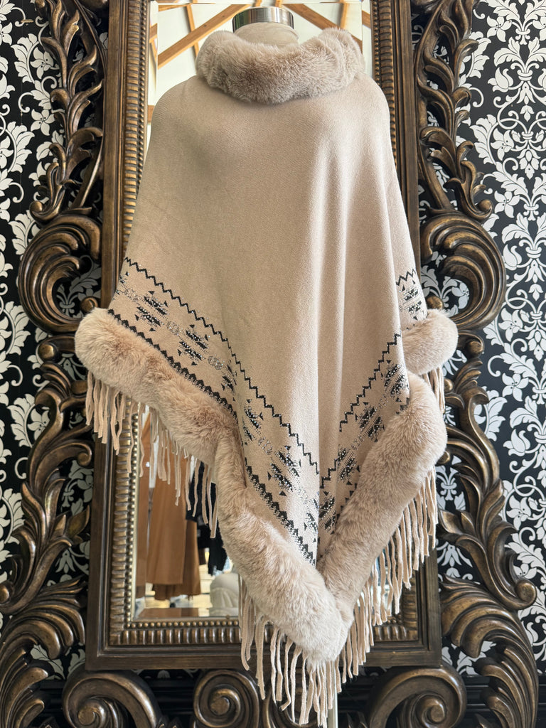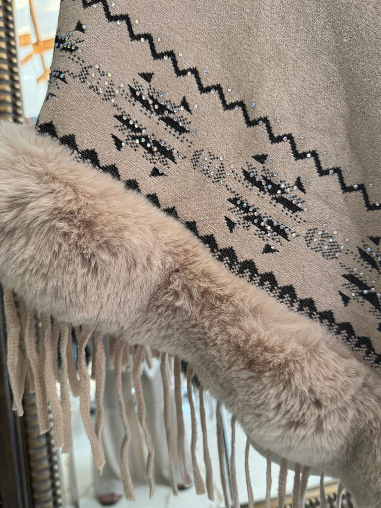 Beautiful fur cape with stones Take a bold step into adventure with our new Fur Stone Cape by Cliche Navaho! This beautiful cape features luxurious fur and stunning stones, perfect for those who love to take risks and stand out in style. Elevate your wardrobe and unleash your inner daring with this must-have piece!