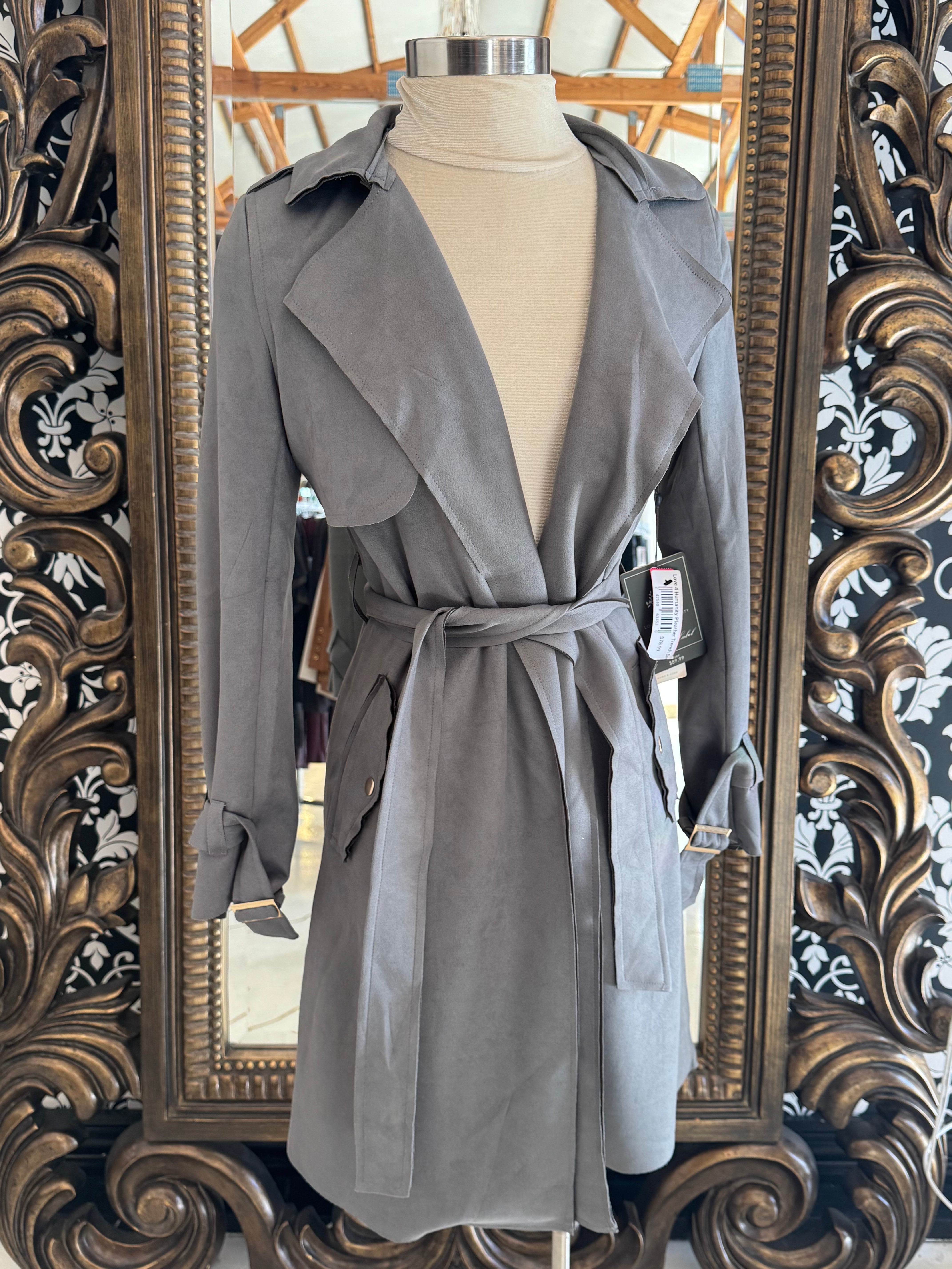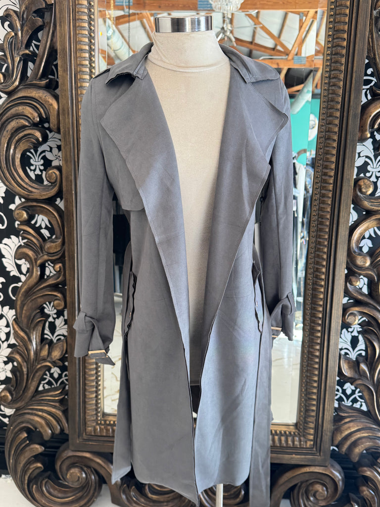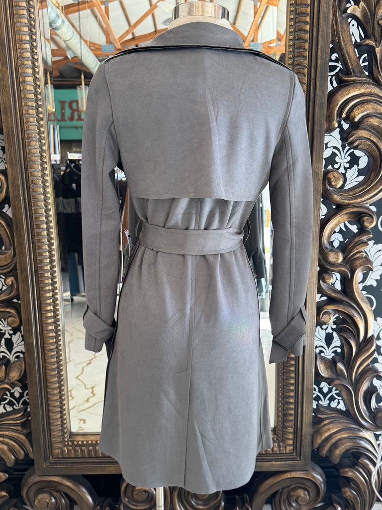 Unleash your inner fashionista with the Pleather Trench by Love Humanity. This gorgeous grey trench coat features a robe styled tie, adding a touch of elegance. Perfect for any occasion, this coat is a must-have in your wardrobe. (Fashion-forward and versatile. Perfect for any occasion.)
