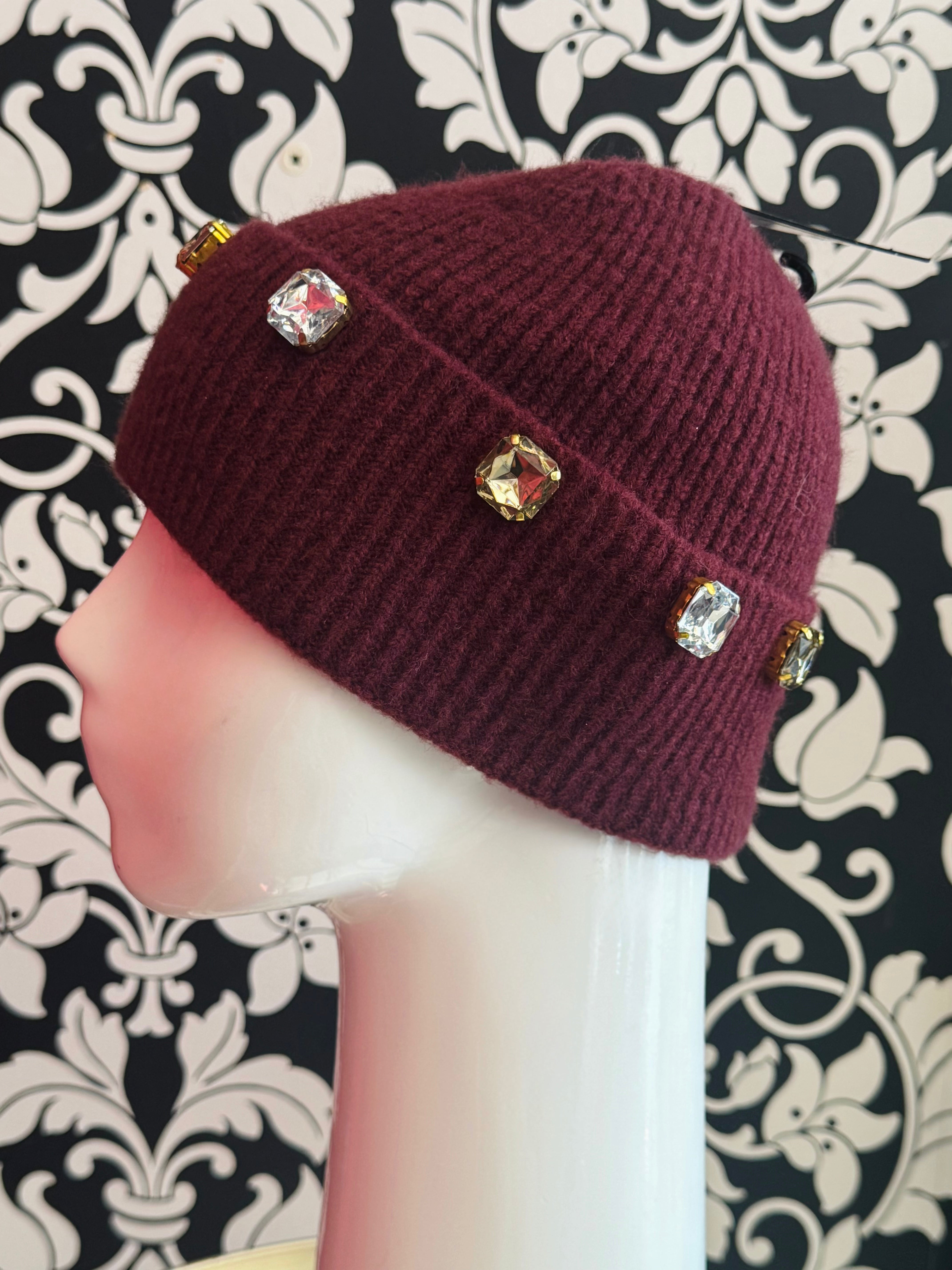 The Stone Beanie by Badgley Mischka features a rich burgundy color adorned with large decorative stones, combining aesthetic appeal with functionality. Its construction ensures warmth and softness, making it suitable for cold weather. This beanie offers both style and comfort, making it a practical accessory for winter wear.