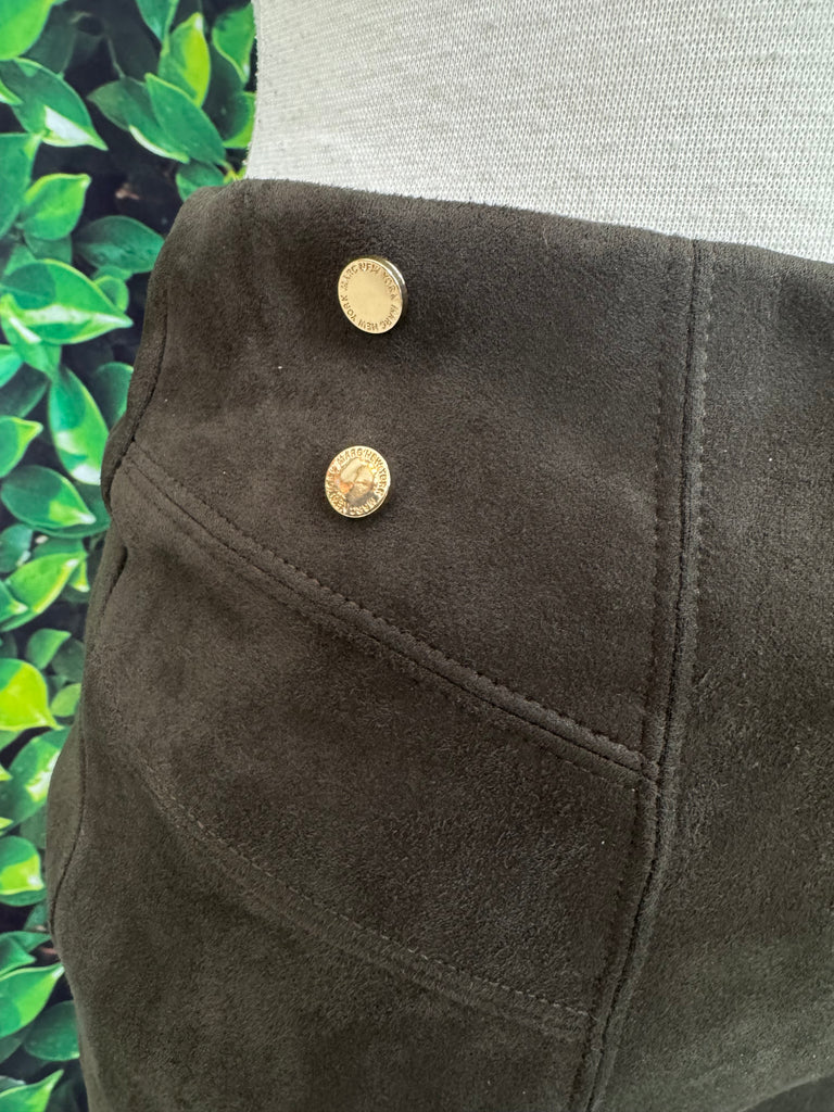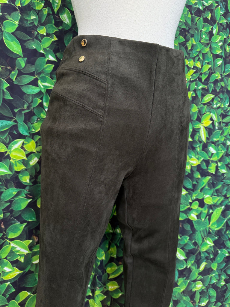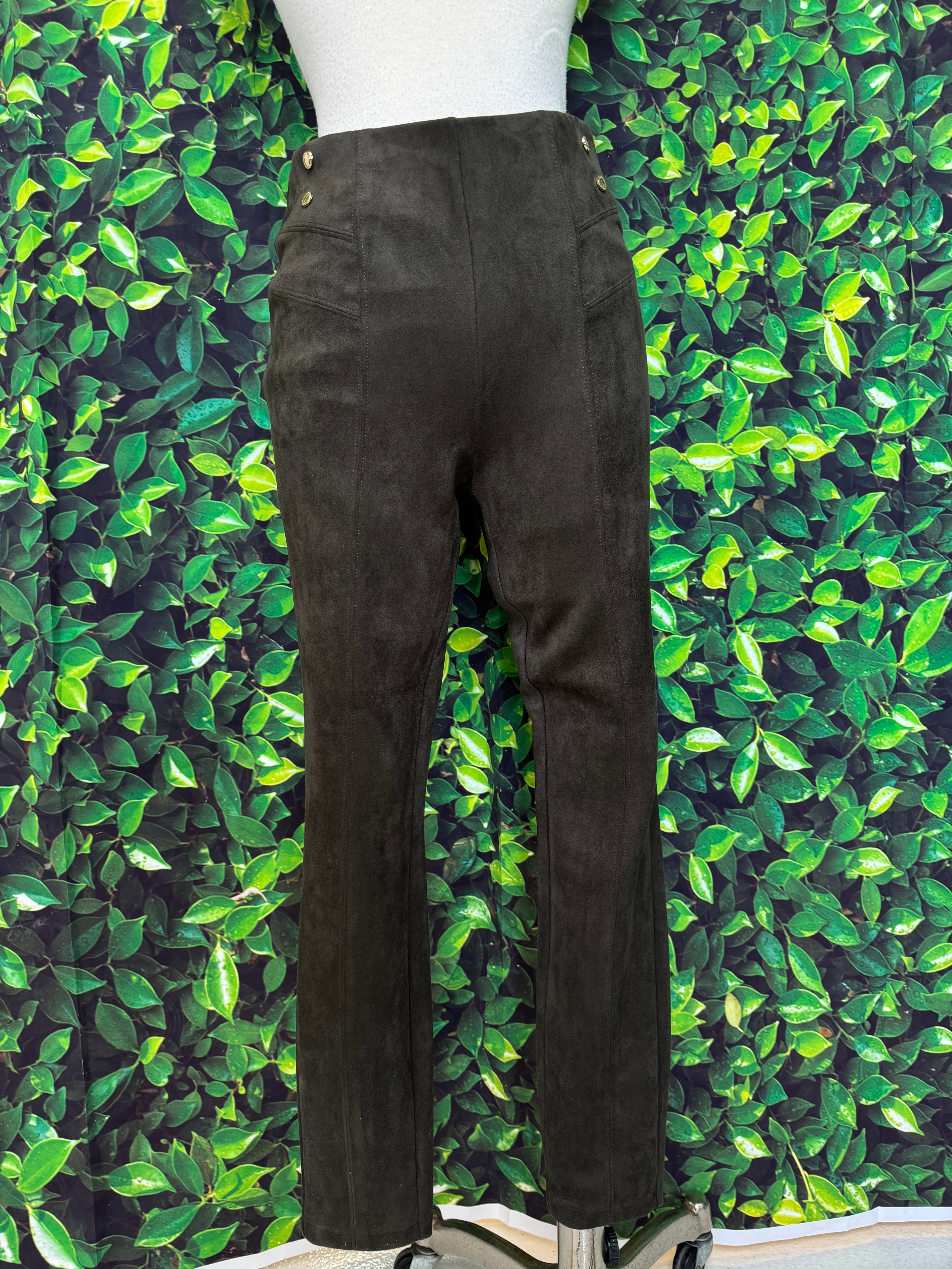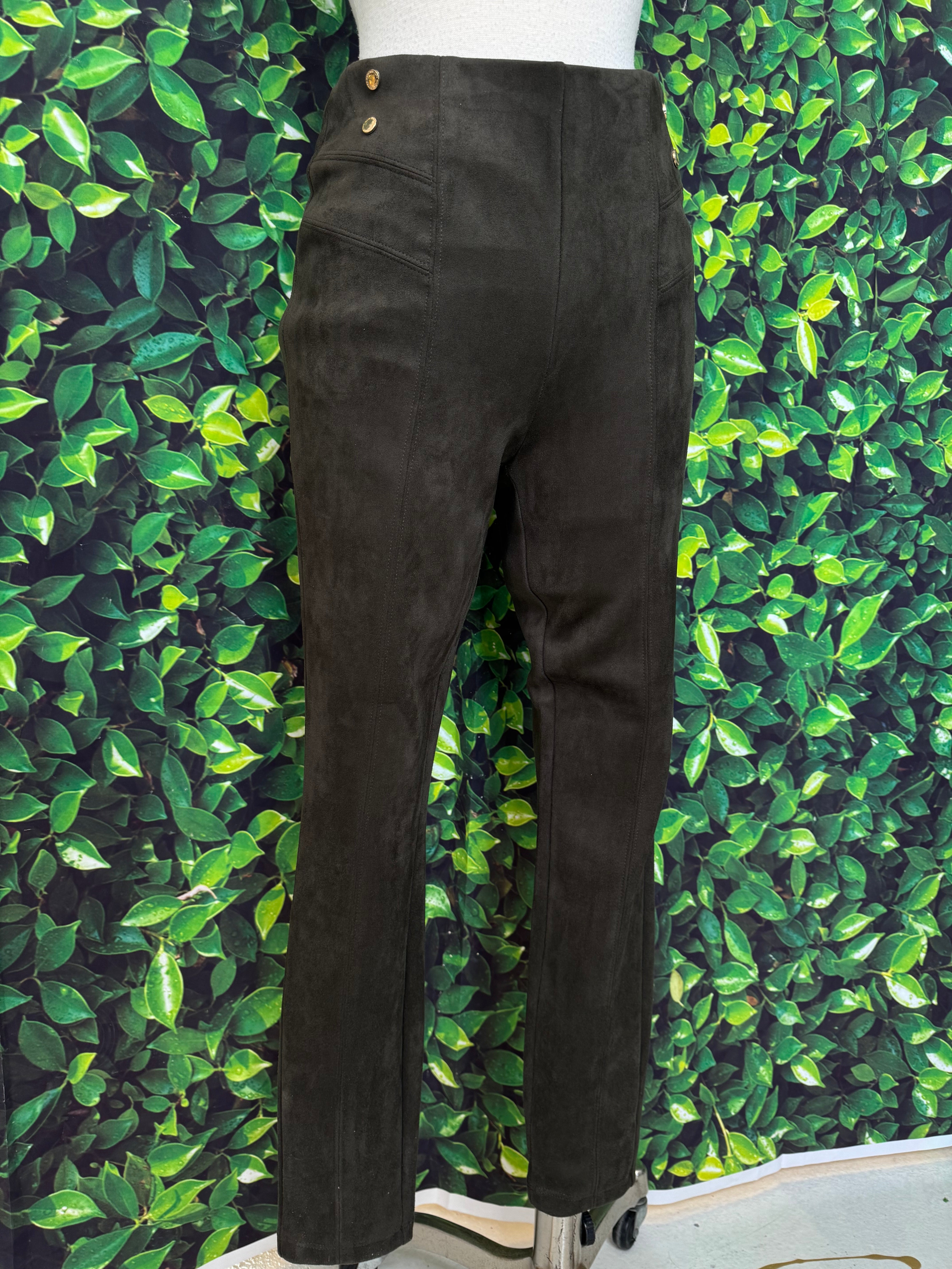 Effortlessly elevate your style with these Olive Green Pleather Pants by Marc NY. Made from high-quality pleather and accented with gold buttons, these pants exude luxury and sophistication. Perfect for any occasion, they are both comfortable and stylish - a must-have addition to any fashion-forward wardrobe.