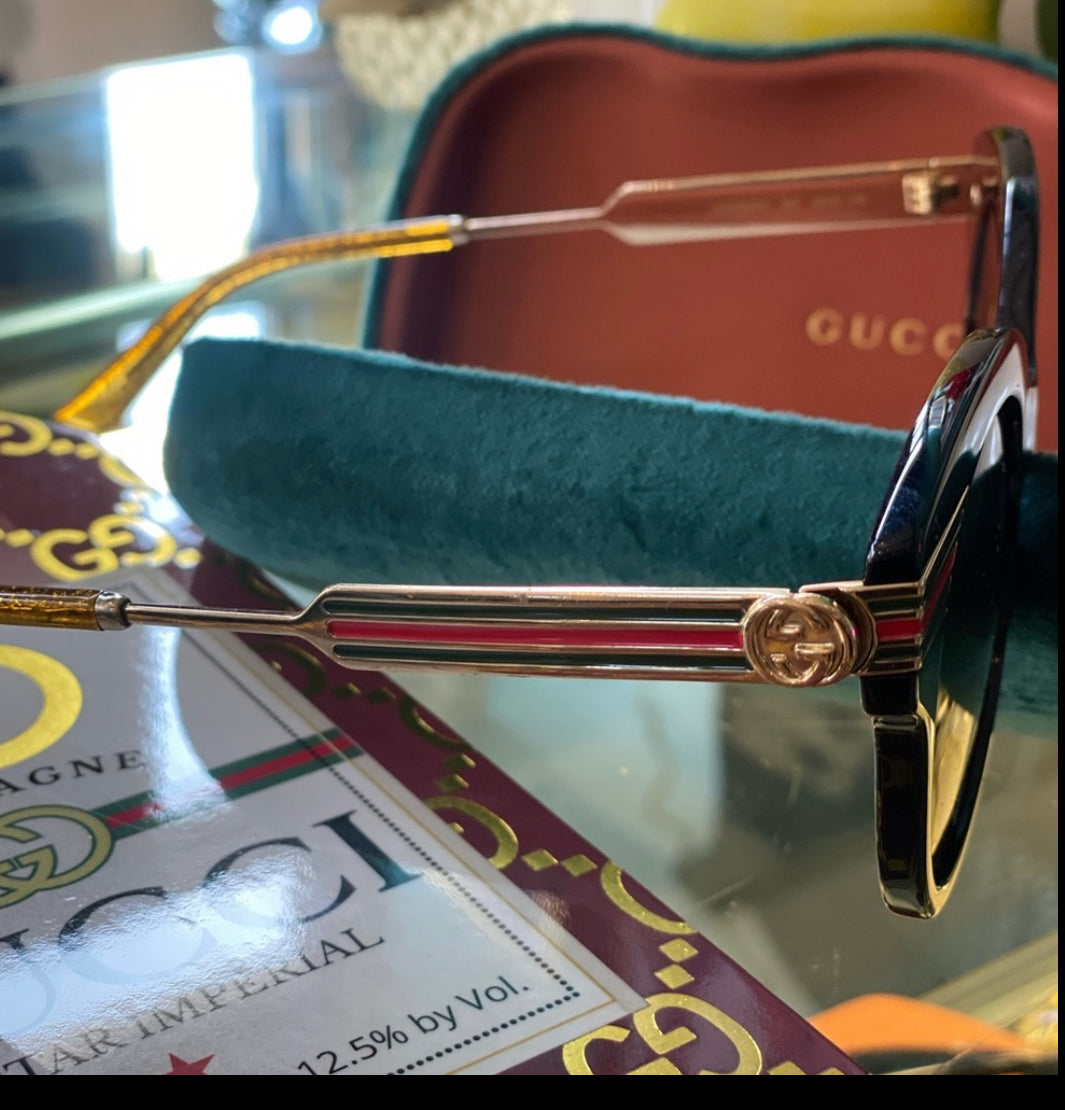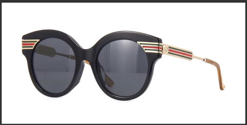 The Classic Gold Frame w/ Gucci striped is a must have and sports the Black Cat Style w/ Front Stripes - Black Lenses w/ Gucci Logo