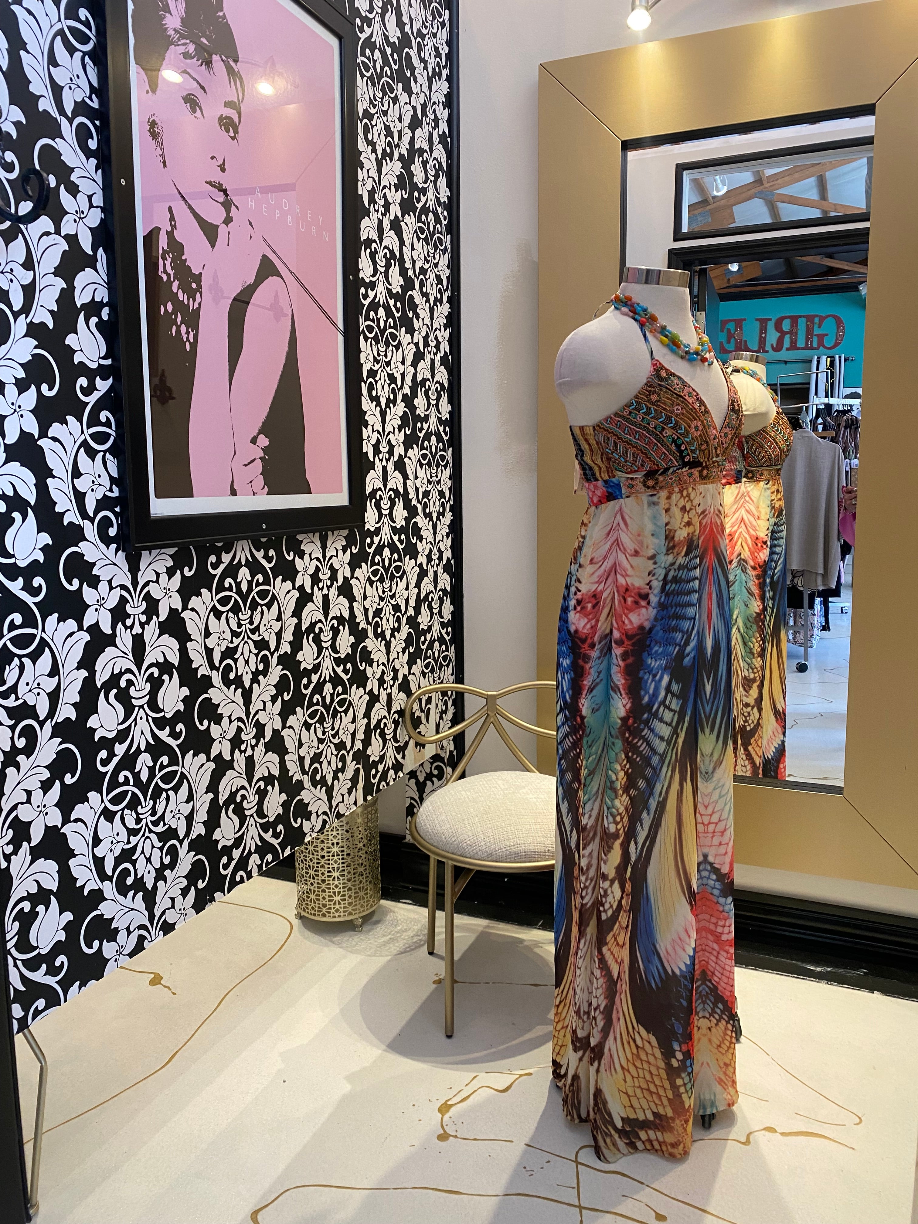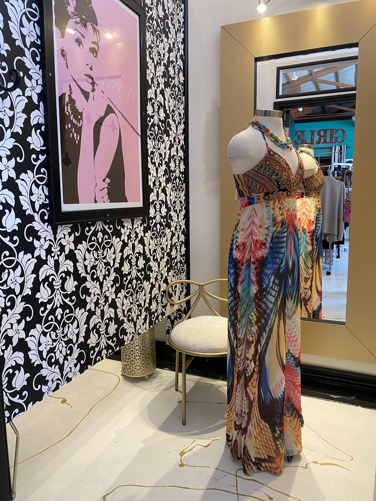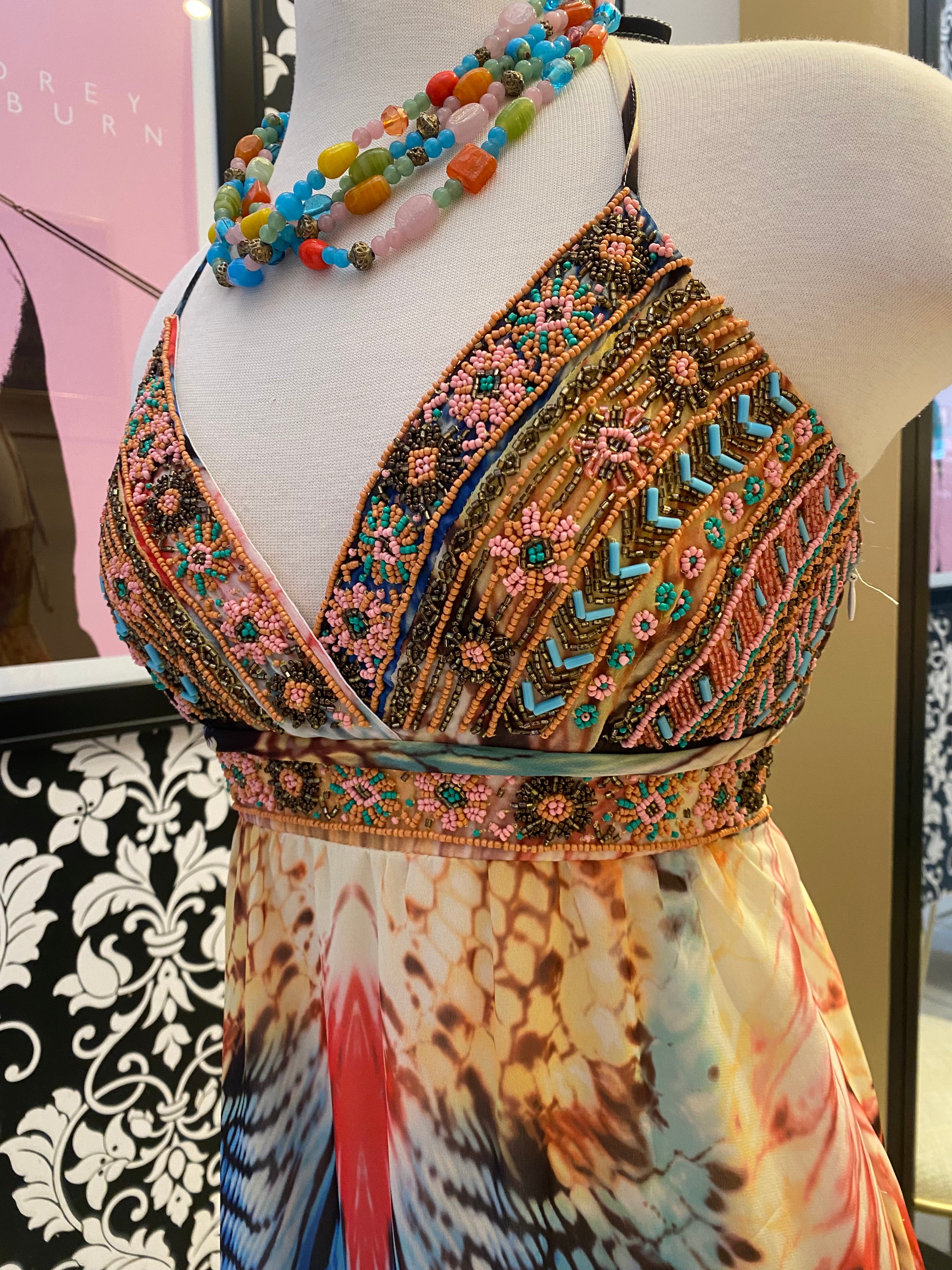 The Wow Factor!! This Beaded print Maxi Dress is Absolutely Beautiful .. Halter Style- Front Bead Design on Bust & High waist Band -Side Zipper& Back Stretch Style w/a Gorgeous Chiffon like Flow - Dress is Lined