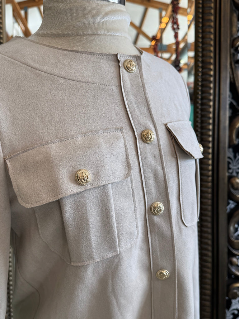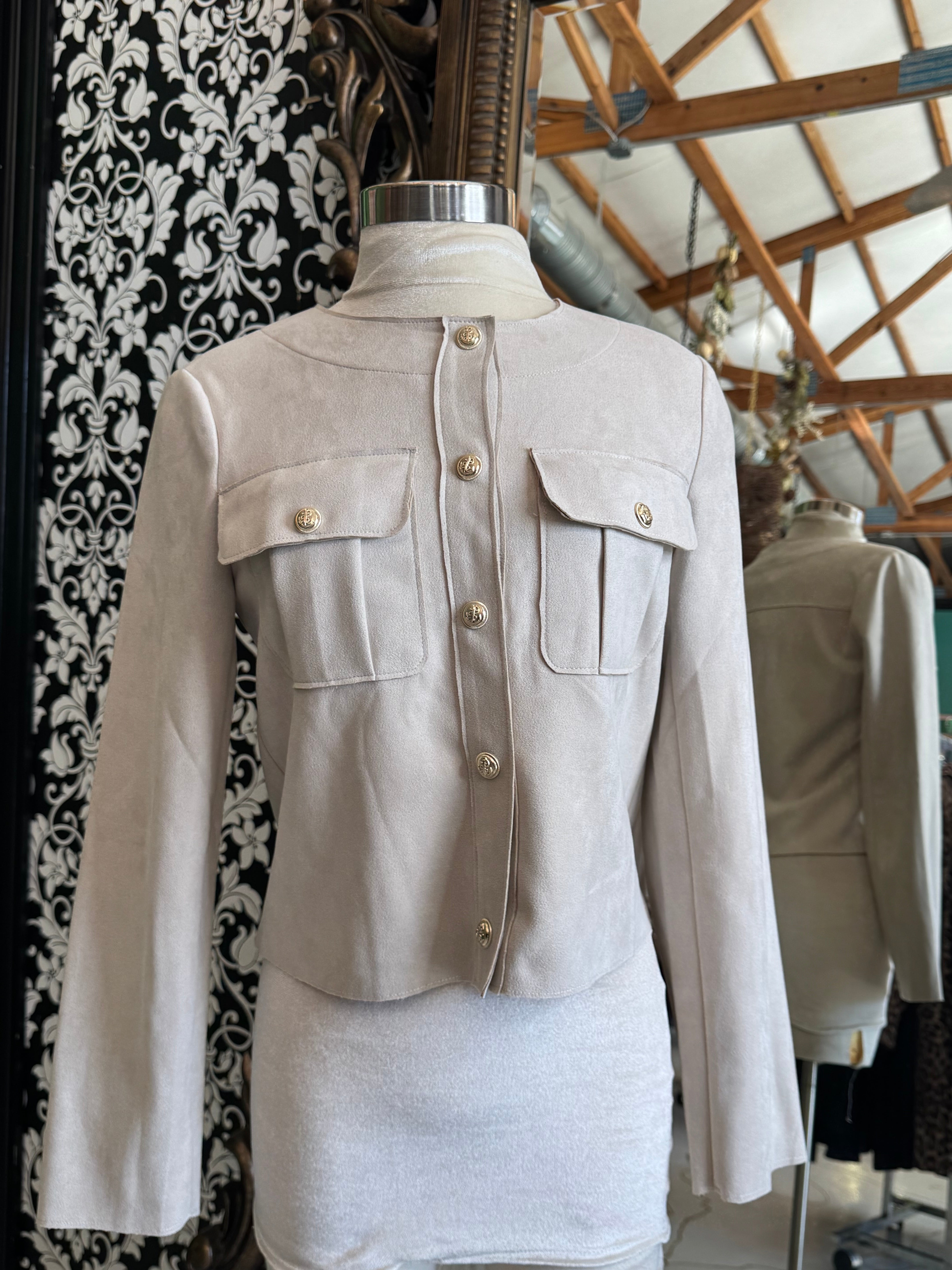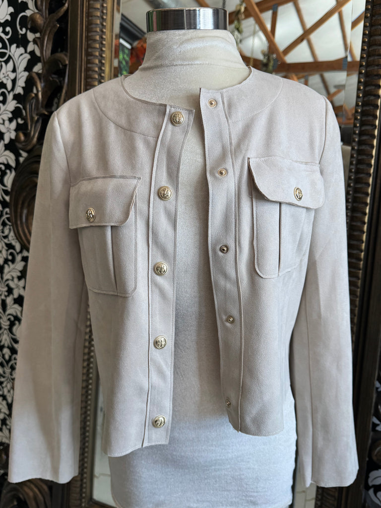 This beige faux jacket by Meg & Margot offers a luxurious suede-like material and elegant gold buttons. With a classic button-up design, this jacket exudes sophistication and style. Stay warm and fashionable this season with this must-have addition to your wardrobe.