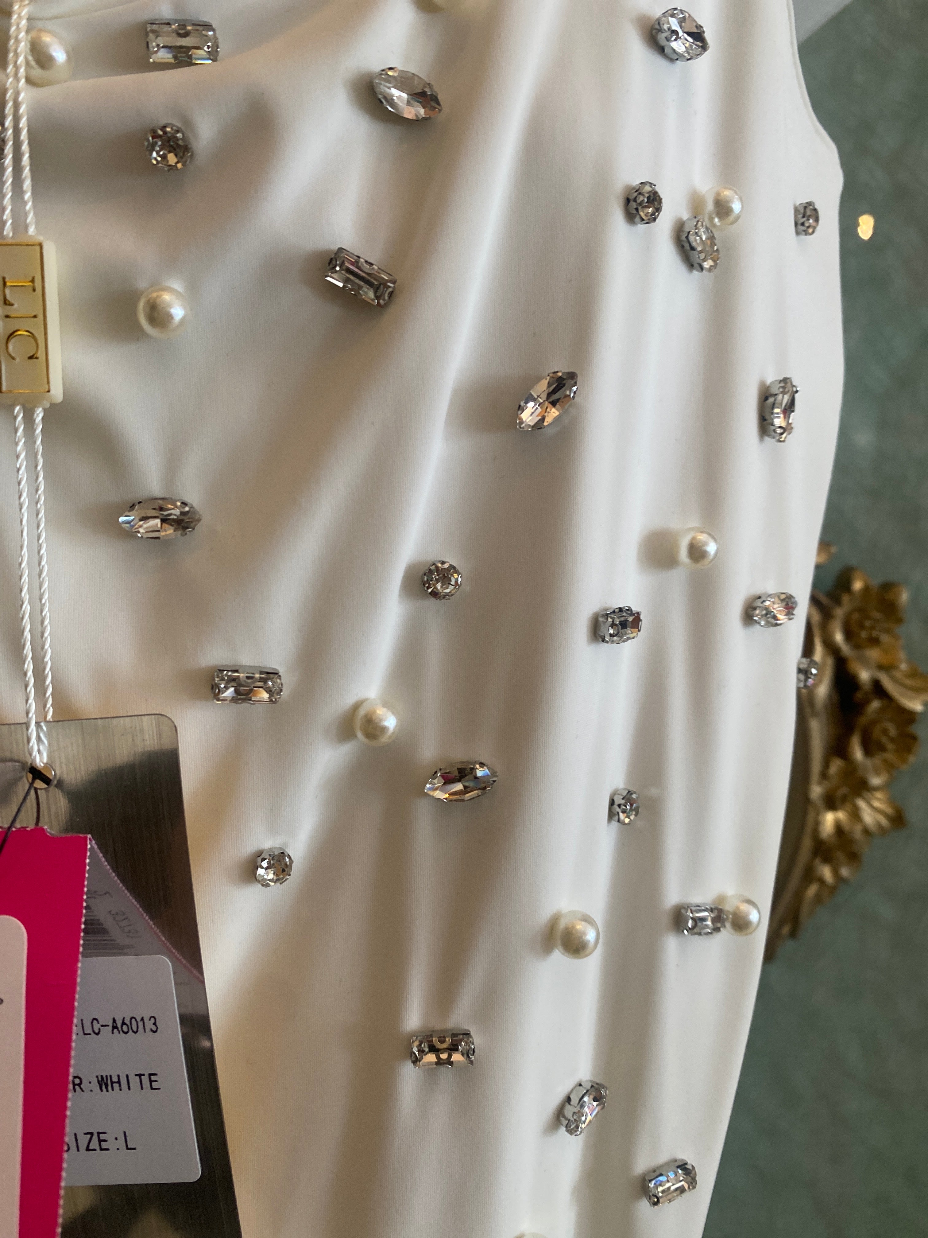 Get ready for a fun night out with the White Stone Pearl Bodysuit by LC. This unique bodysuit features playful pearl and stone accents that will make you stand out from the crowd. So go ahead and add a touch of whimsy to your wardrobe with this stylish and quirky piece.